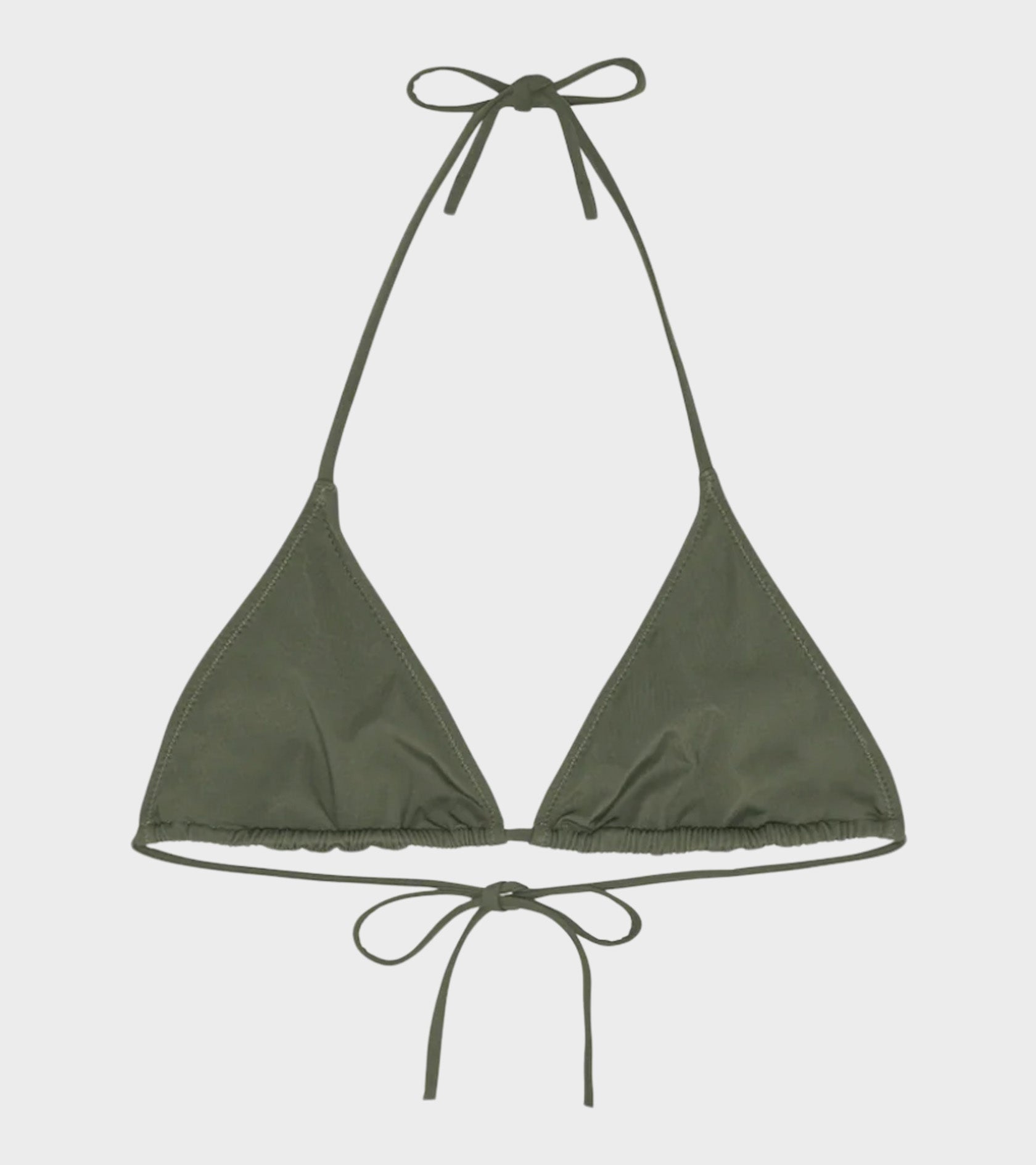Army green triangle bikini top from Alipo. This bikini top is made from a mix of recycled nylon and elastane. The top has classic straps, but can also be tied at the neck. It is produced in Portugal and comes with a dust bag.