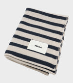 Striped lambswool blanket from Tekla. Lambswool Blanket Magpie Stripes measures 130 x 180 cm and has stripes in dark navy and off-white. In one corner is a white logo tag. Dustbag included.