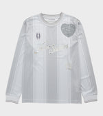Striped football-inspired long-sleeved top from Acne Studios. The top is made from a lightweight recycled polyester quality and features a round neck, striped ribbed cuffs and logos on both the front and back.