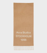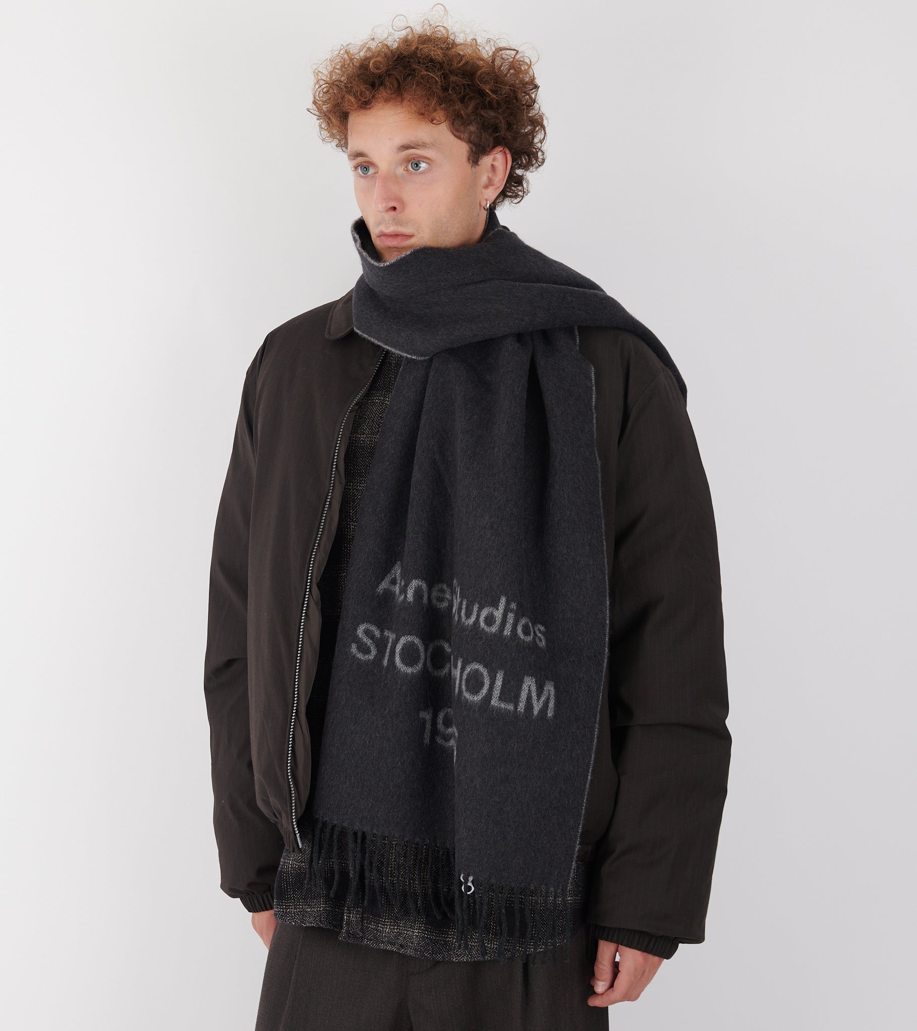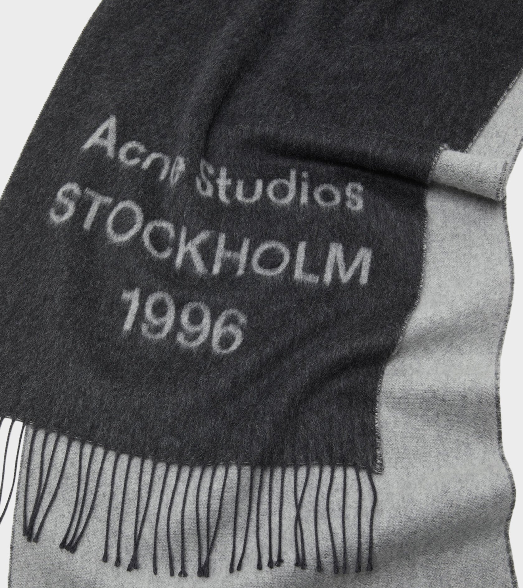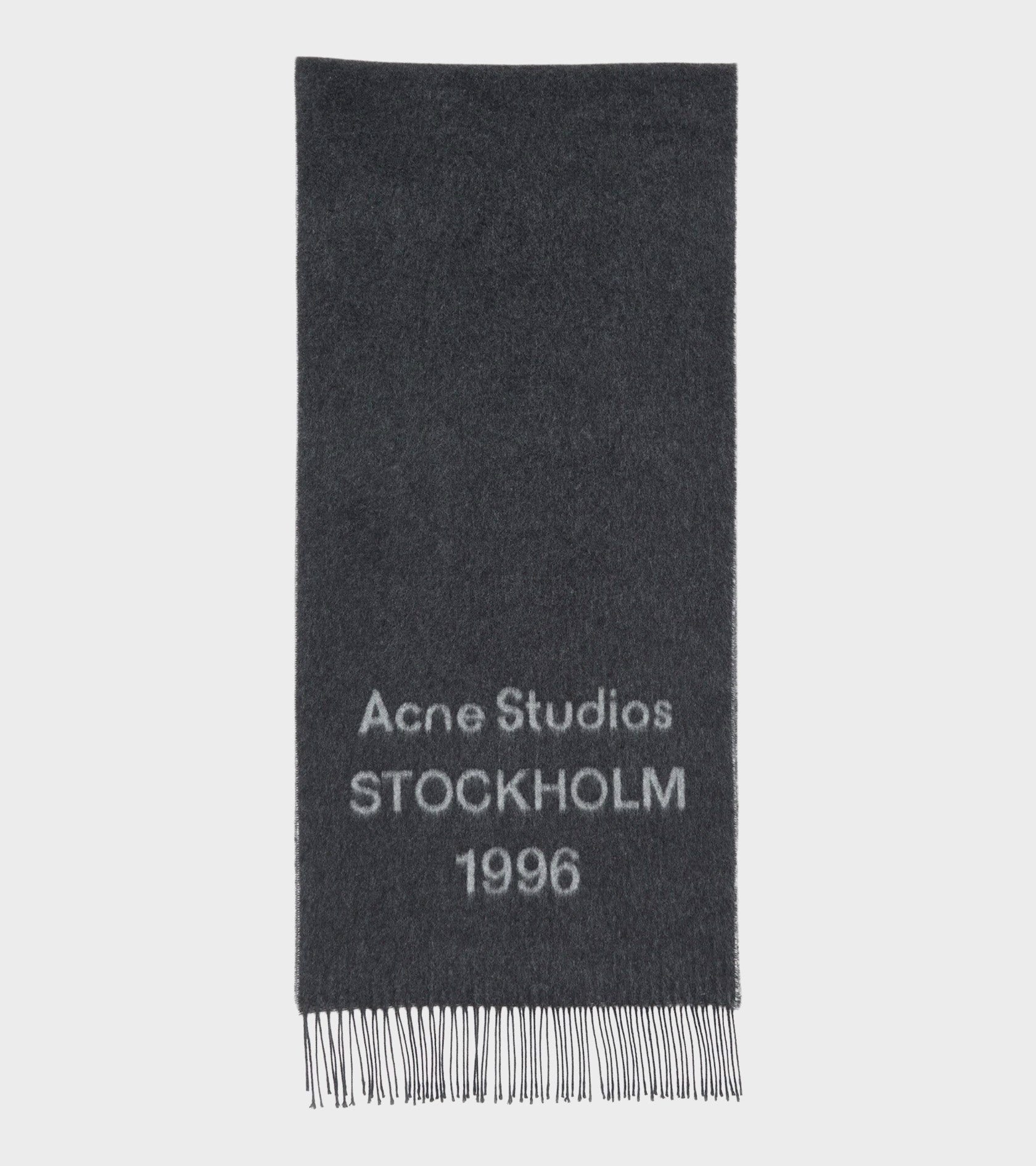 Wool scarf from Acne Studios. The scarf has a logo writing as well as fringes at the ends.