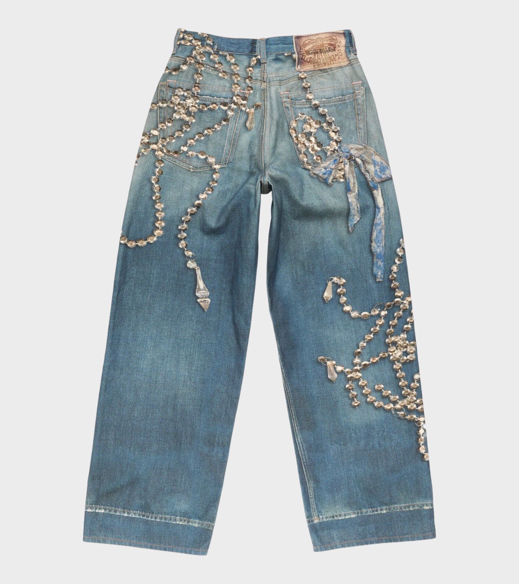 Blue jeans with all-over 'trompe-l'oeil' print with crystals and bows from Acne Studios.