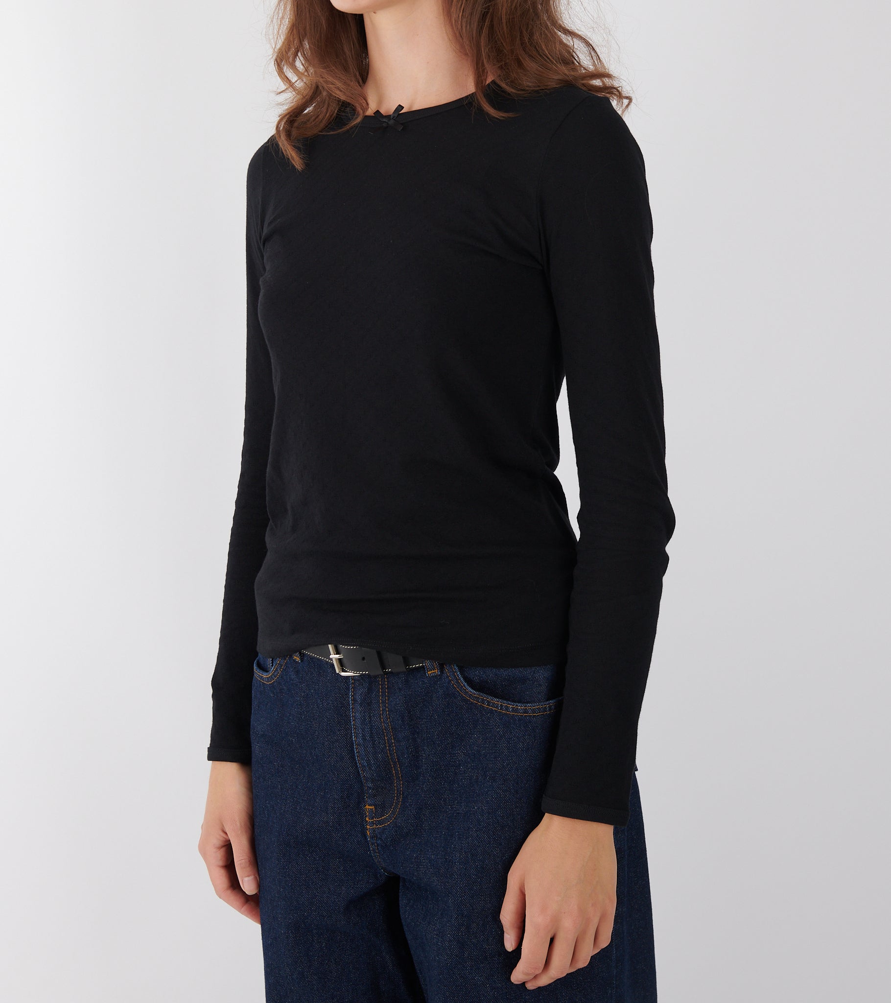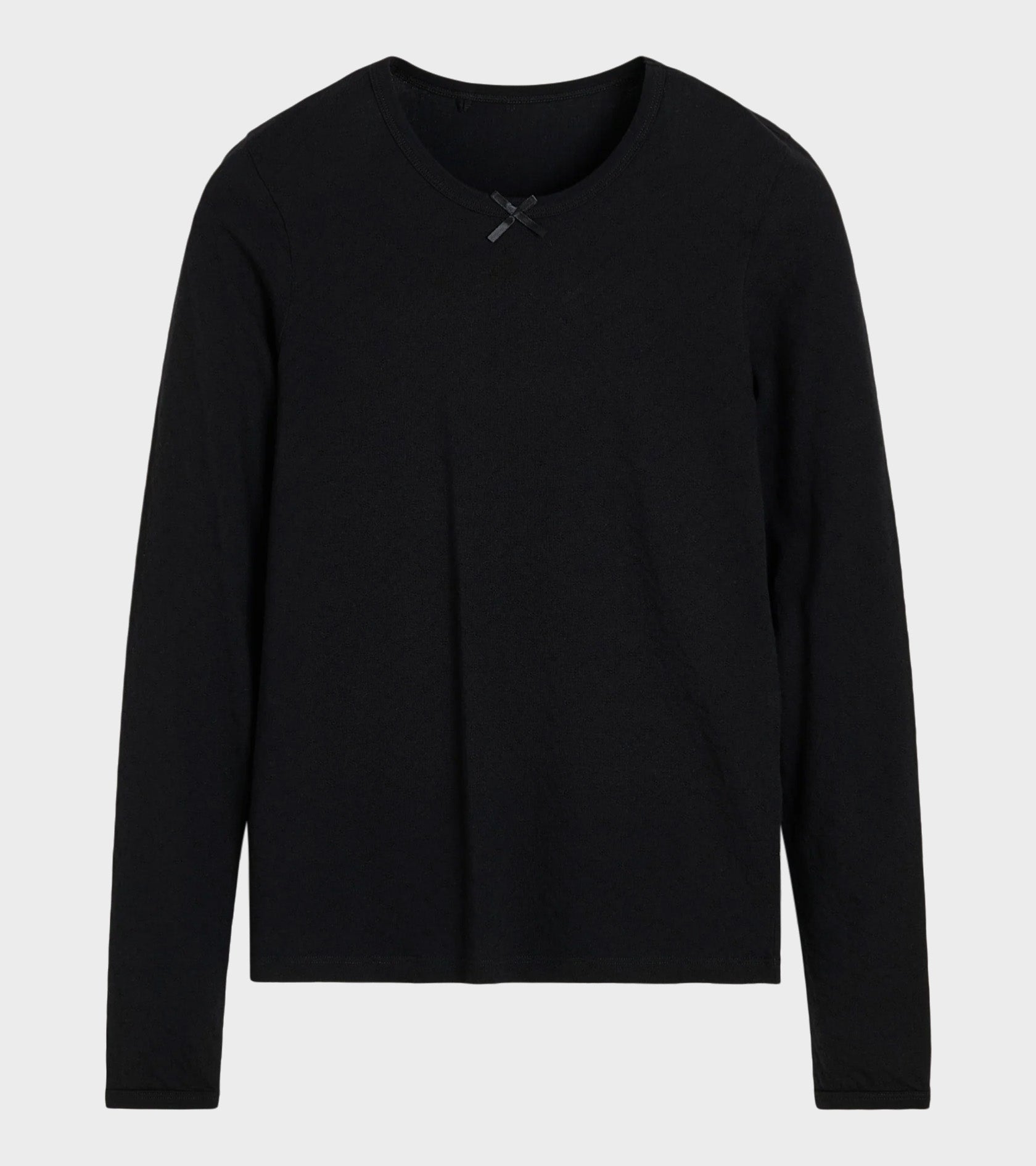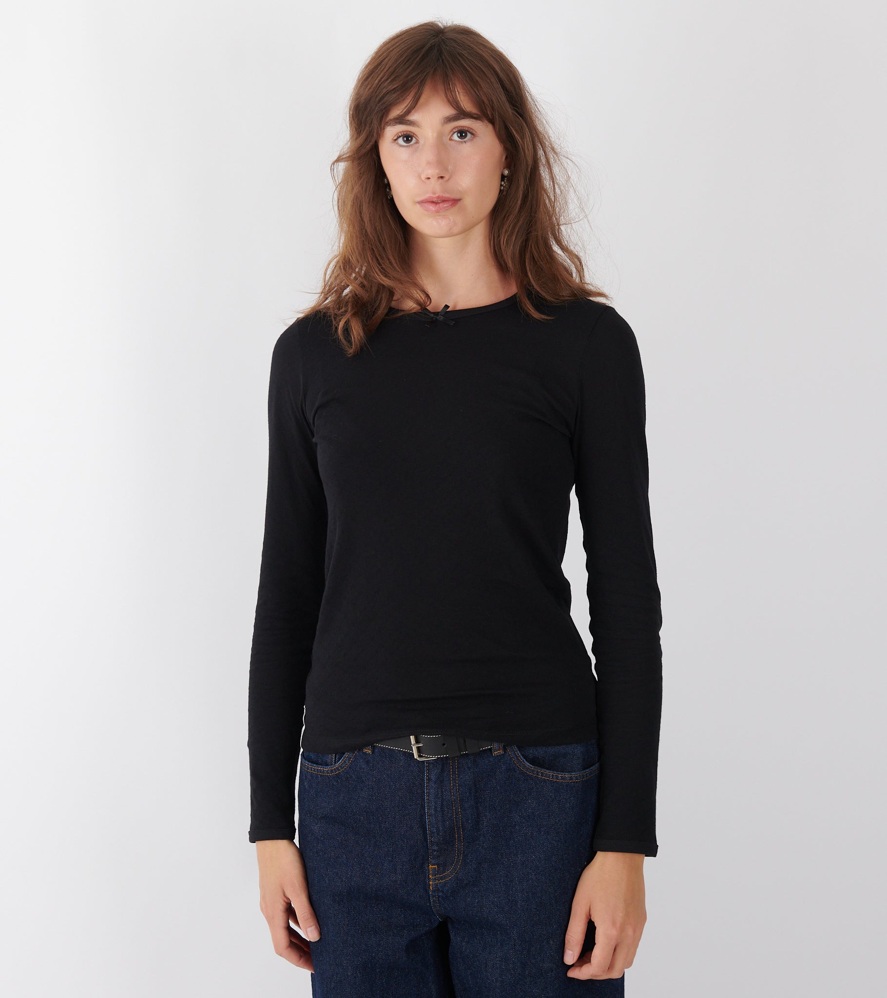 Black long sleeve blouse from Aiayu. Messhu Long Sleeve is made from an organic cotton jersey quality with a light texture. It has ribbed edges, a round neck and a bow detail on the front.