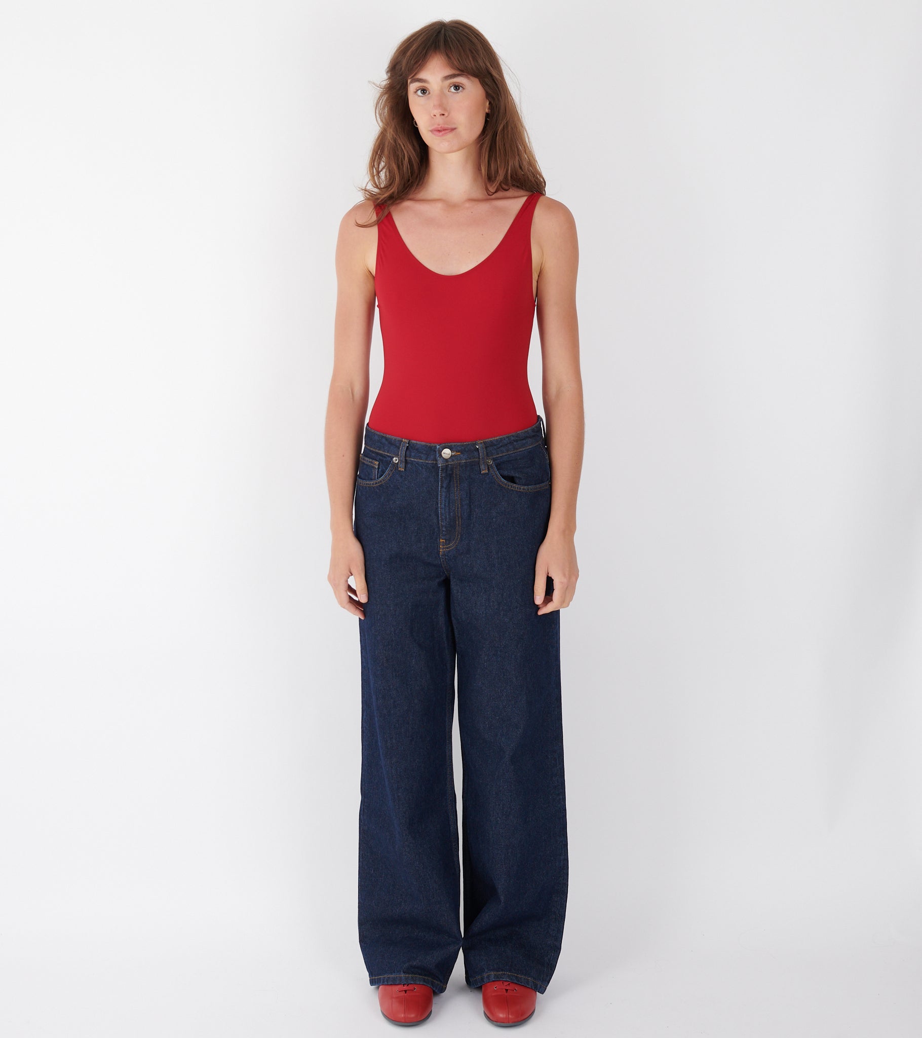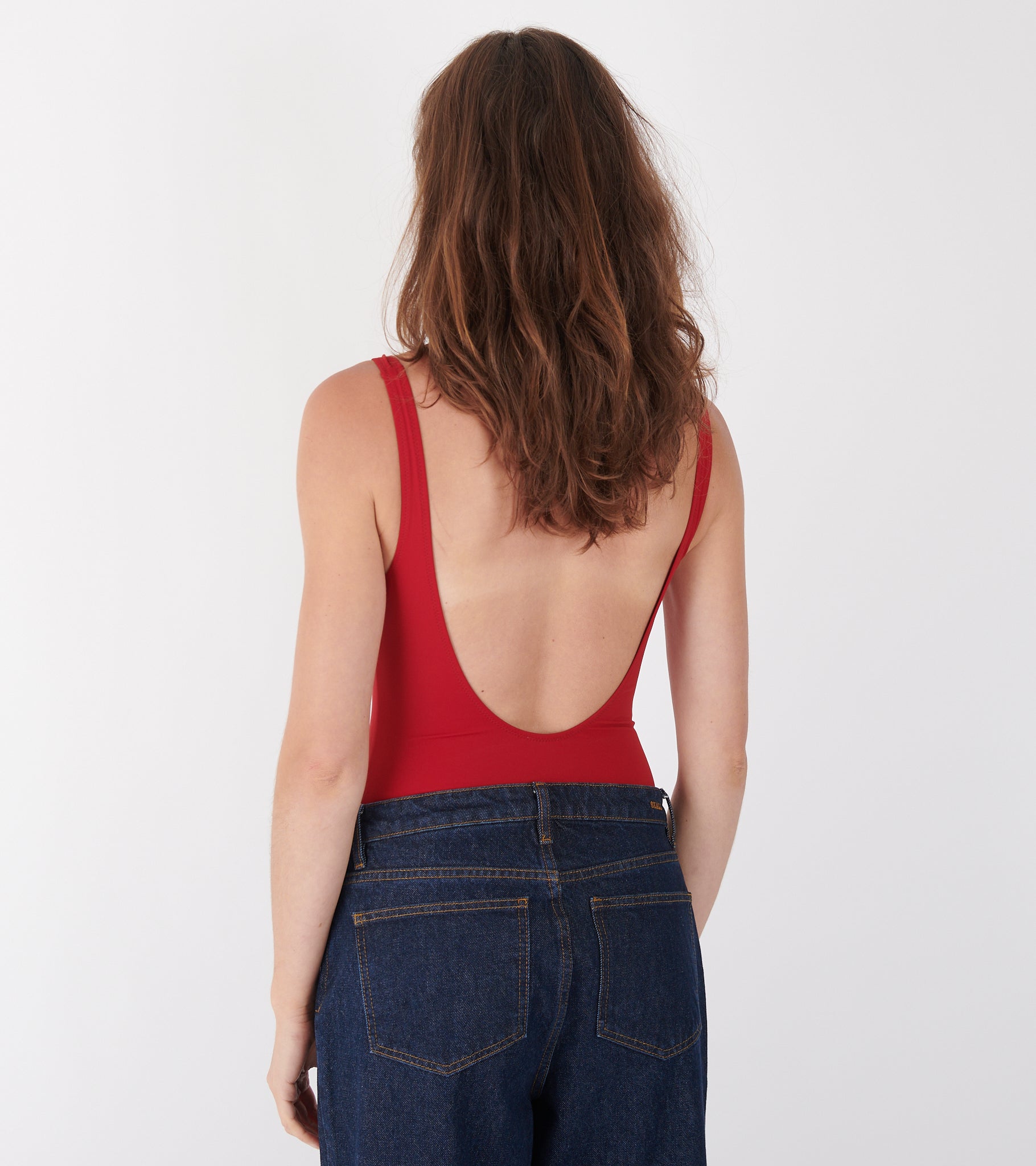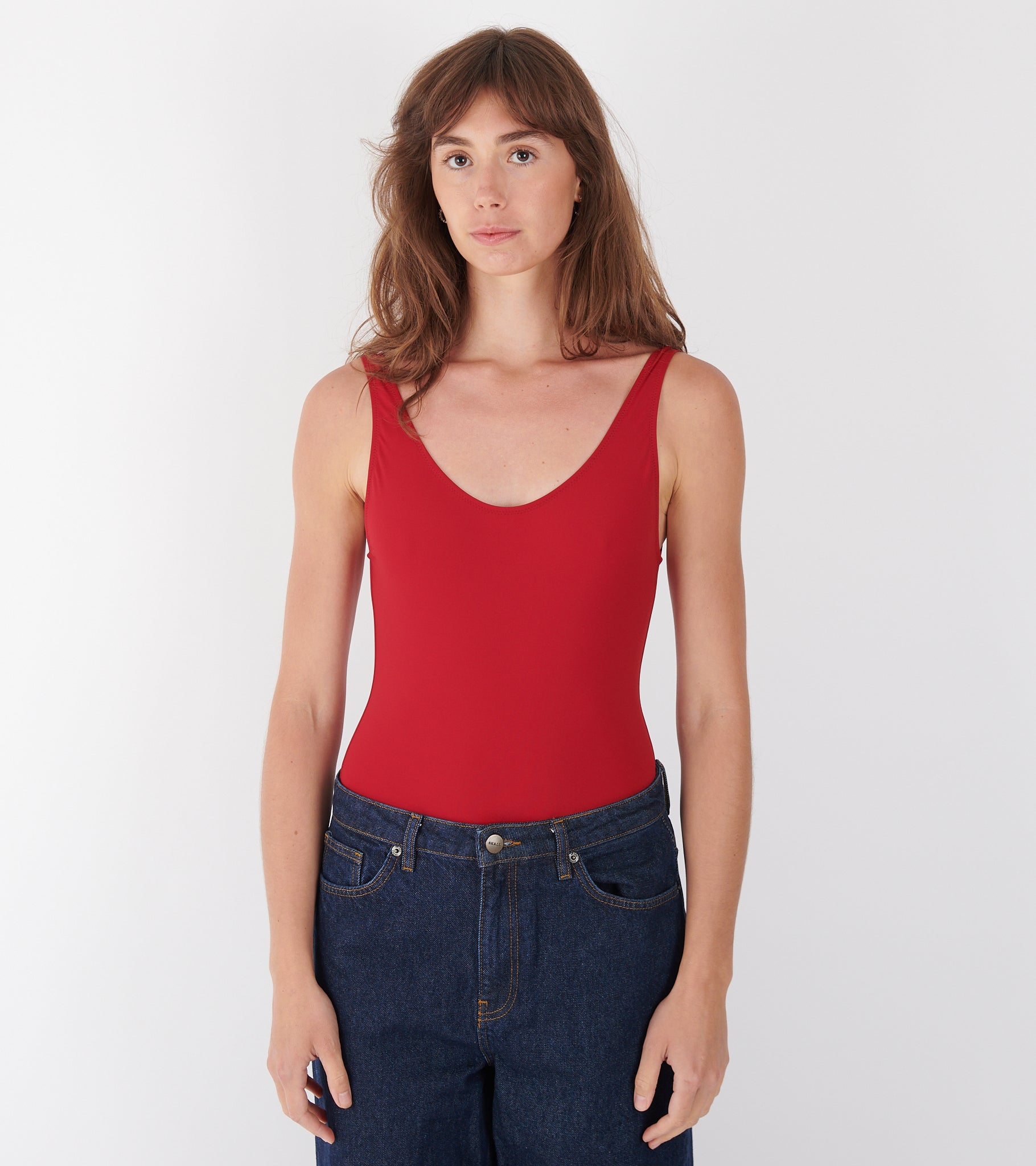 Red swimsuit from Alipo. The swimsuit has a deep round neckline at the back.