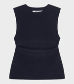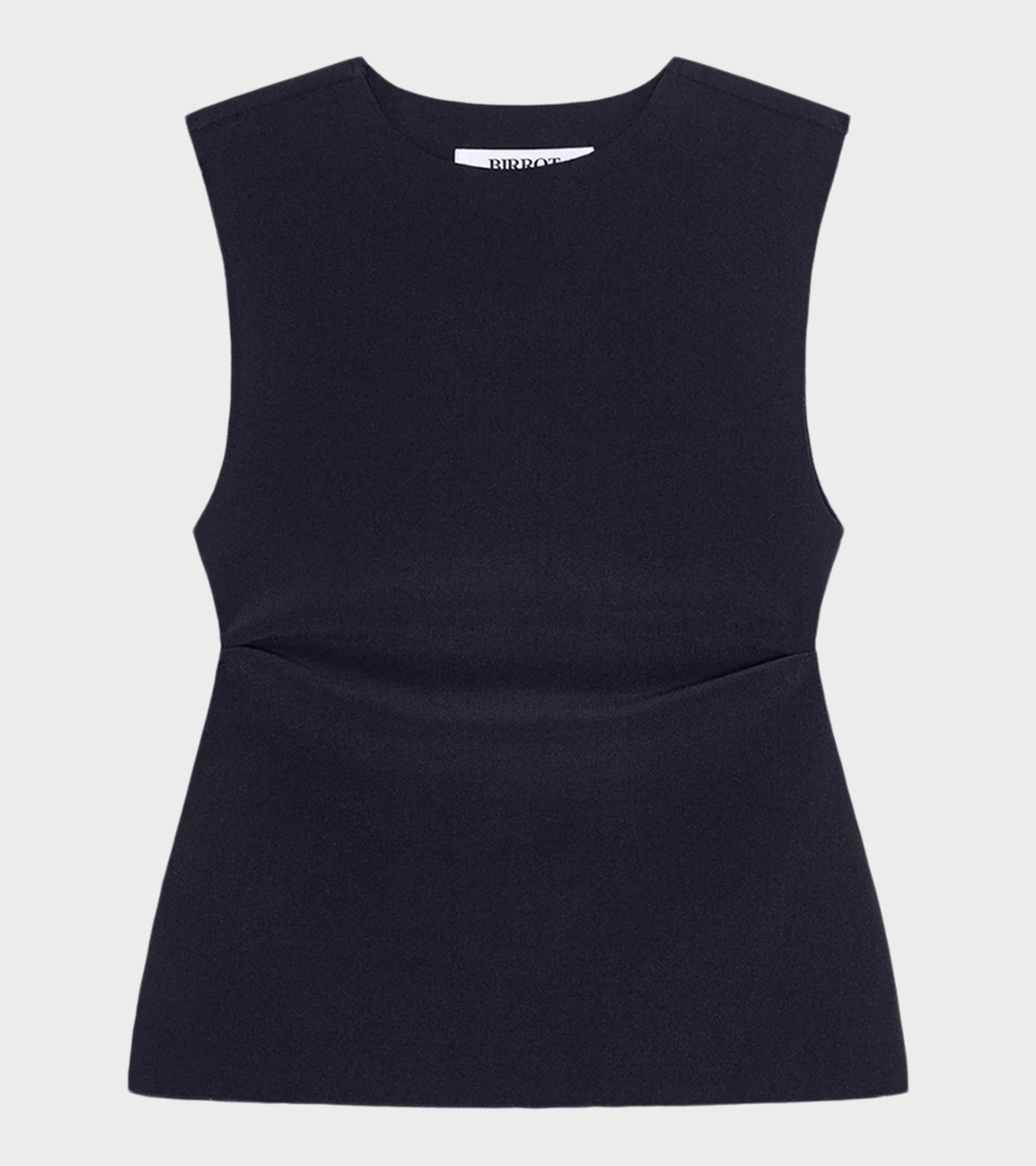 Top in navy/black from Birrot. The top has a classic smooth look, but as in the picture, it can be pulled up to give it a draping look.