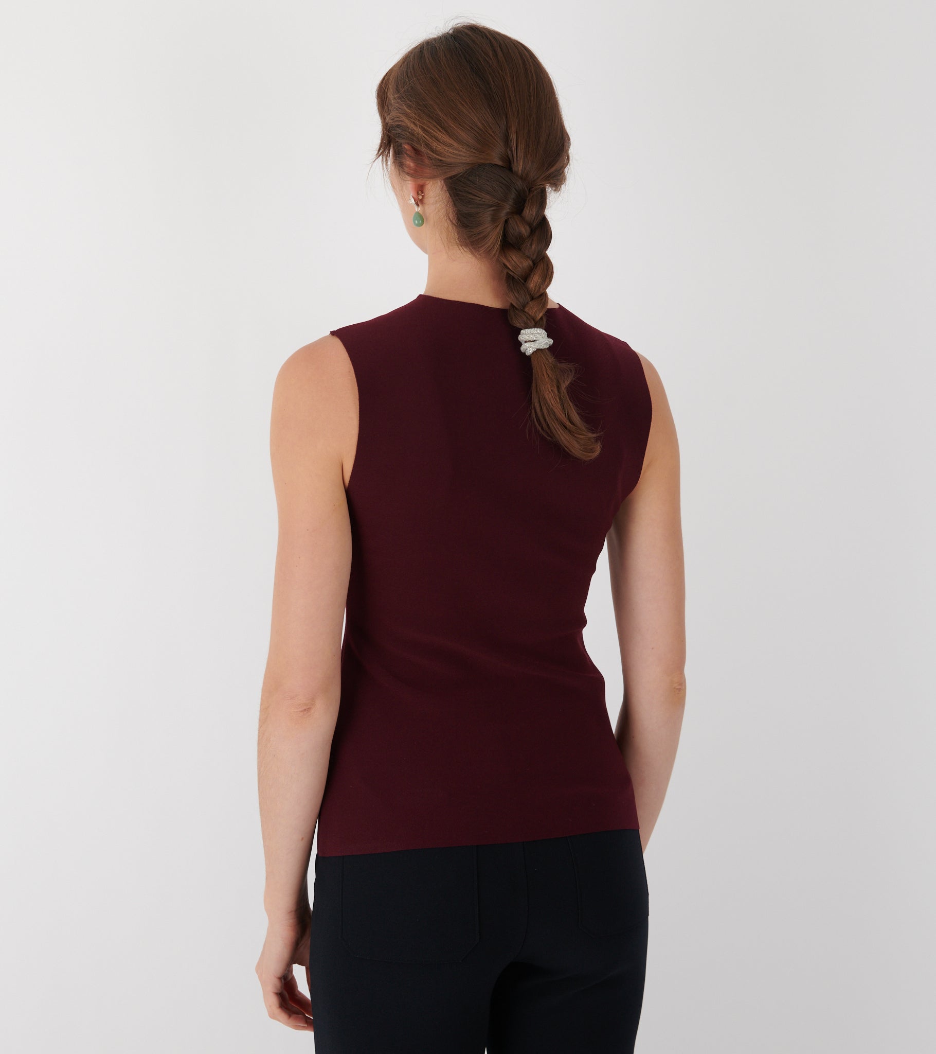 Top in a deep red/bordeaux color from Birrot. The top has a classic smooth look, but as in the picture, it can be pulled up to give it a draping look.