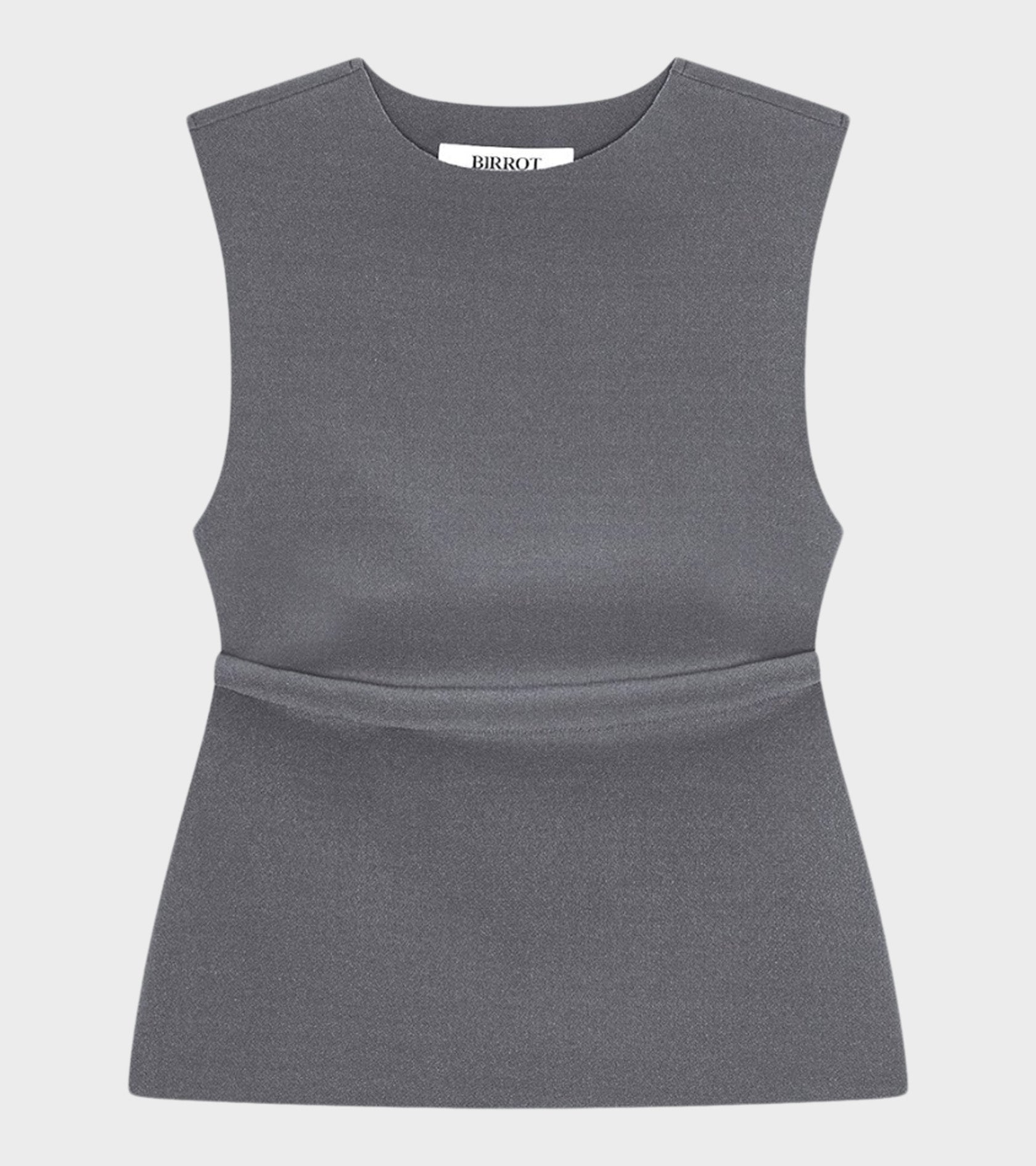 Top in grey from Birrot. The top has a classic smooth look, but as in the picture, it can be pulled up to give it a draping look.
