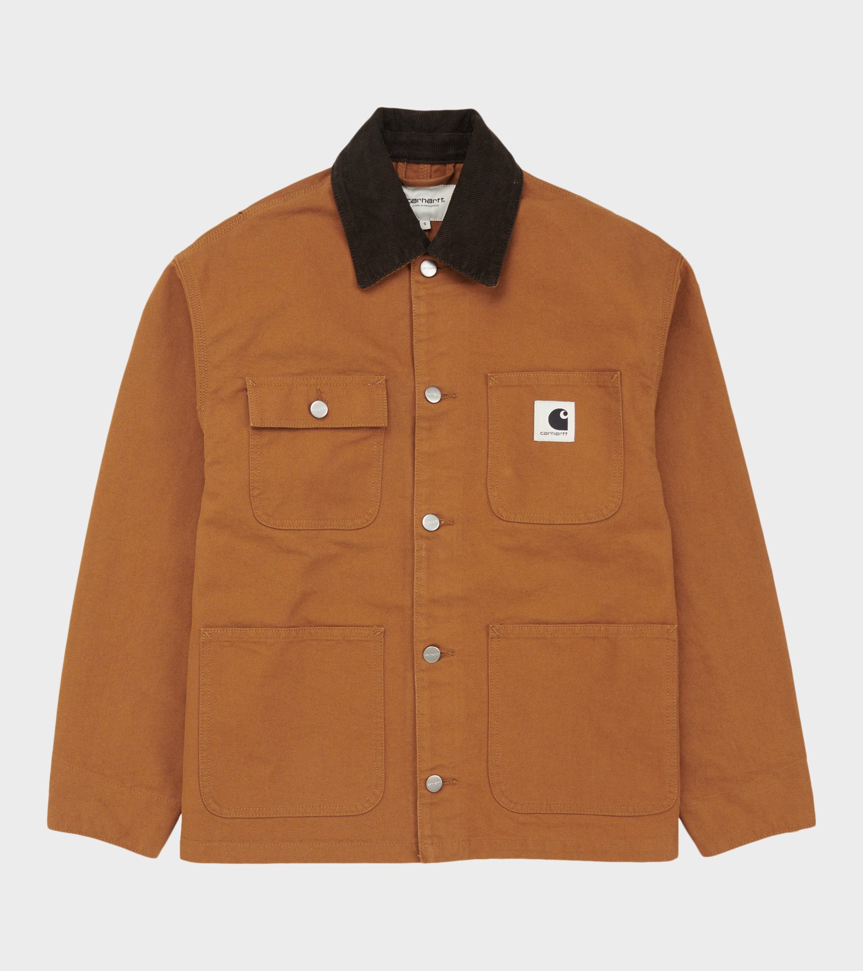 Brown workwear inspired jacket from Carhartt WIP. The jacket has four pockets, a button closure and the iconic logo at the left chest pocket.