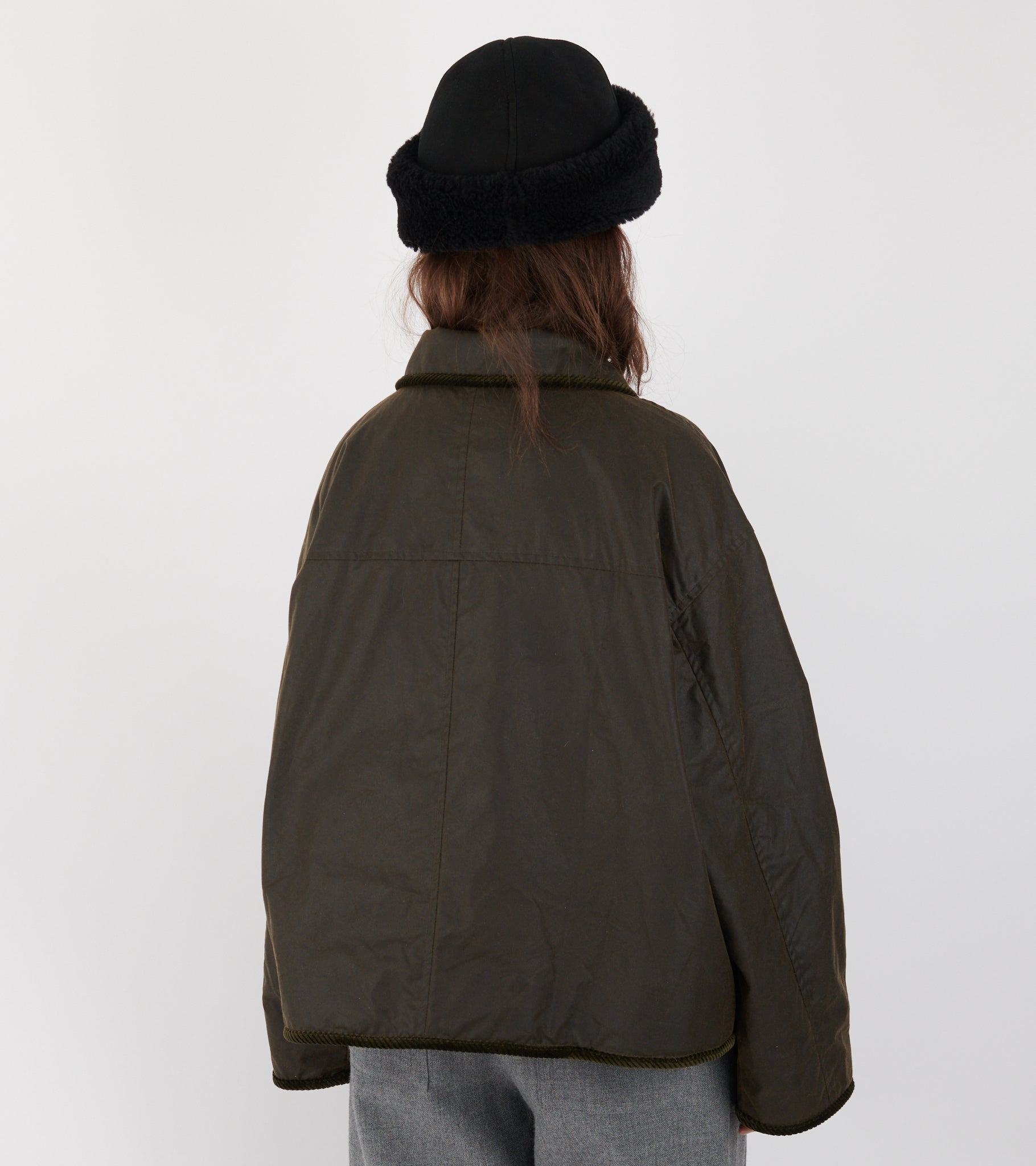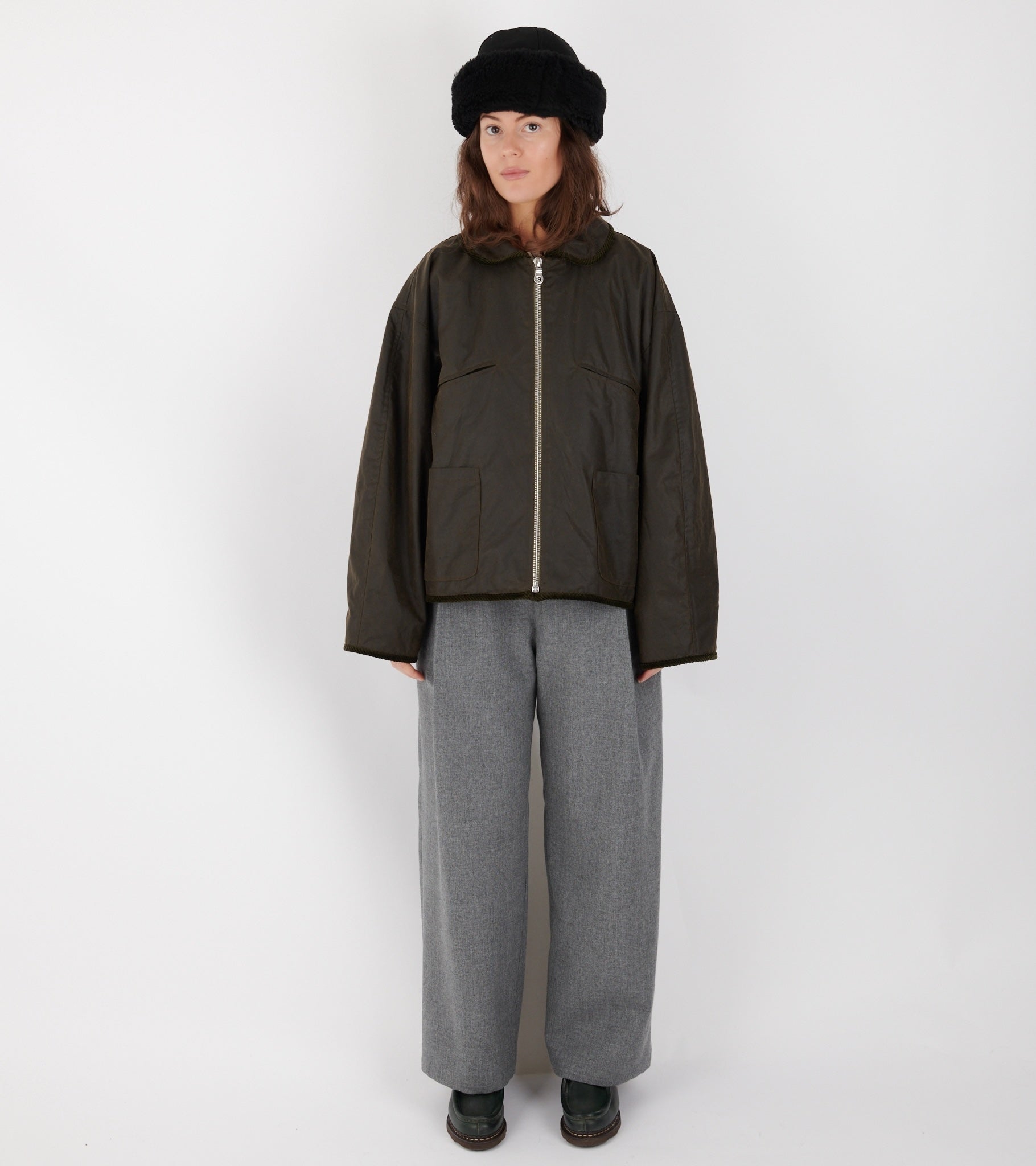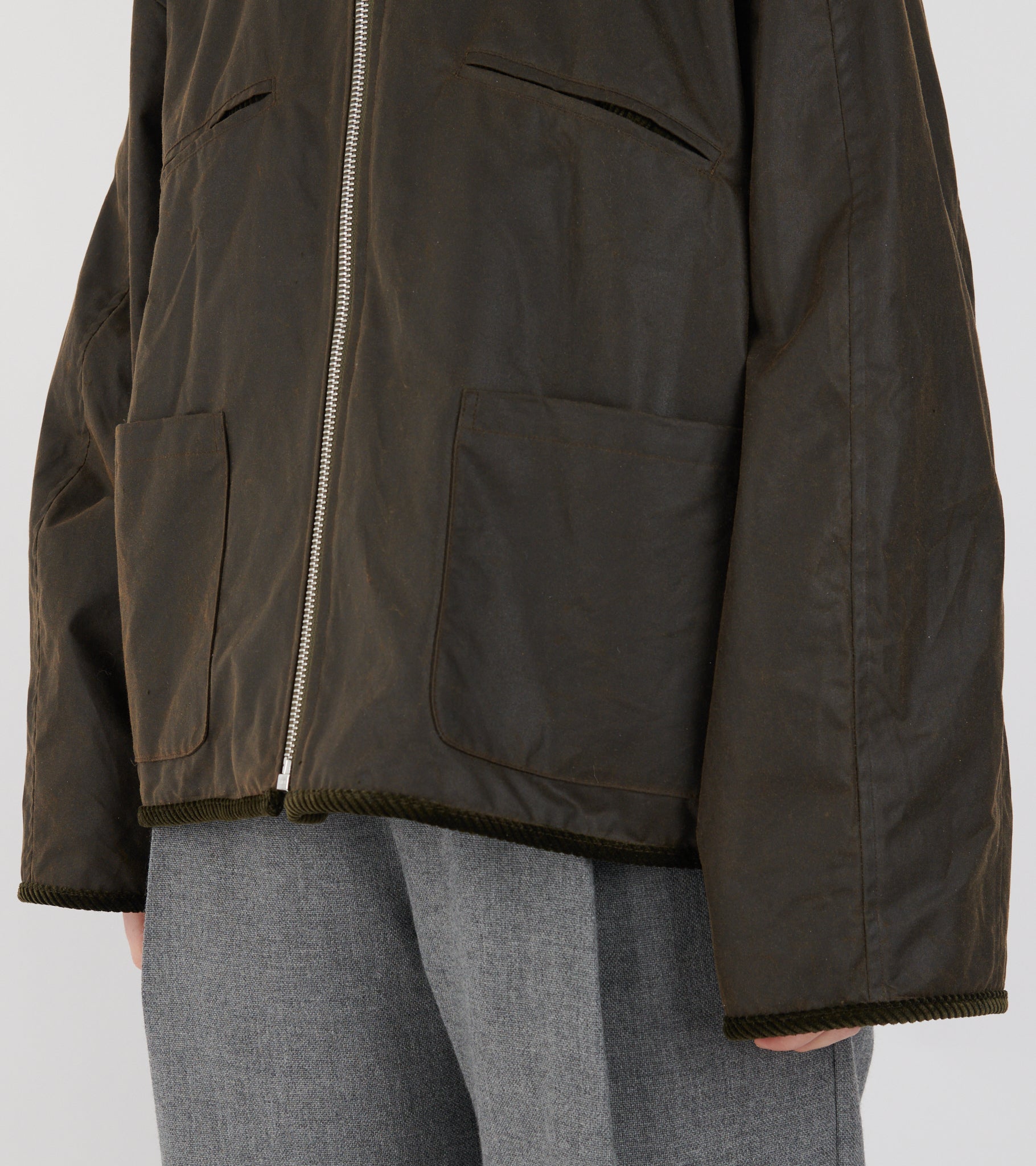 Olive green oilskin jacket from Cawley. The jacket has a round collar, a silver zip closure and four pockets on the front. Along the edges is cotton corduroy.