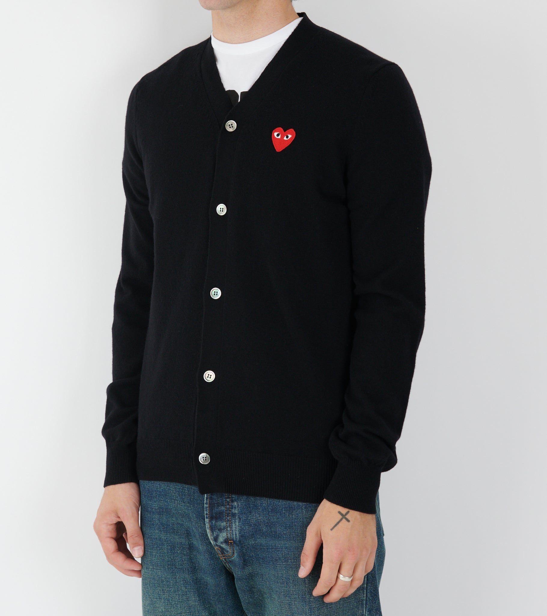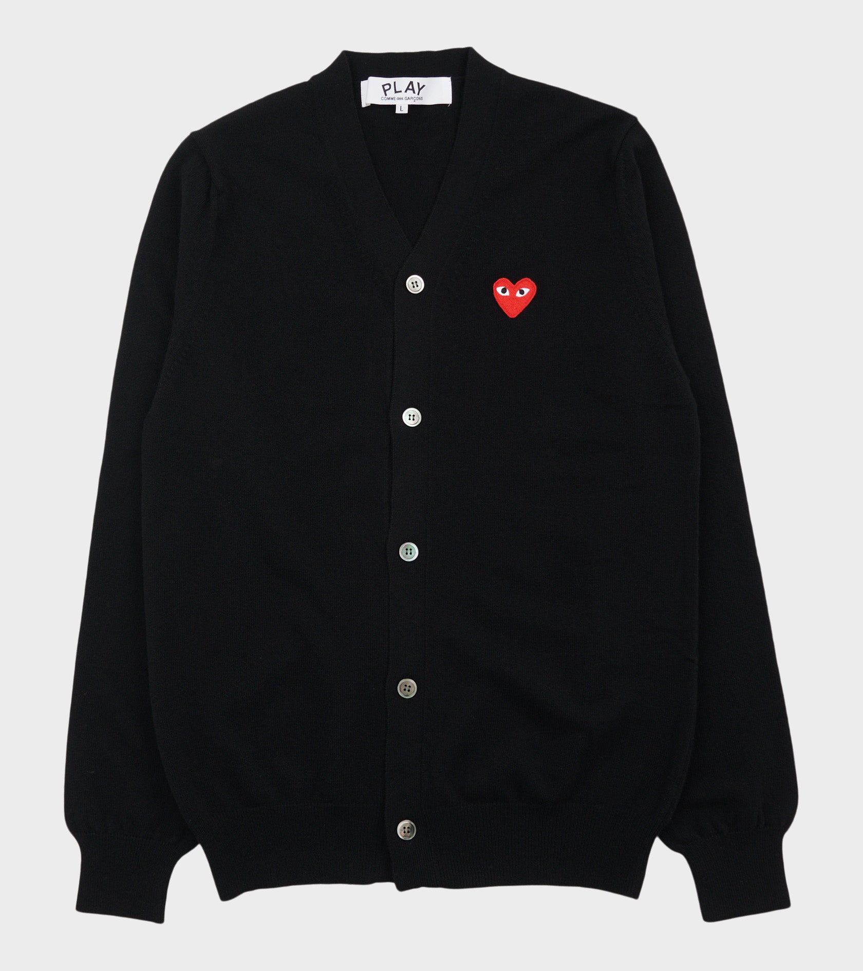 Black unisex cardigan from Comme des Garcons PLAY. This cardigan is made of wool and has a v-neck and button closure on the front. The red PLAY heart is embroidered on the left chest. The iconic heart with eyes from PLAY was designed by Filip Pagowski and is common on all PLAY products.