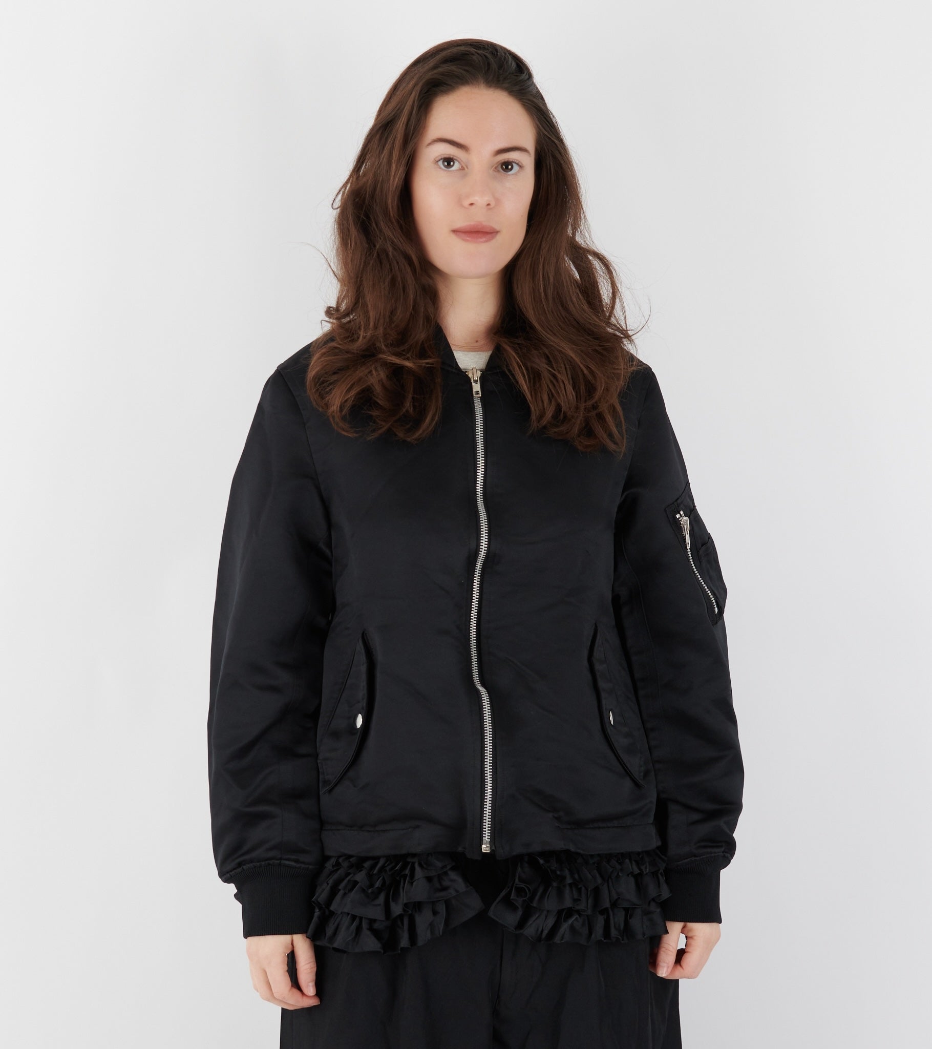 Black bomber jacket with ruffle details from Comme des Garcons. The jacket has silver hardware, a zip closure, a slanted pocket on each side and a zip pocket on the left sleeve.