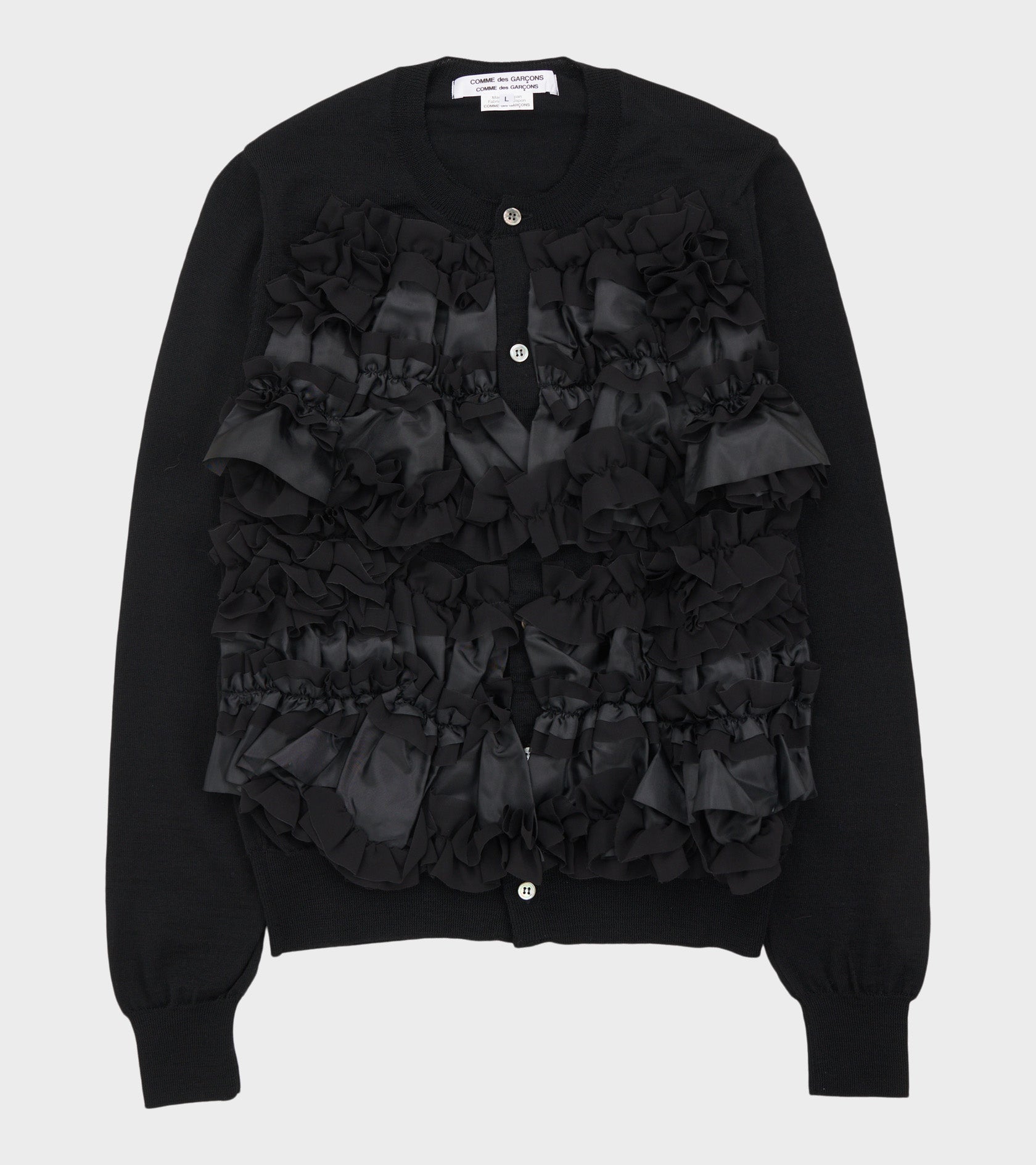 Black cardigan with ruffles from Comme des Garcons. This cardigan is made of wool and has a round neck and a button closure on the front.