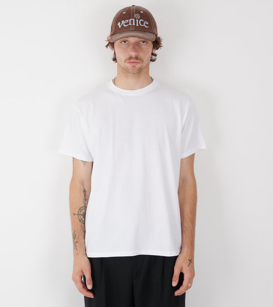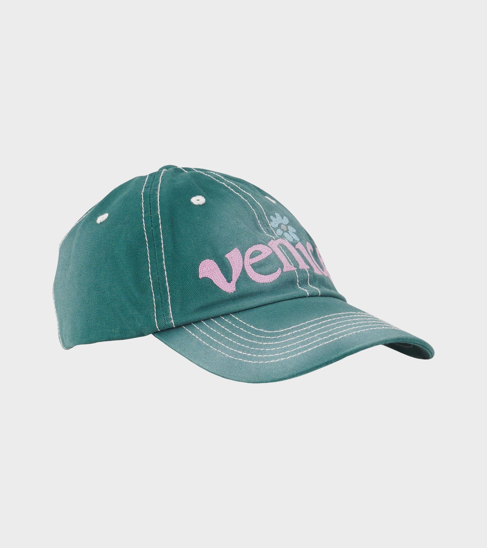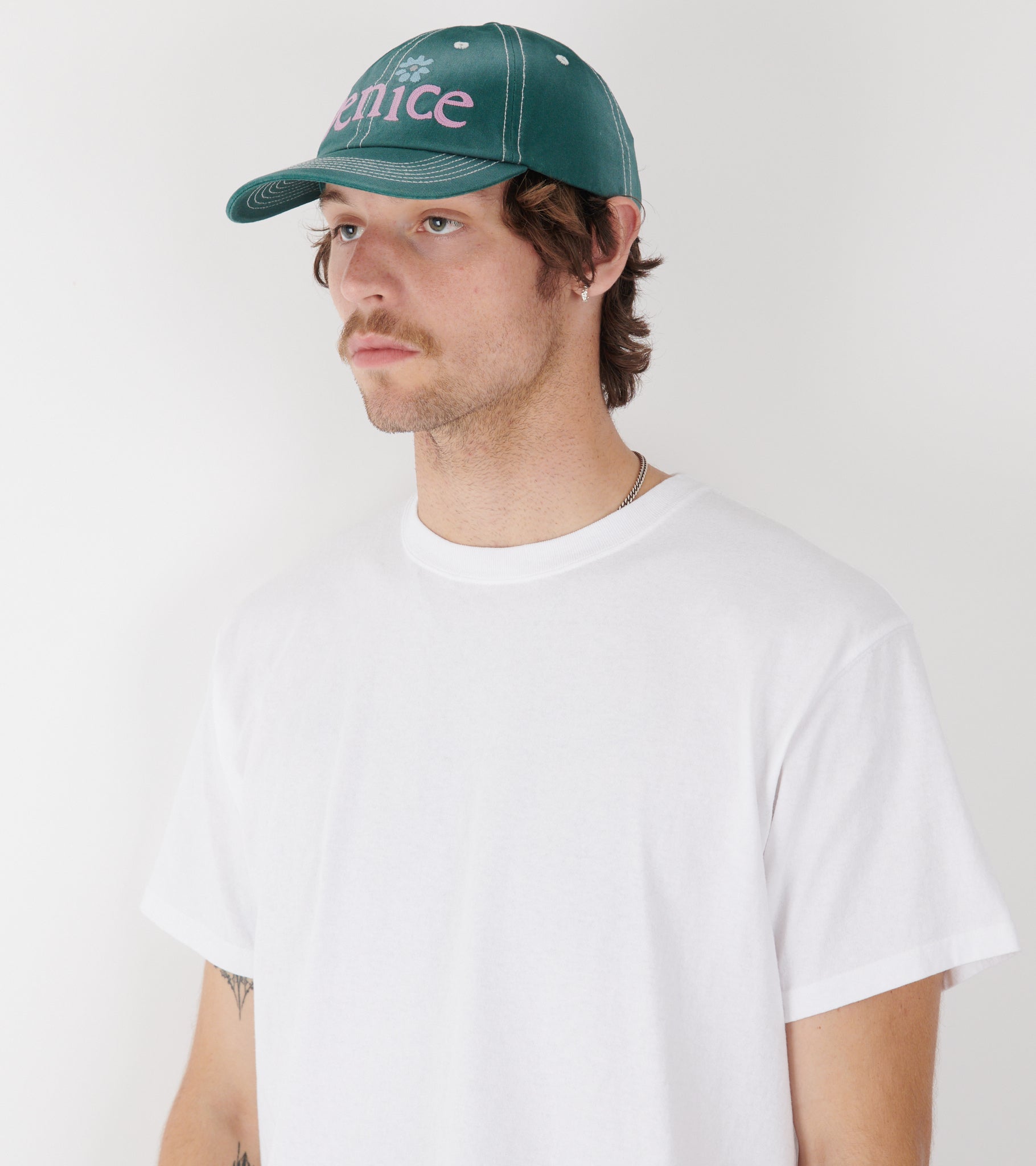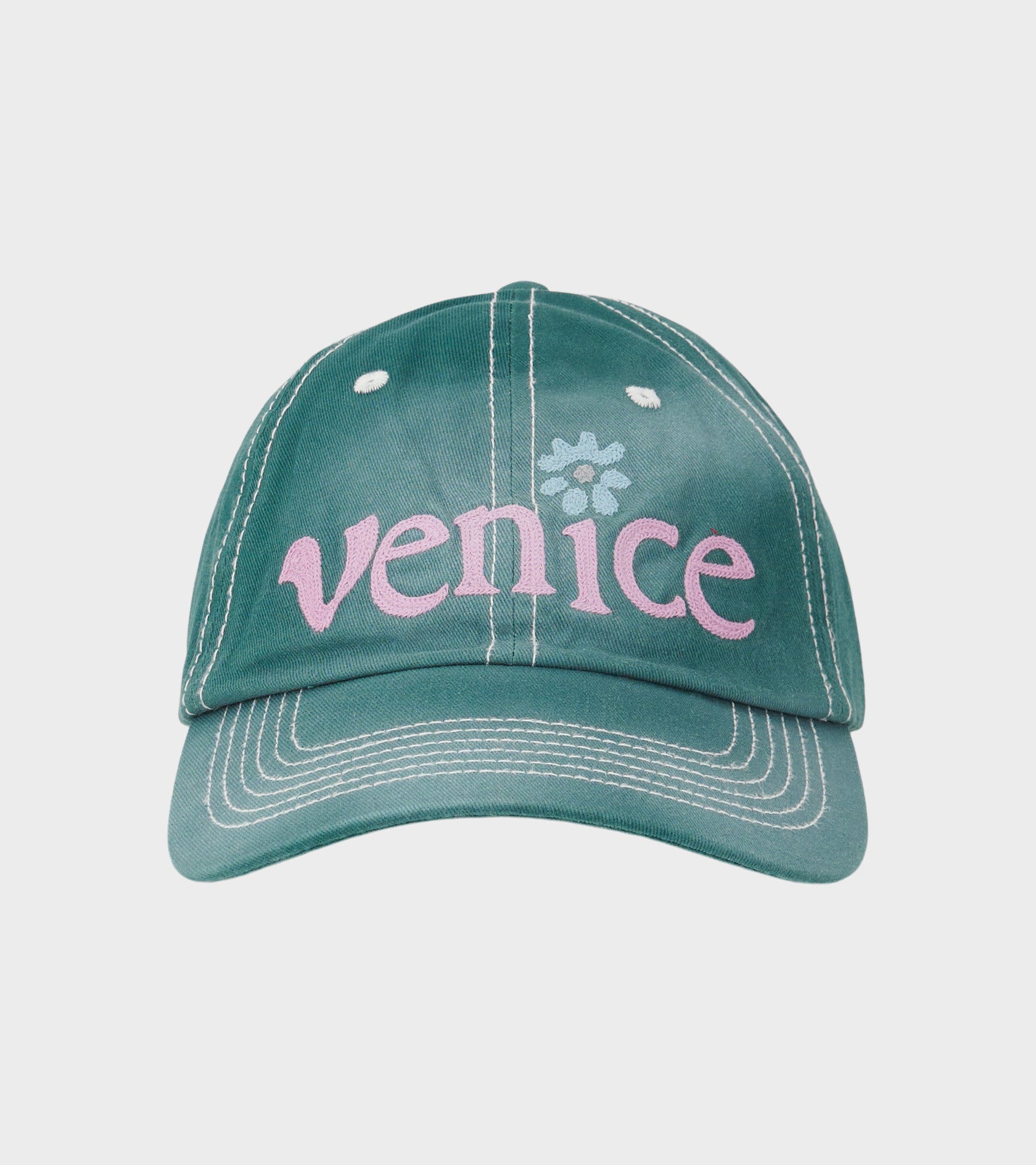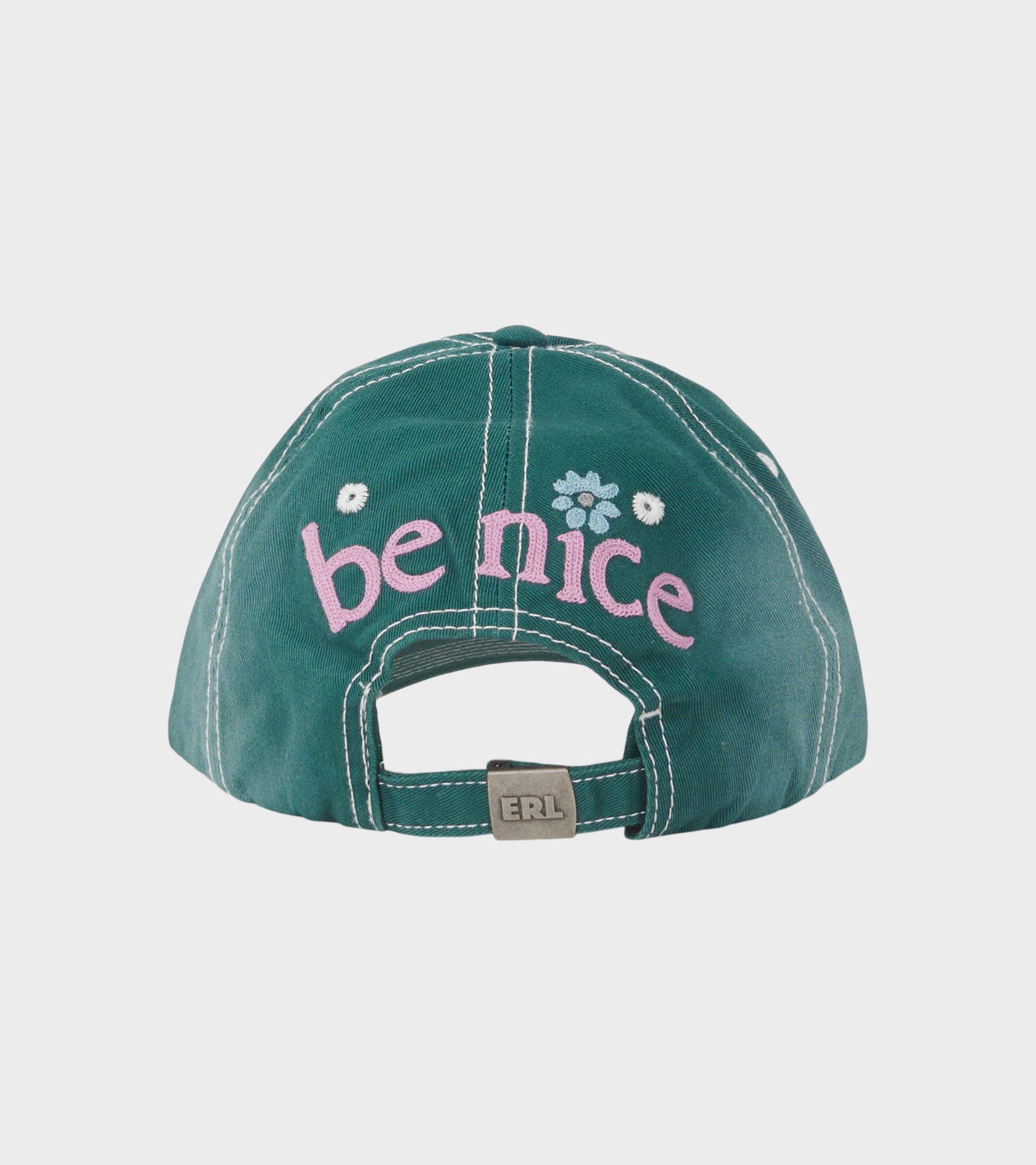 Green cap from ERL. This cap has visible white stitchings and 'Venice' embroidered in pink on the front and 'Be Nice' embroidered on the back. It is made in the USA and can be adjusted in size.