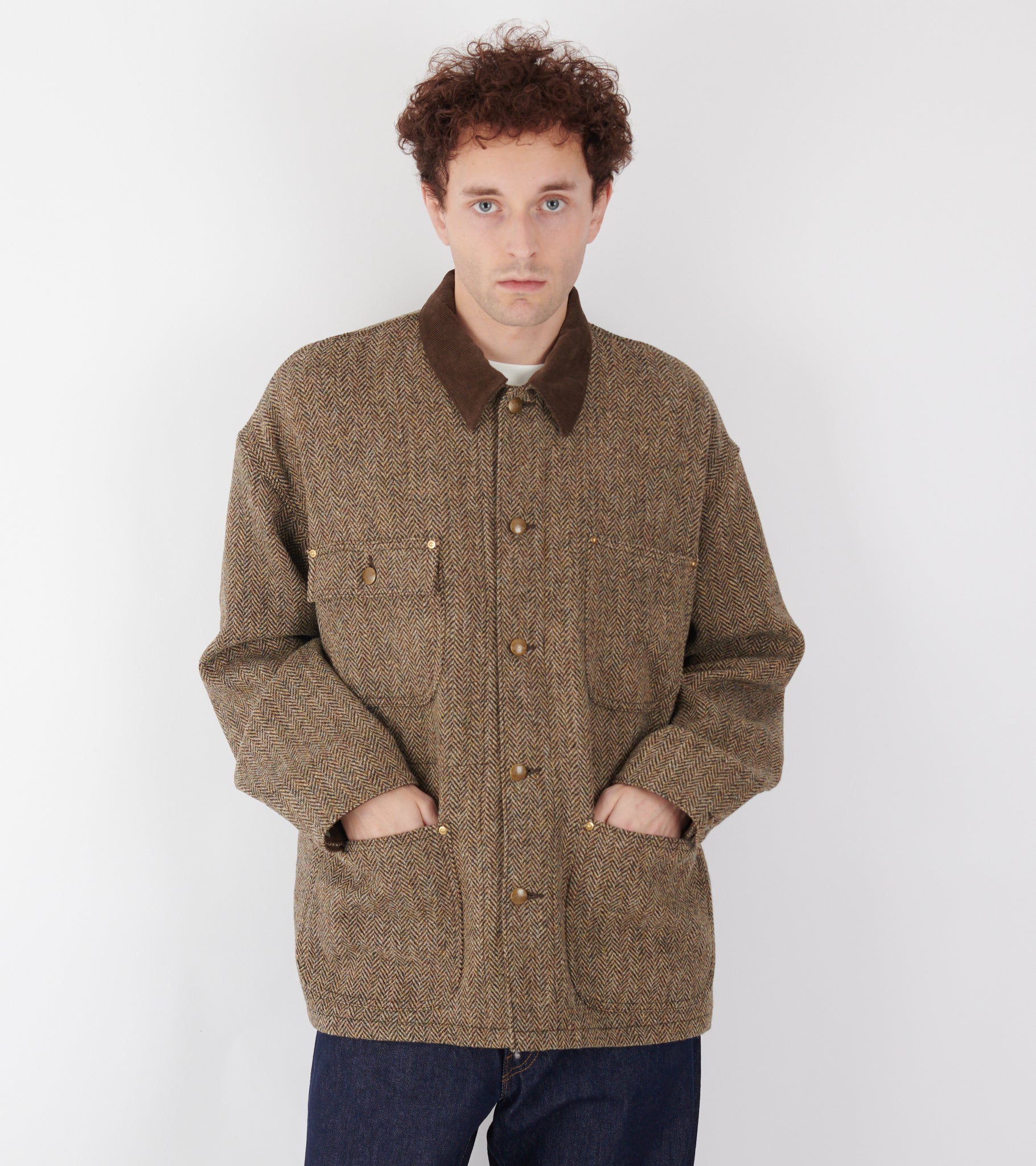 Brown jacket in a Harris Tweed wool quality from Orslow. The jacket has a brown collar in cotton corduroy, a button closure with logo buttons and four pockets on the front.