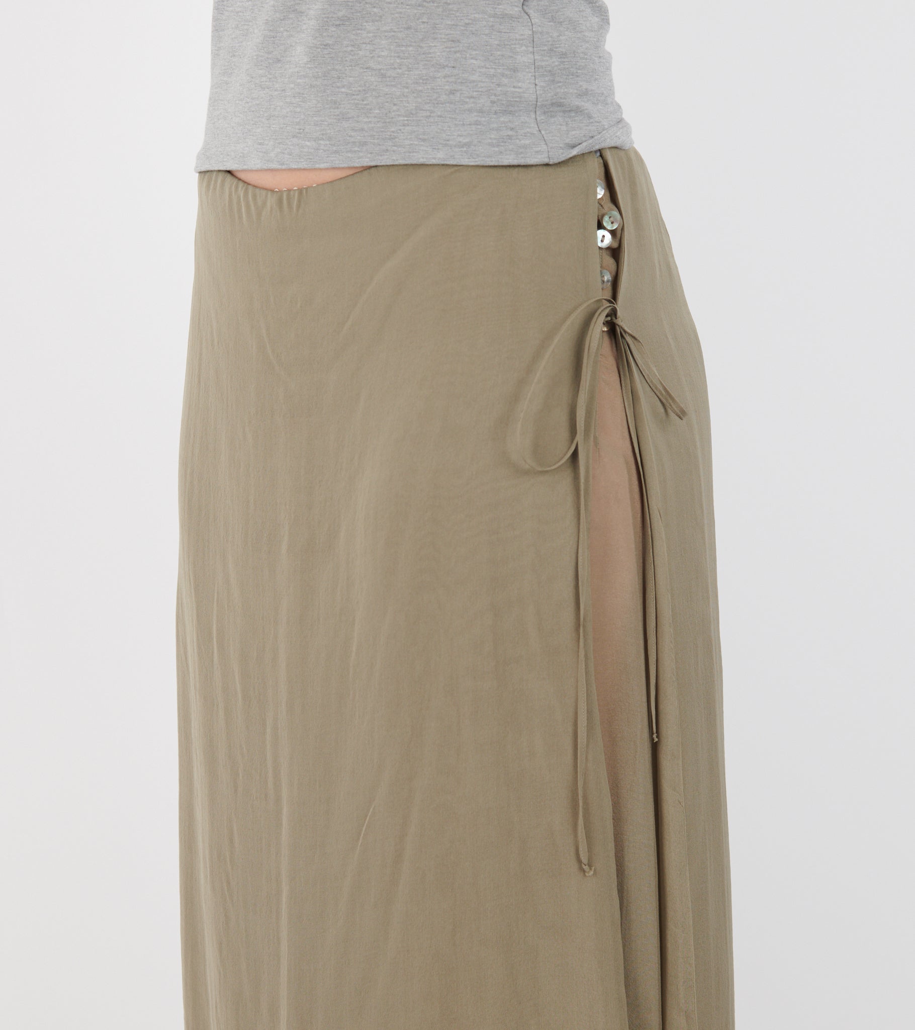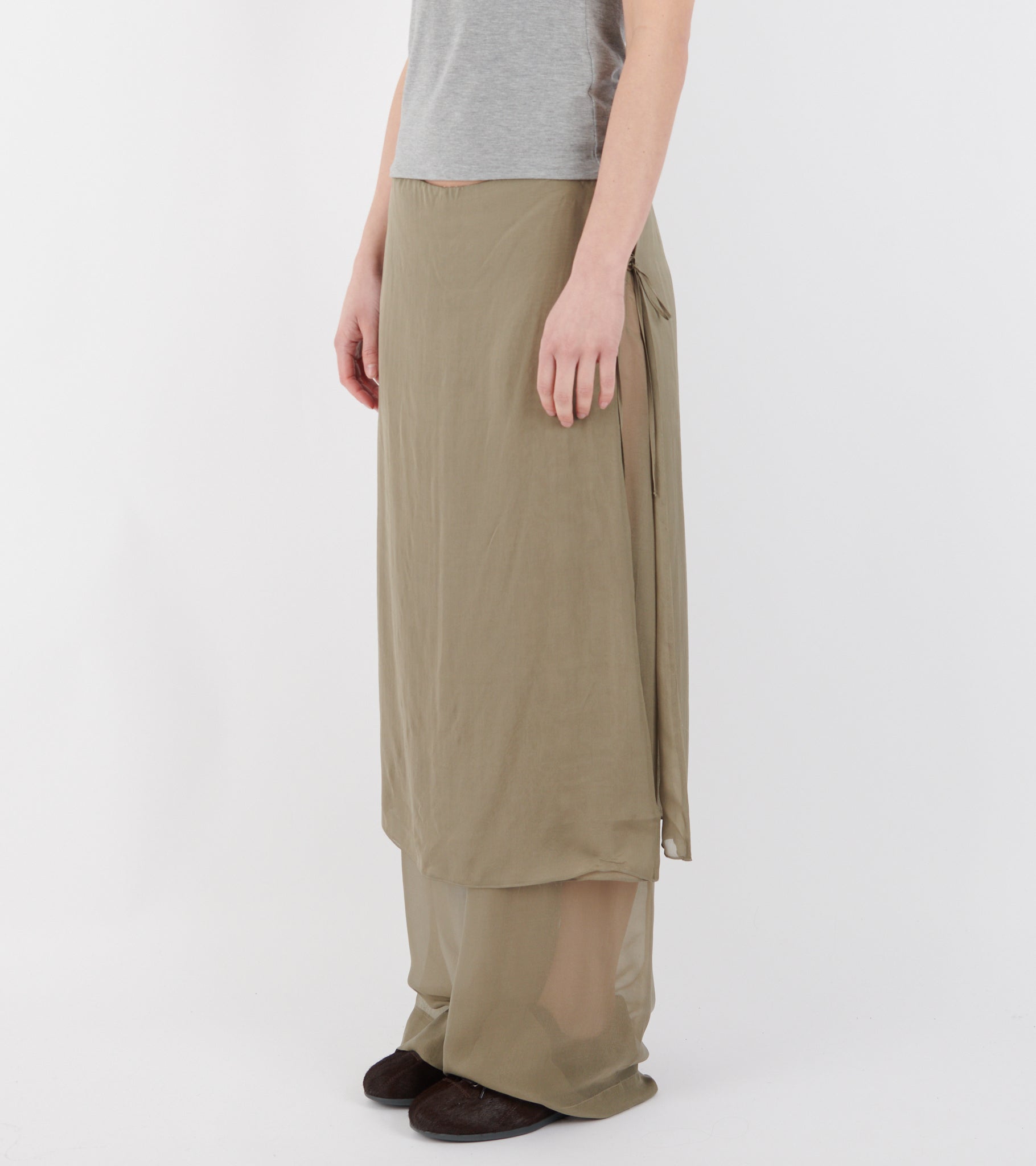 Khaki-colored silk trousers from Paloma Wool. The Low Silk Archive Pants consist of see-through trousers with wide, straight legs. At the top, there is a long skirt with a button closure on the side. The skirt has multiple layers, making it non-transparent. The skirt is not detachable.