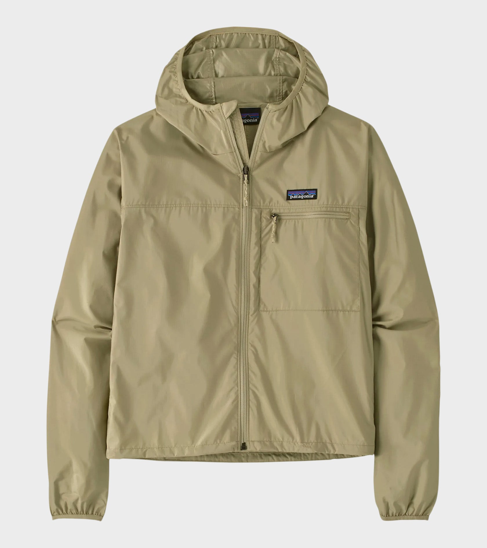 Windproof jacket in recycled polyester from Patagonia. The jacket features a classic hood, a zip closure, a chest pocket and a slanted pocket on each side. A logo is placed above the chest pocket.