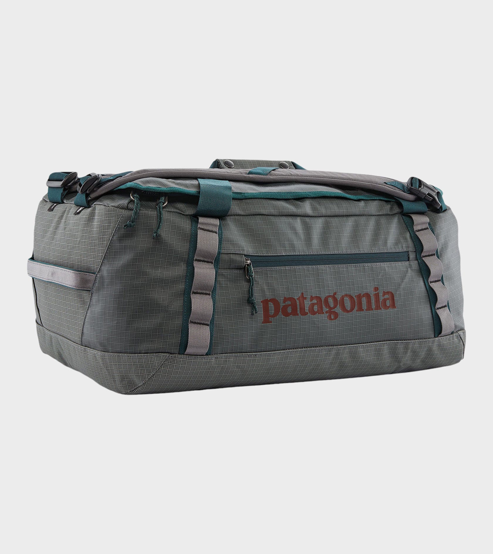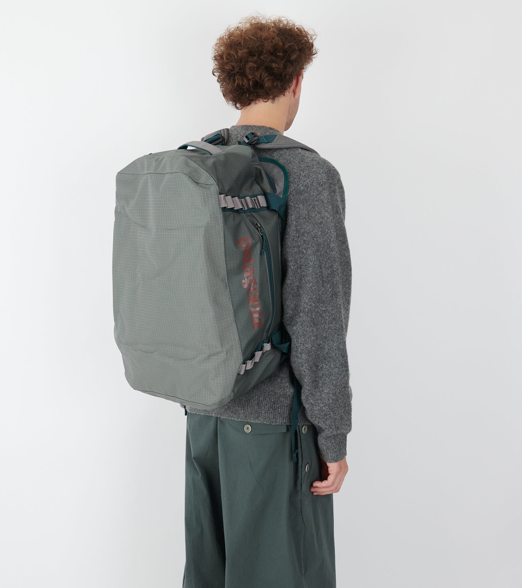 Grey and green packable 40 liter bag from Patagonia. The Black Hole Duffel has a zip closure and comes with removable straps so it can be used as a backpack. The bag is made of recycled polyester.