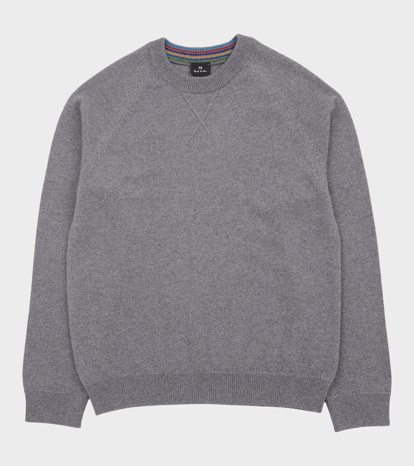 Grey knit in merino wool from Paul Smith. At the top of the back are stripes in the iconic Paul Smith colors.