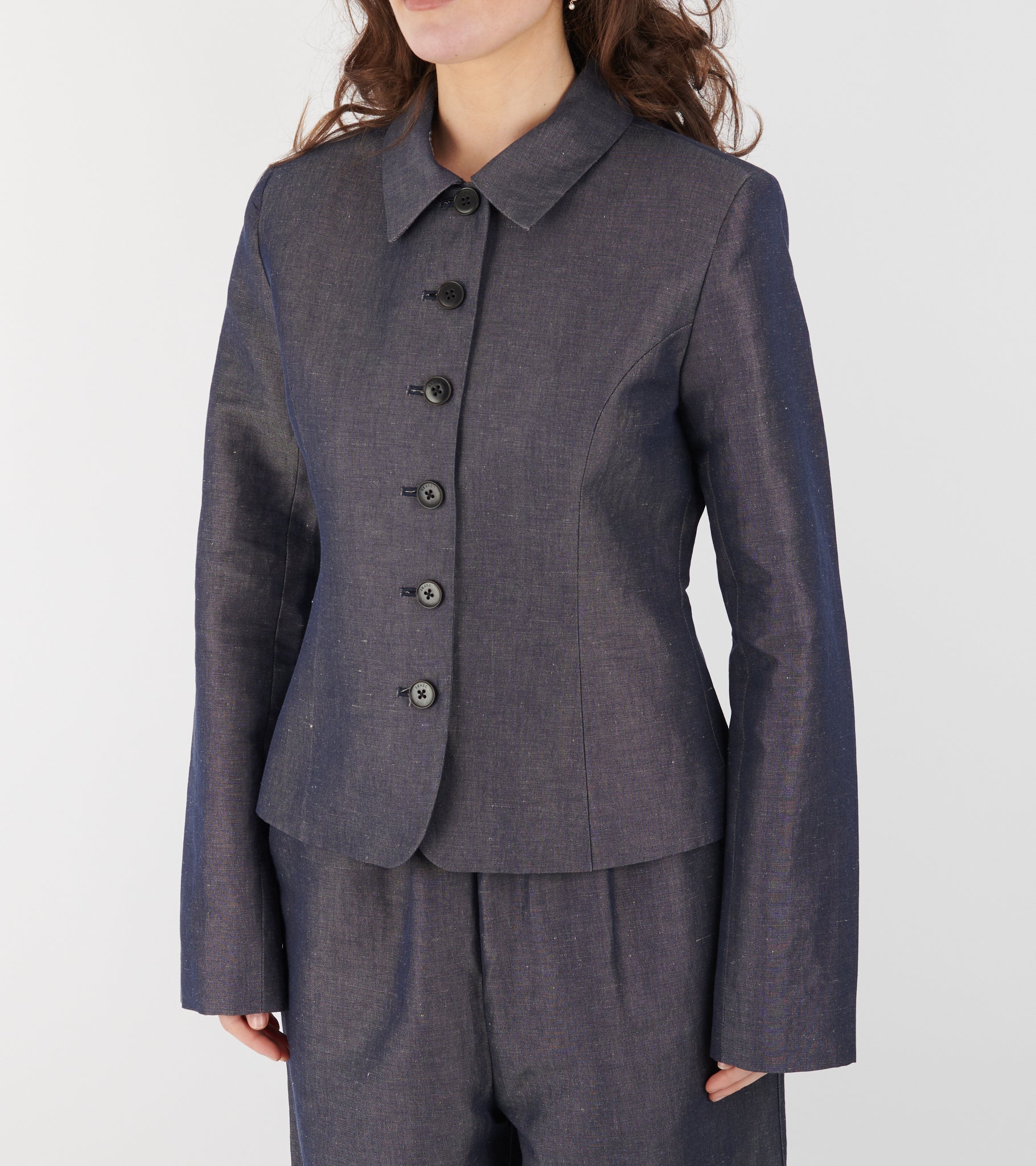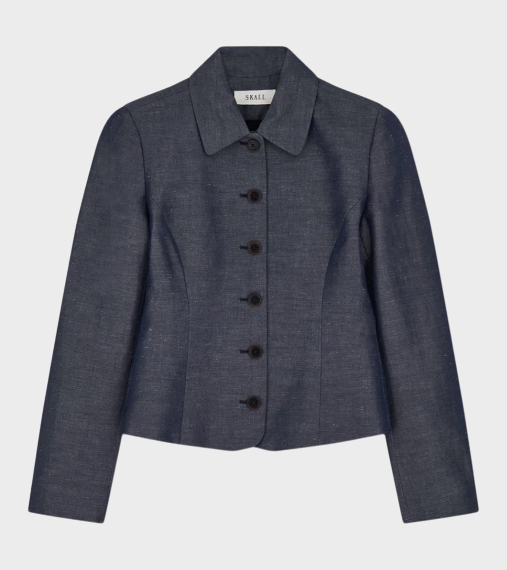 Form-fitting jacket from Skall Studio. Ria Jacket has a classic collar and a button closure on the front. The jacket has long sleeves and shaped panels.