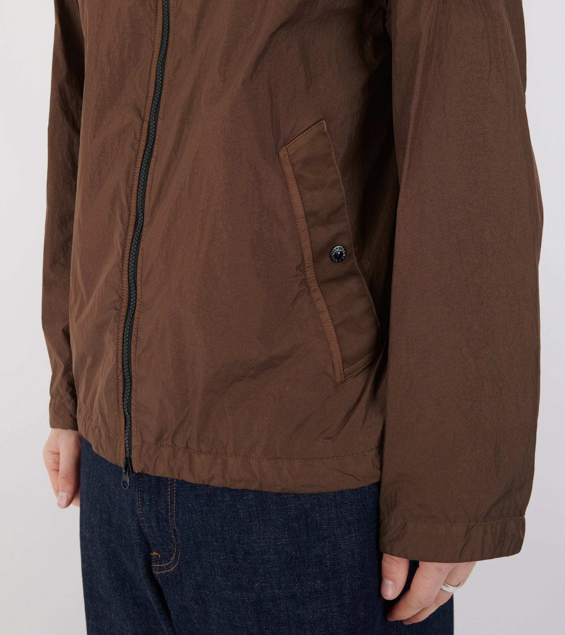 Jacket in a slightly shiny Econyl nylon quality from Stone Island. The jacket is brown and has an adjustable hood, a two-way zip closure and a slanted pocket on each side. On the left sleeve is the iconic Stone Patch.