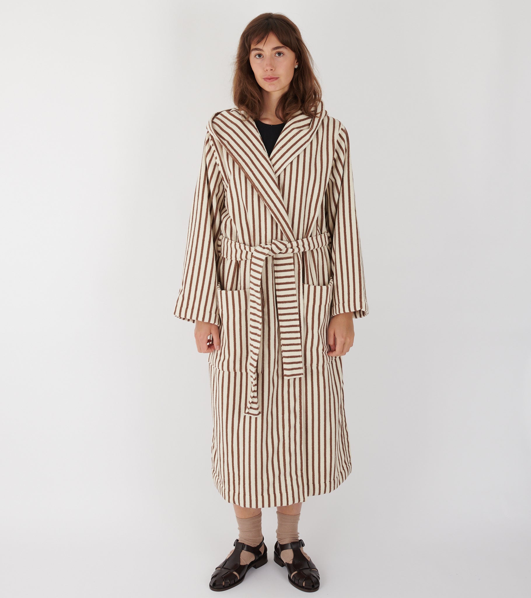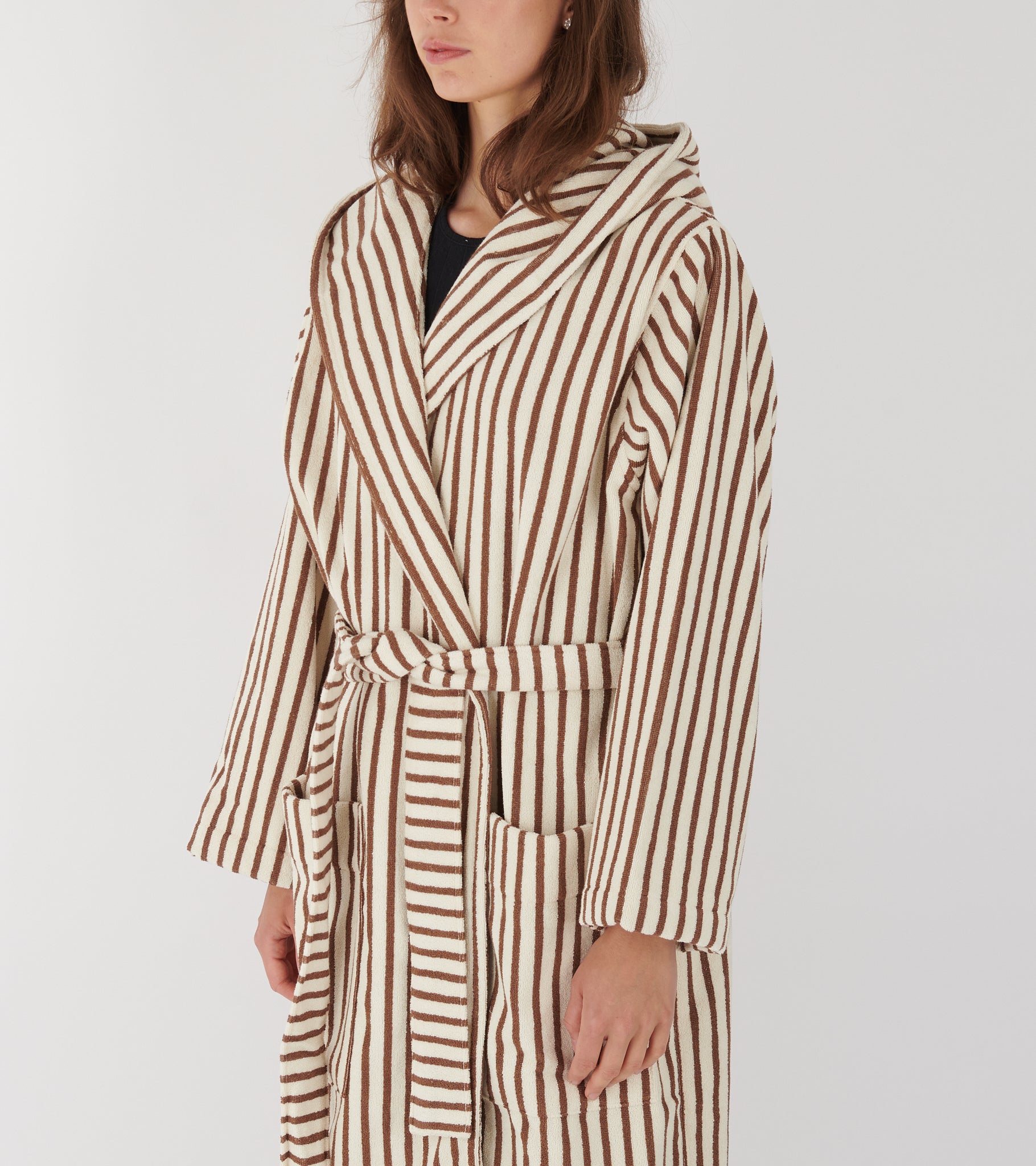 Hooded bathrobe in the color 'Kodiak Stripes' from Tekla. The bathrobe is produced in Portugal in 100% organic and Oeko-Text certified cotton, which is extra combed, making it softer, stronger and smoother than regular cotton fibers. Hooded Bathrobe is designed in an oversized fit.