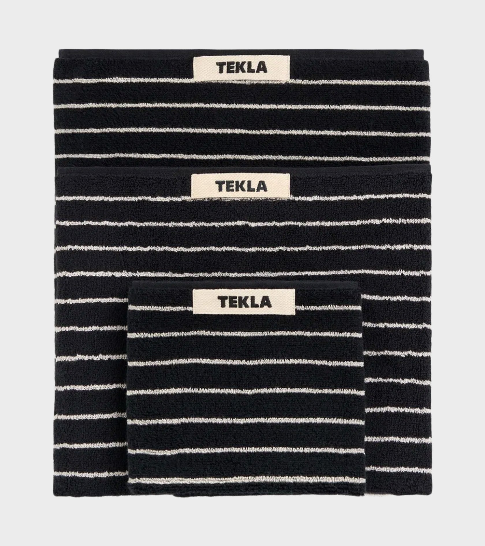 Bath towel in the color 'Black Stripes' from Tekla. The towel is made of 100% organic cotton and is produced in Portugal. Bath Towel measures 70 x 140 cm. All towels from Tekla are free of harmful chemicals.