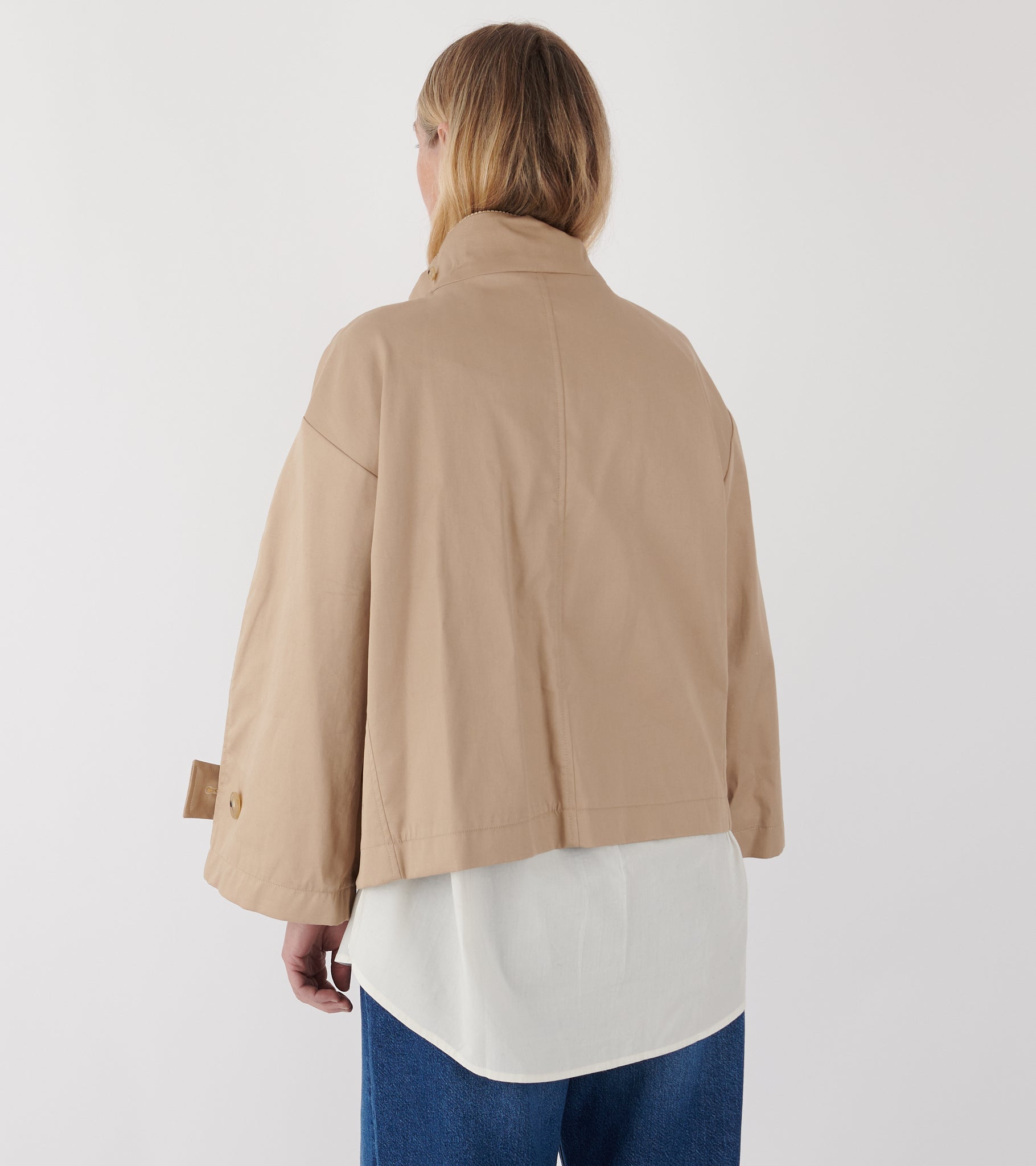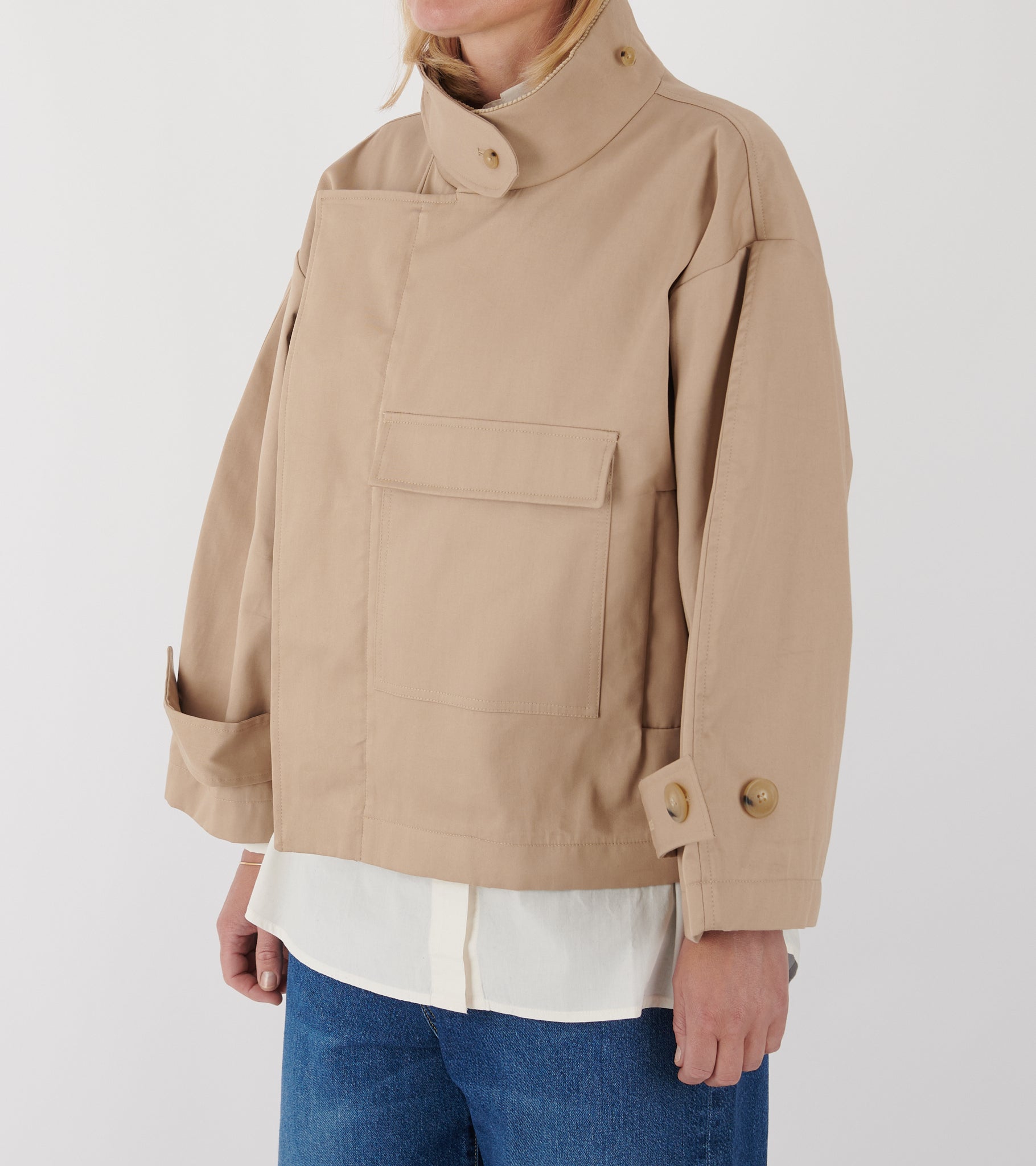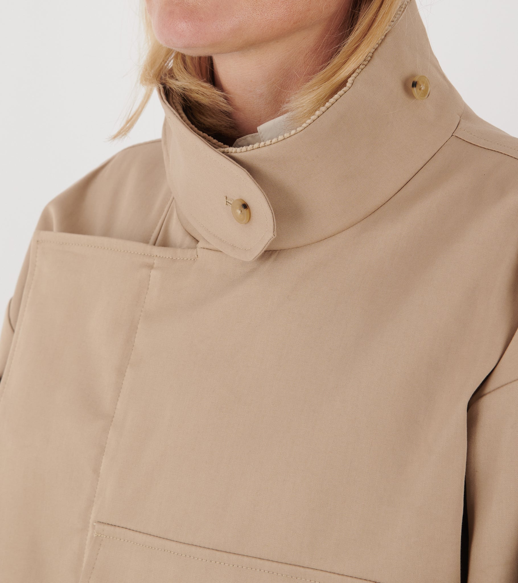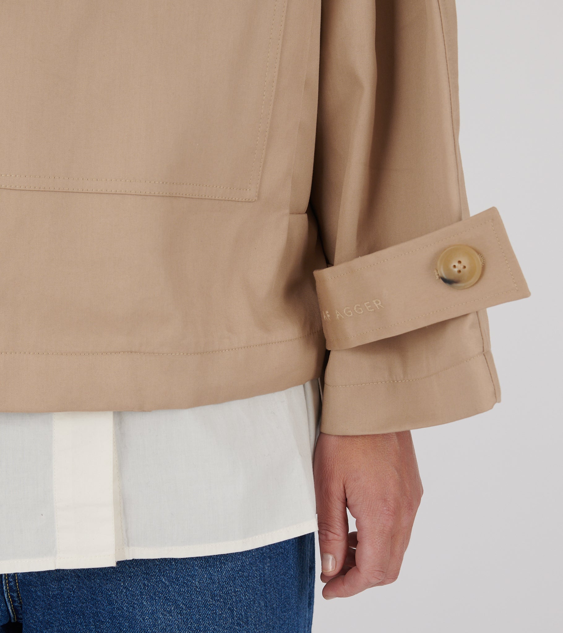 Light beige jacket from AF Agger. This jacket is water-repellent and inspired by a classic sailor jacket. The jacket has both a zipper closure and a button closure, both of which can be hidden. The jacket has a round collar, two slant pockets, one large pocket on the front, buttons on the sleeves and the collar.