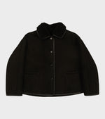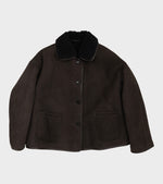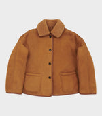 Jacket in a dark beige shade from Cawley. This jacket is reversible and is made of lambskin. The jacket has a large classic collar, a button closure with horn buttons, two pockets on the front and contrasting edges in brown leather. One side of the jacket is made of lamb suede and the other side is made of curly lamb shearling. It is produced in London and has a relaxed fit.