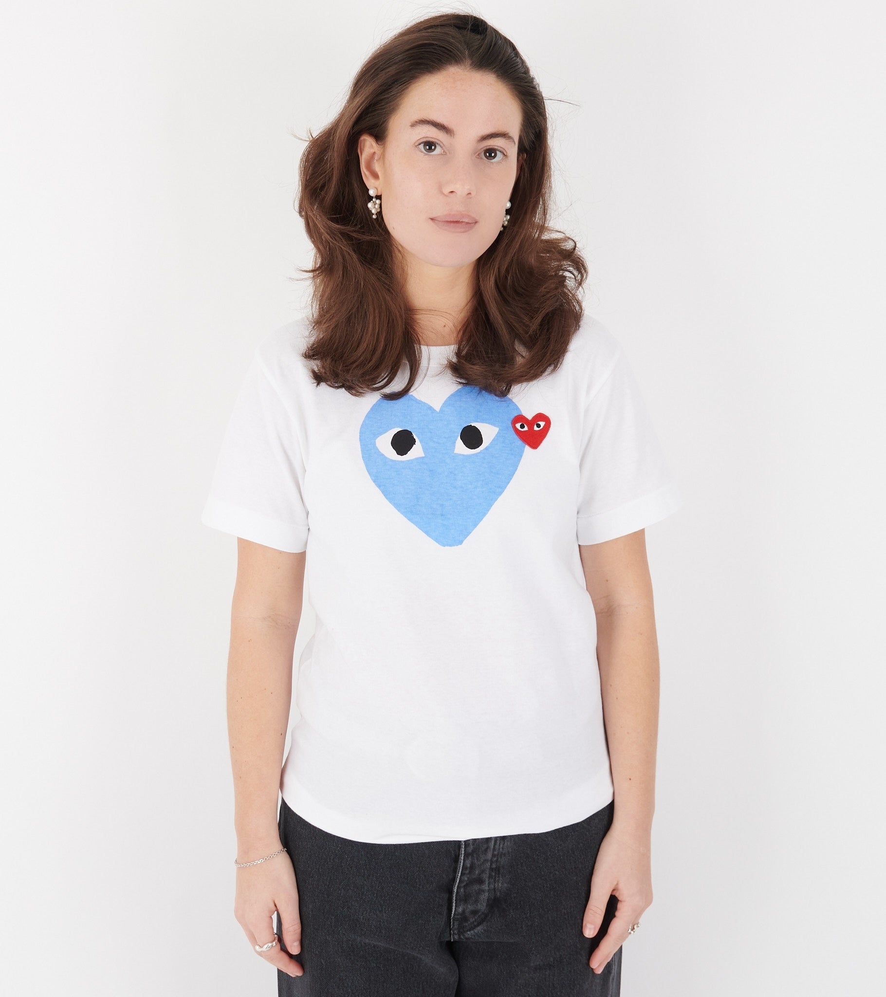 White unisex t-shirt from Comme des Garcons PLAY with the brand's characteristic heart with eyes. The iconic heart with eyes from PLAY was designed by Filip Pagowski and is common on all PLAY products. This t-shirt has a large printed heart in light blue and a small embroidered heart in red at the left chest.