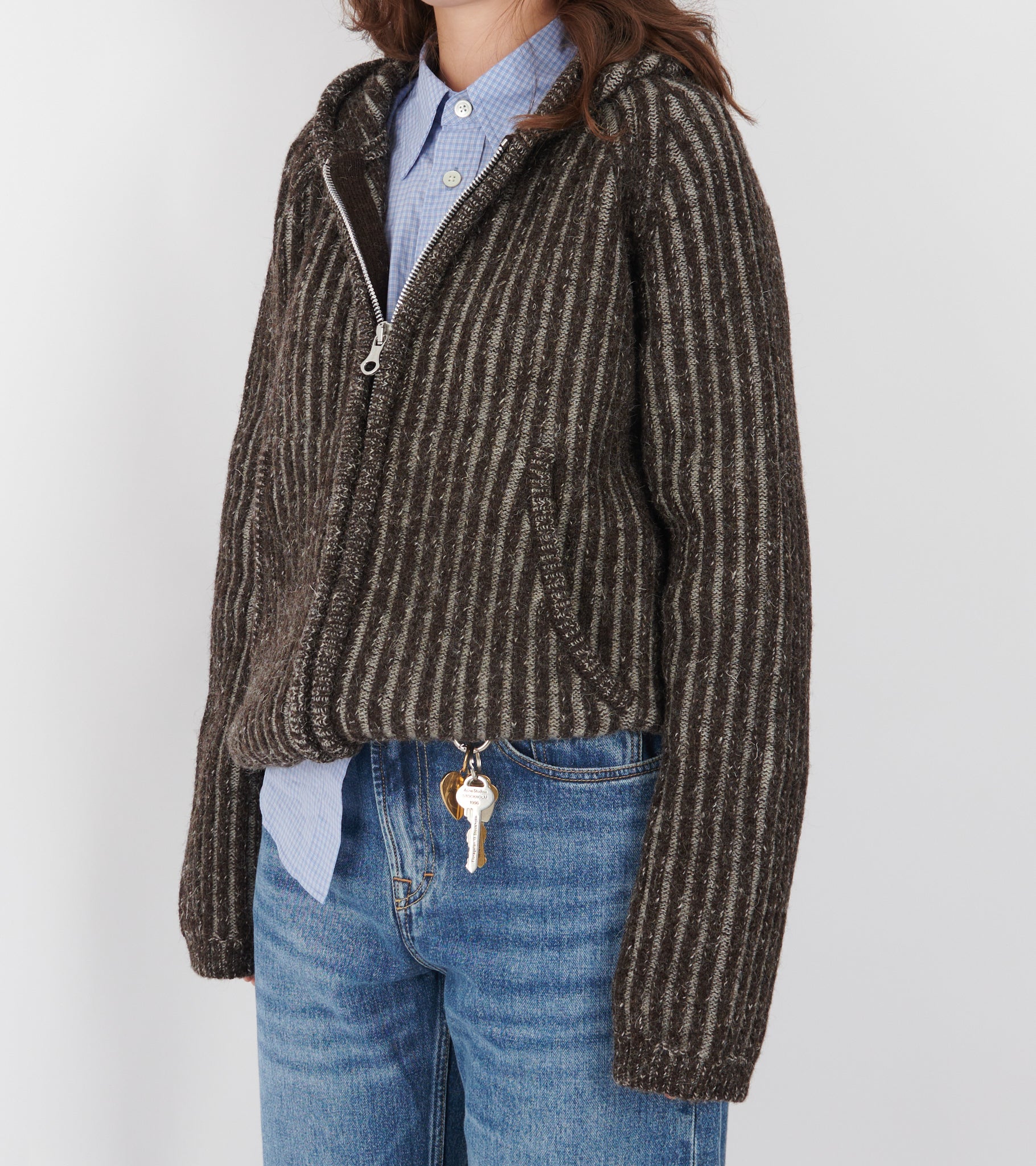 Keychain with keys and pendants from Acne Studios. The keychain has gold and silver keys as well as hearts with embossed logos.