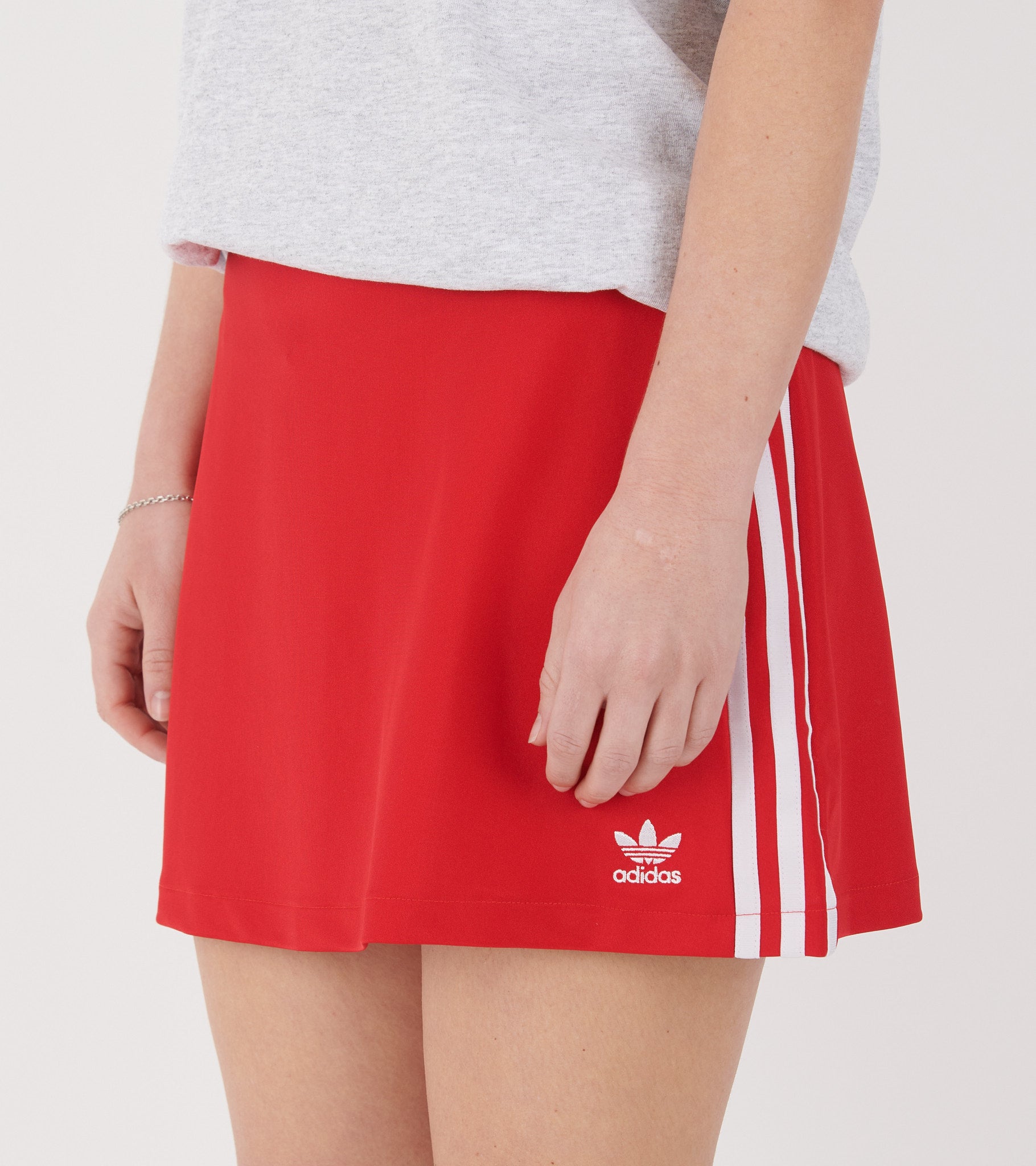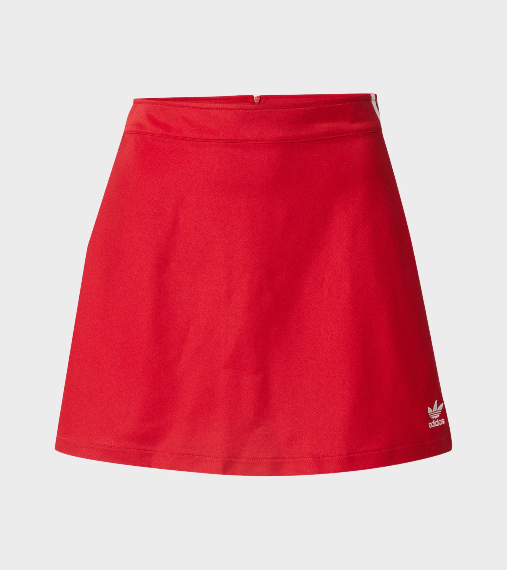 Red mini skirt from Adidas. The skirt has the iconic stripes along the sides, an embroidered logo on the front and a discreet zipper closure at the back.