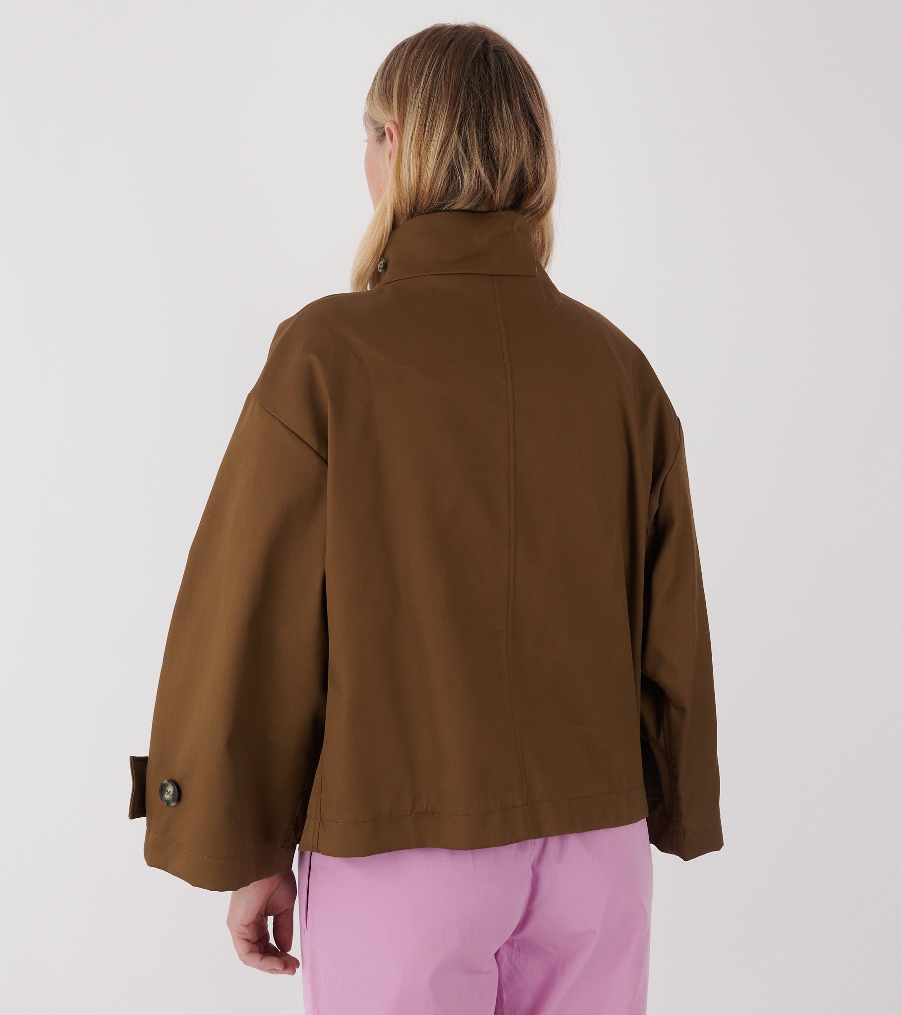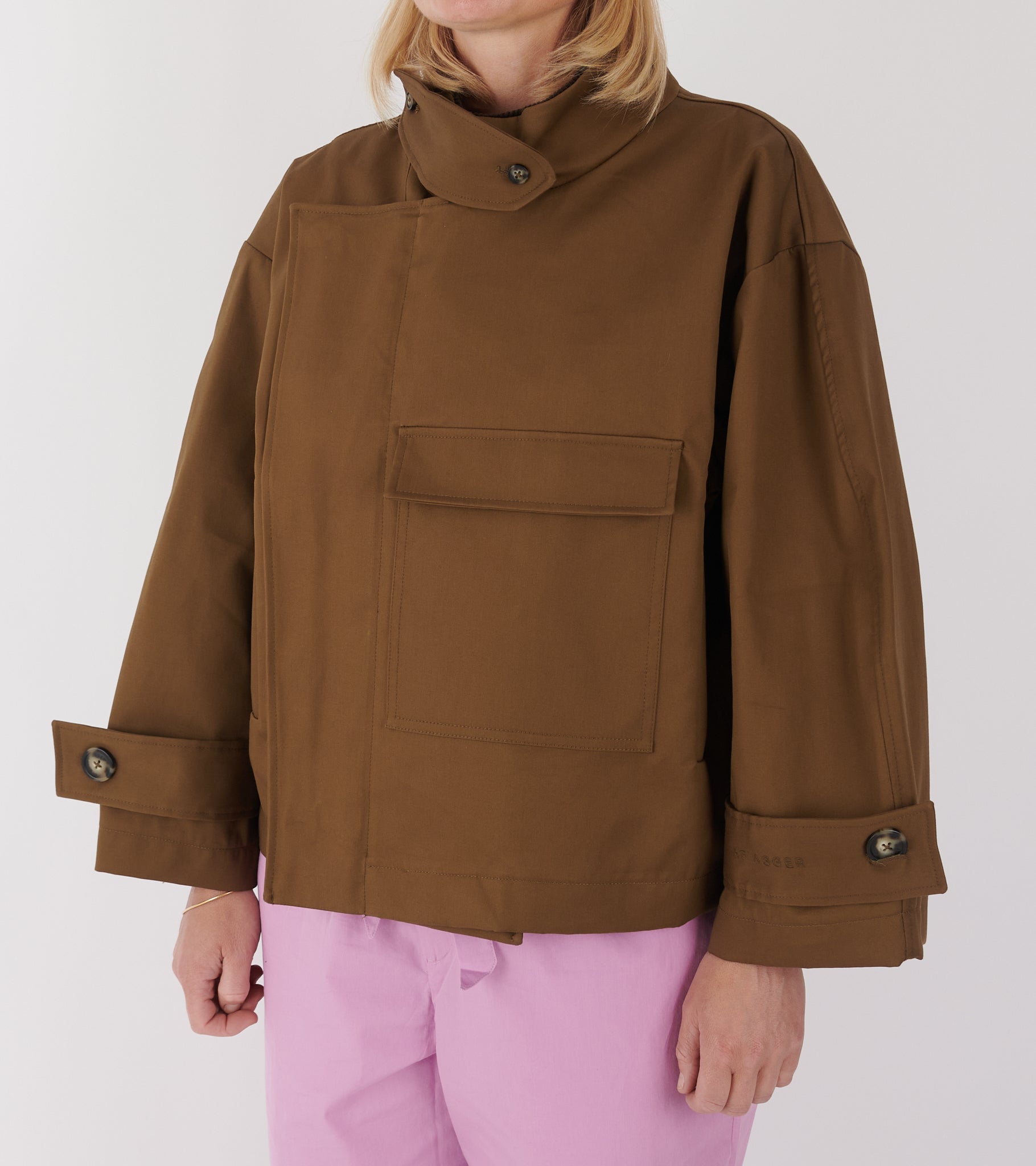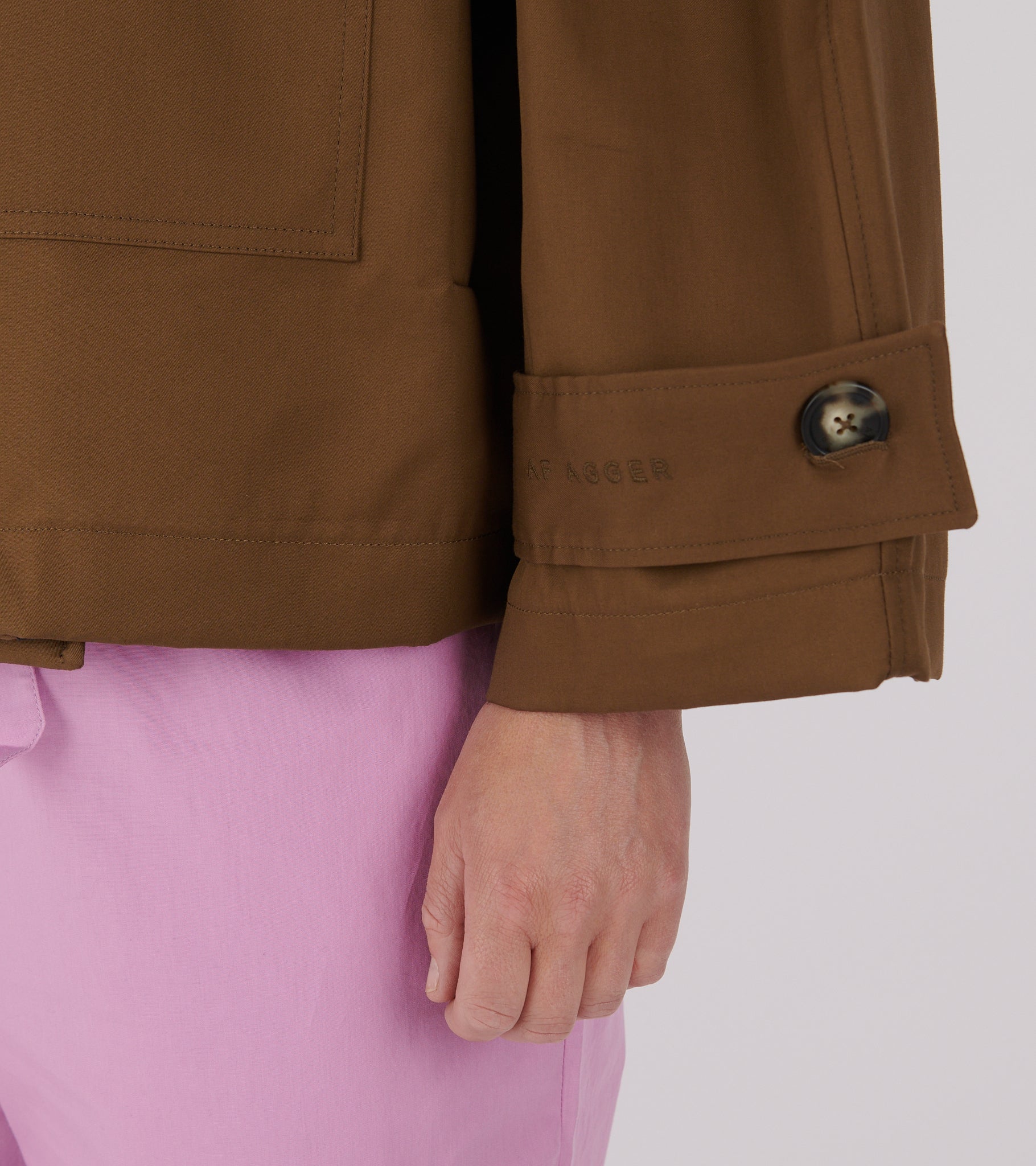 Jacket in the color 'Loden' from AF Agger. This jacket is water-repellent and inspired by a classic sailor jacket. The jacket has both a zipper closure and a button closure, both of which can be hidden. The jacket has a round collar, two slant pockets and one large pocket on the front. Buttons on the sleeves and collar.