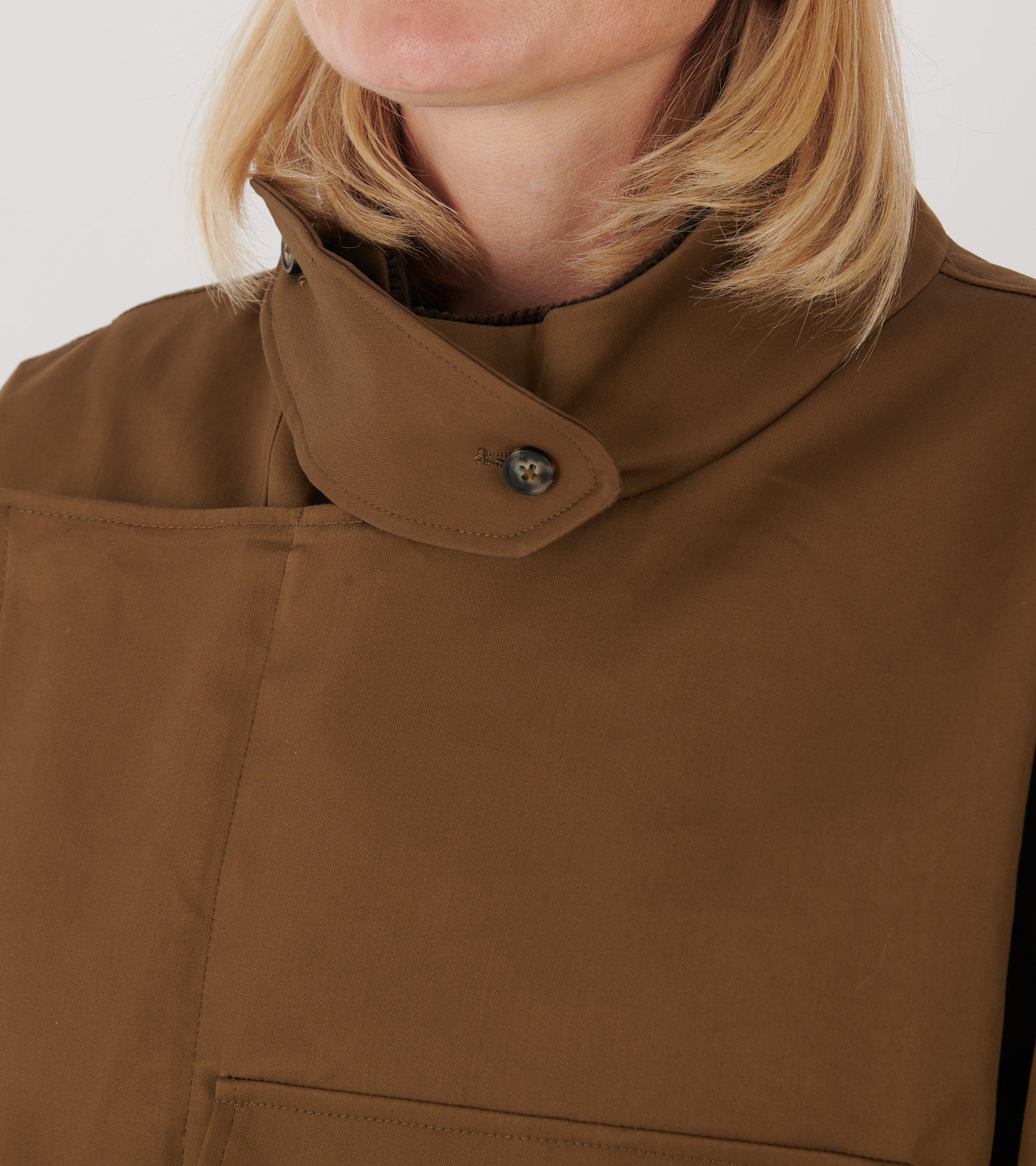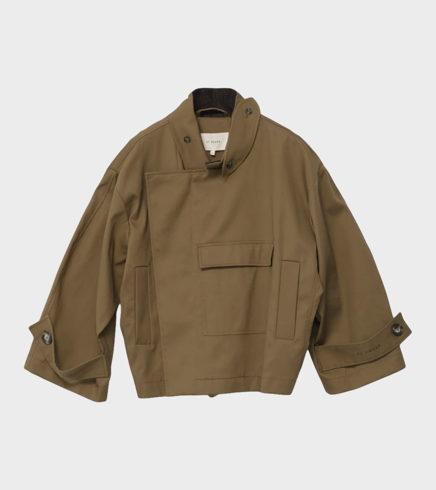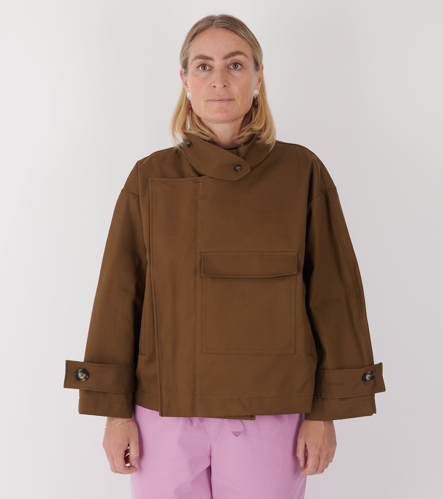 Jacket in the color 'Loden' from AF Agger. This jacket is water-repellent and inspired by a classic sailor jacket. The jacket has both a zipper closure and a button closure, both of which can be hidden. The jacket has a round collar, two slant pockets and one large pocket on the front. Buttons on the sleeves and collar.