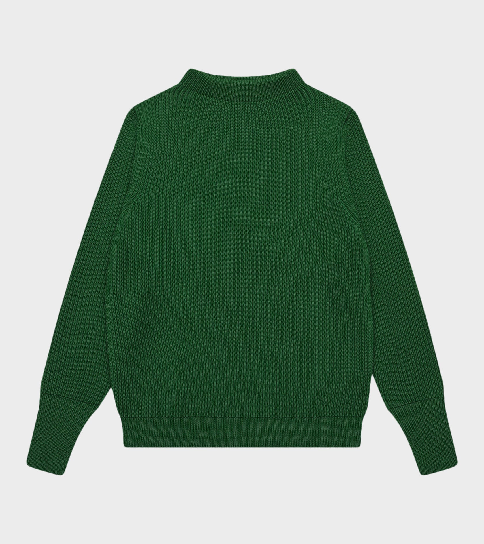 Green knit from Andersen-Andersen. Navy Crewneck is made from a heavy rib virgin wool and has a round neck, a thumb hole and extended sleeve rib at the ends.