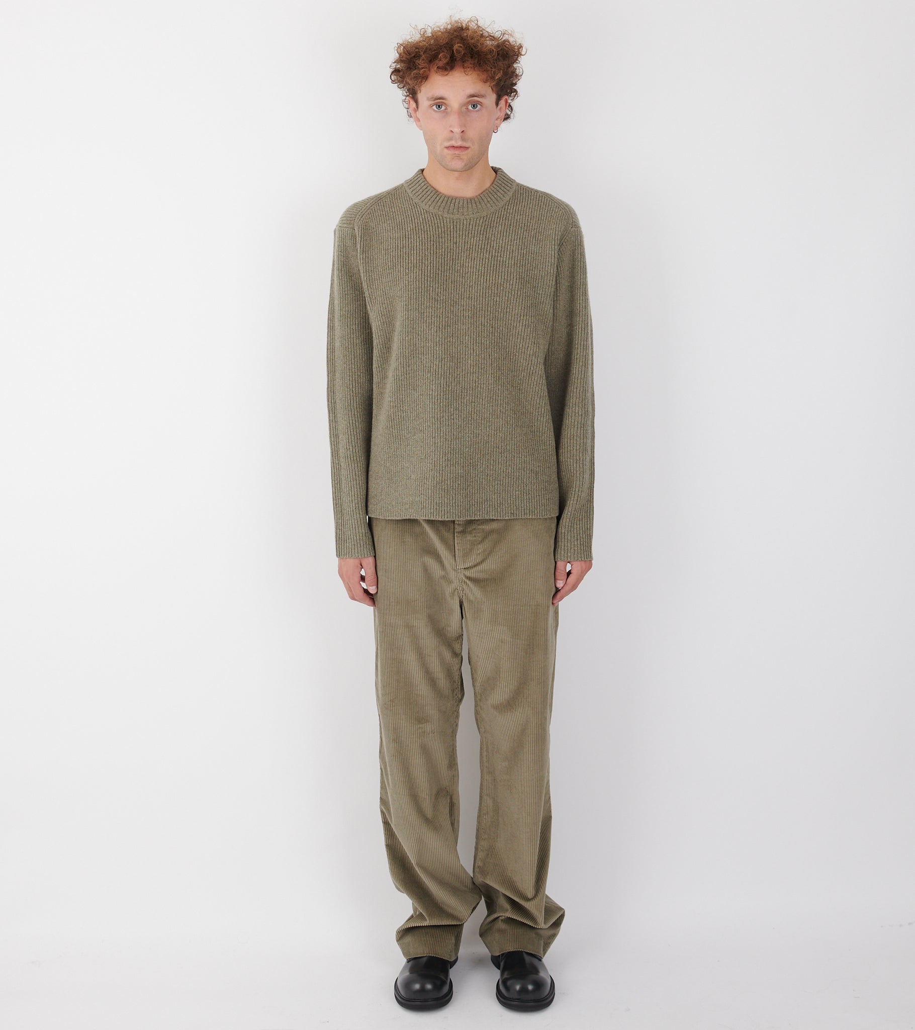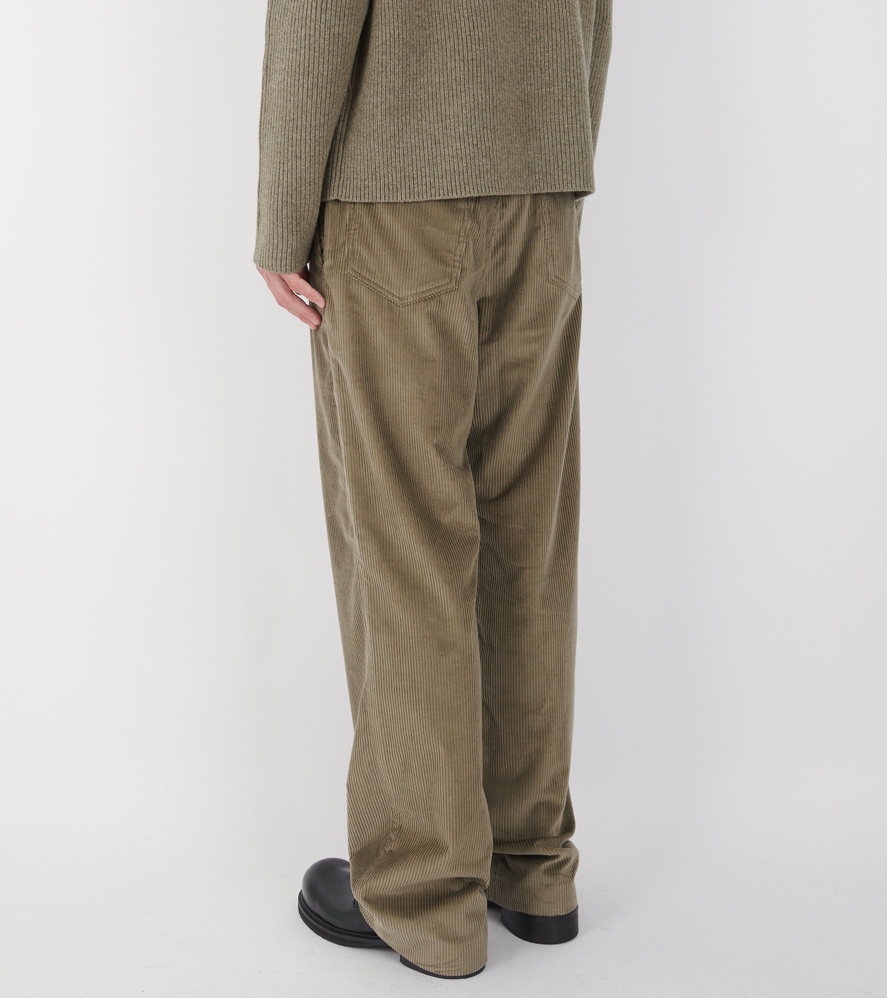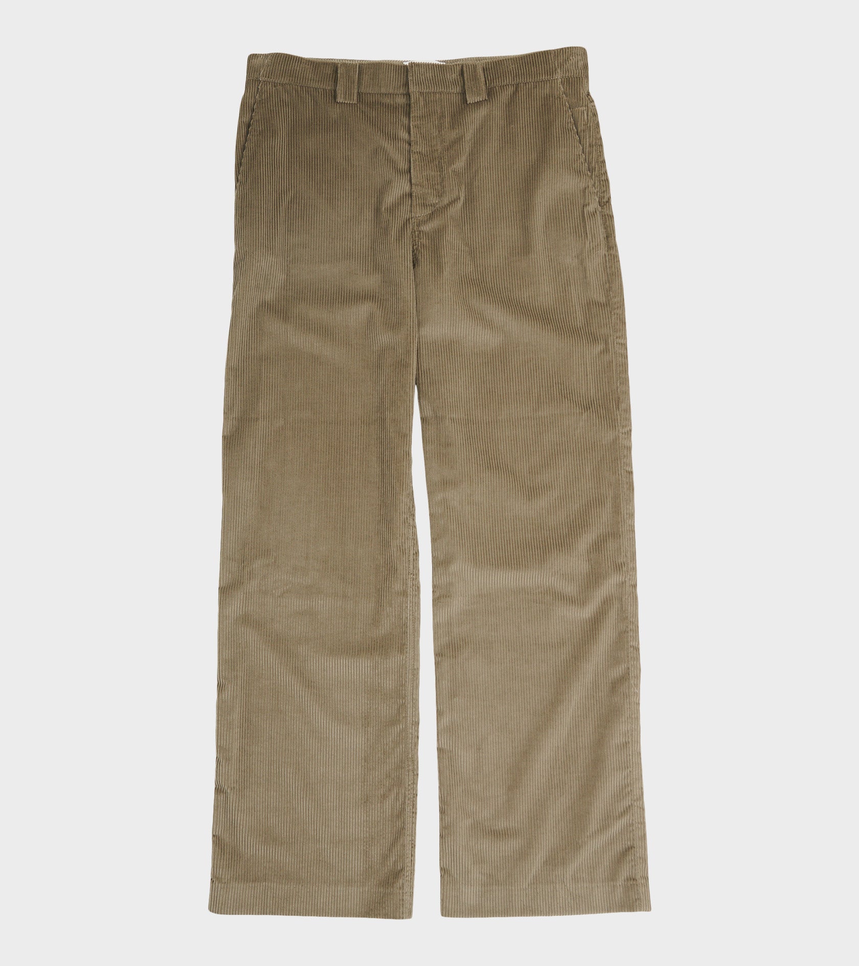 Corduroy trousers in a khaki/dark beige shade from Berner Kühl. Night Trousers are made from an Italian deadstock quality, consisting of cotton and cashmere. The trousers have wide belt loops, a slanted pocket on each side and two back pockets. The trousers have wide straight legs.