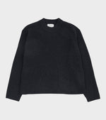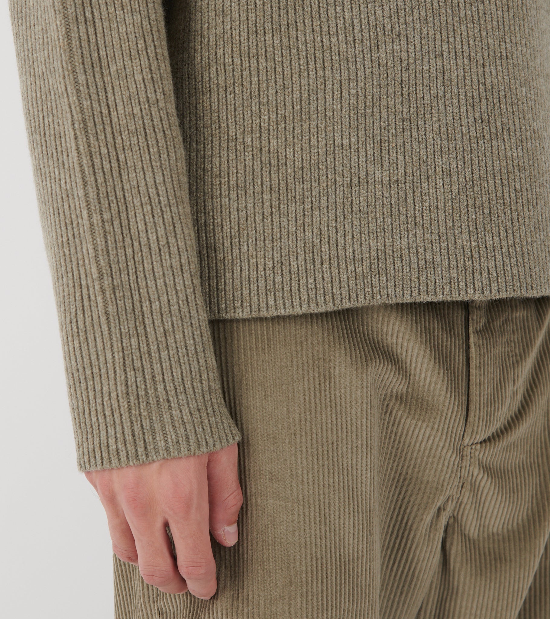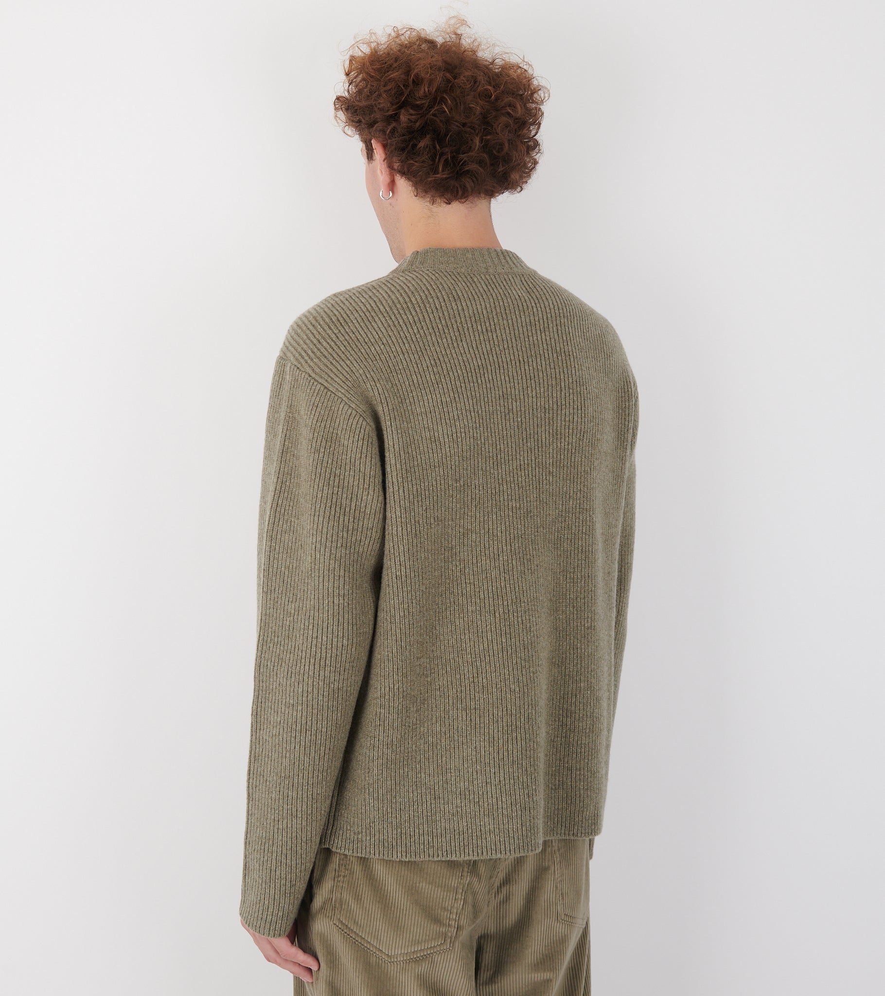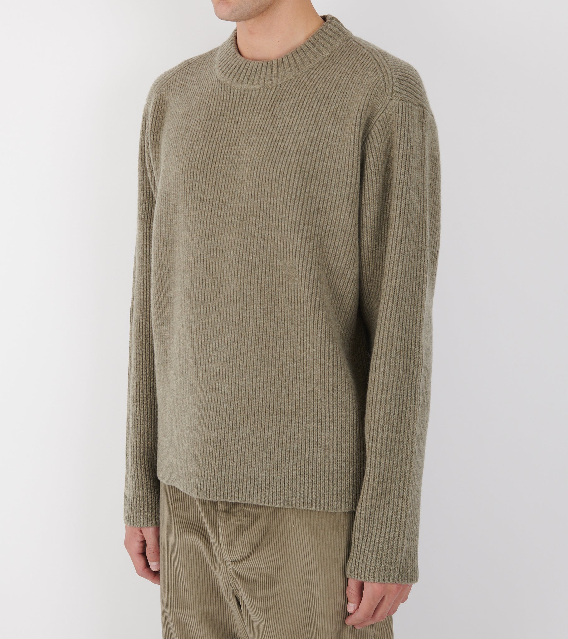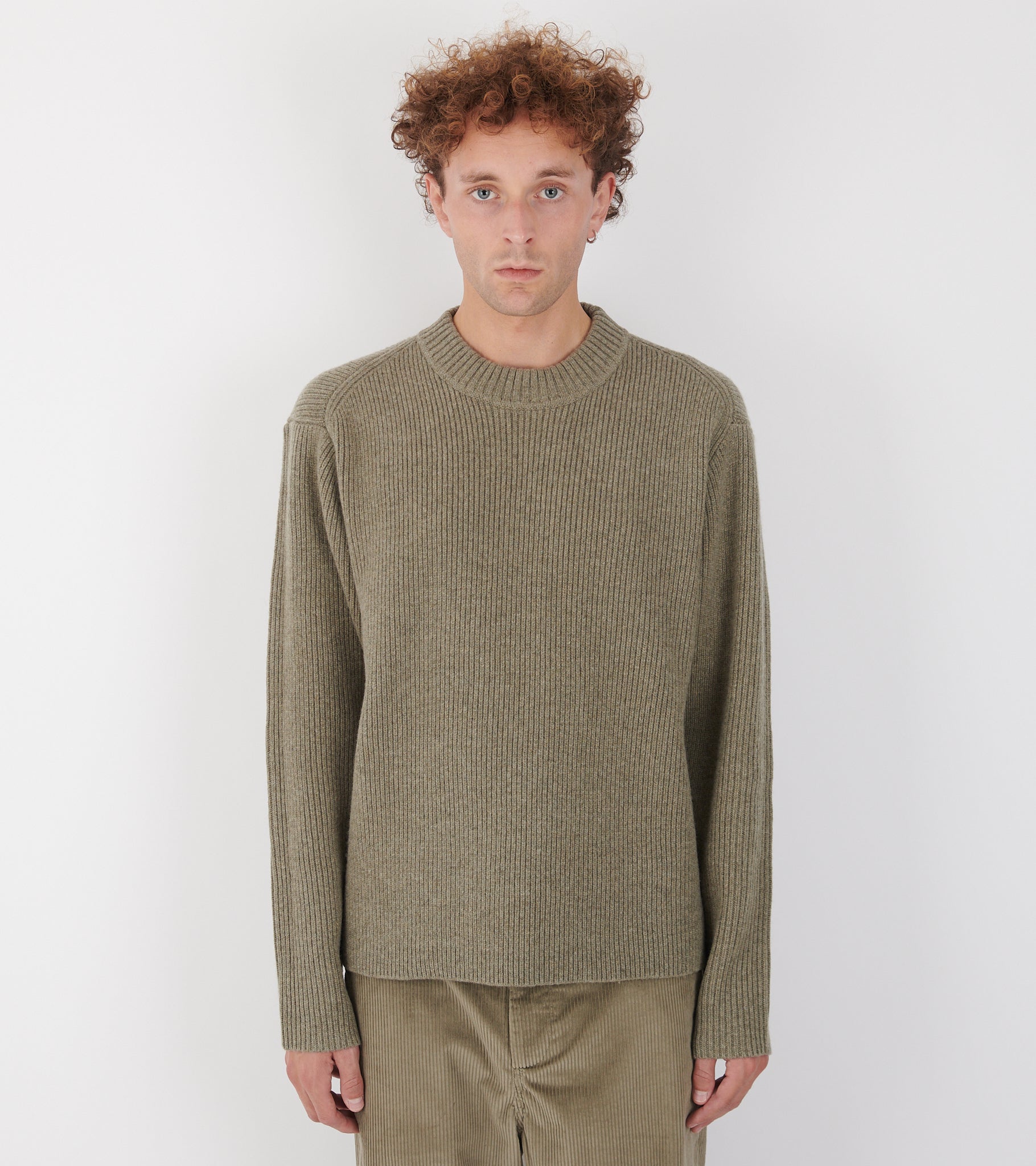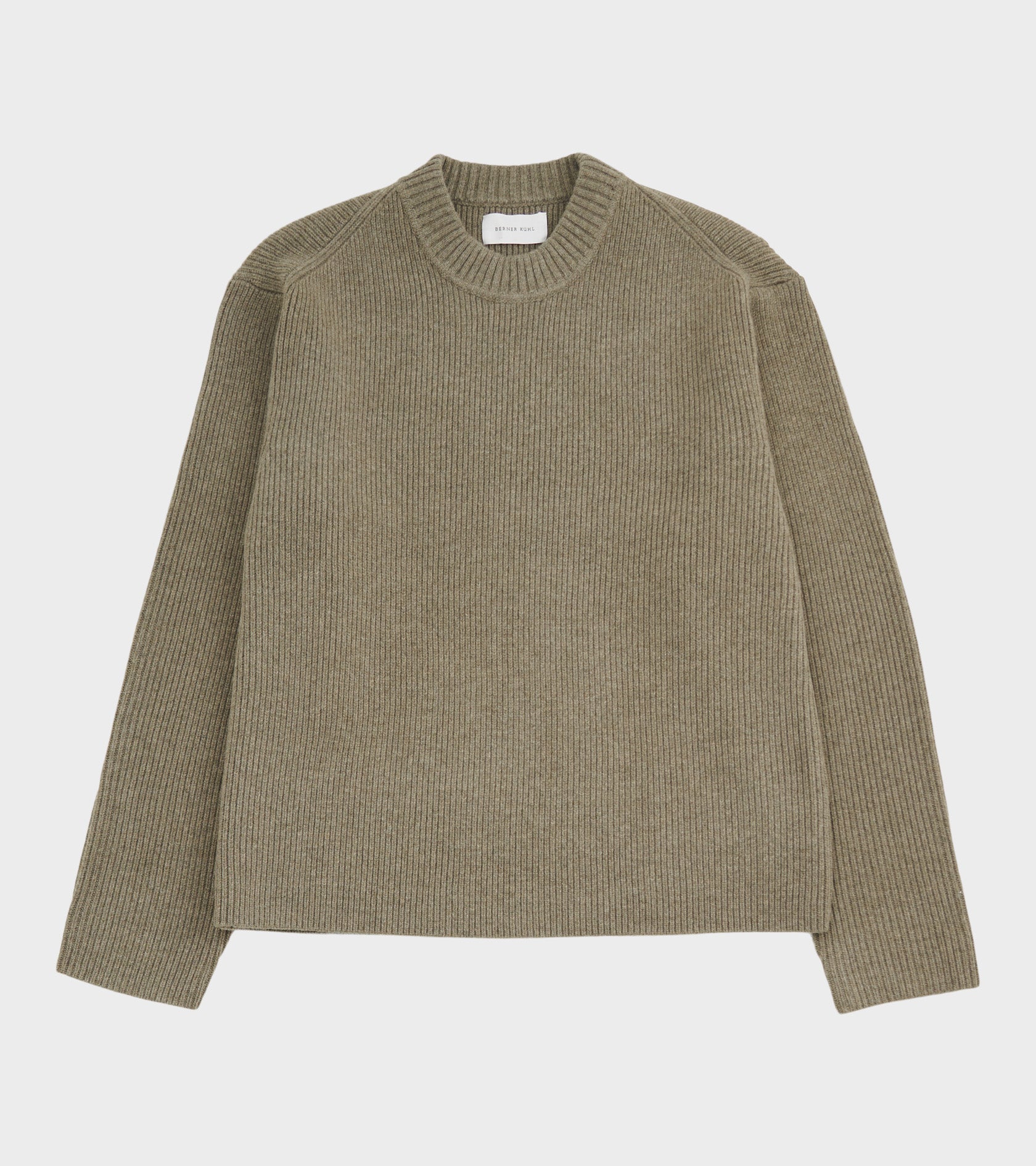 Wool knit in a khaki/dark beige shade from Berner Kühl. The Naval Crew is knitted in a 1x1 rib, which leaves it extra dense and chunky. It has a round rib knitted neck.