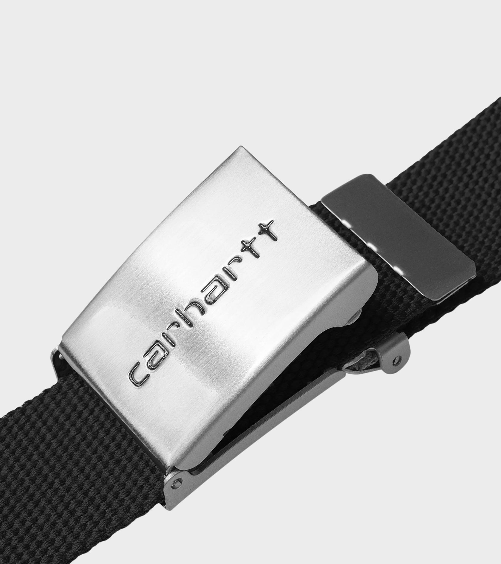 Black belt in polyester canvas from Carhartt WIP. The belt has a metal logo buckle closure.
