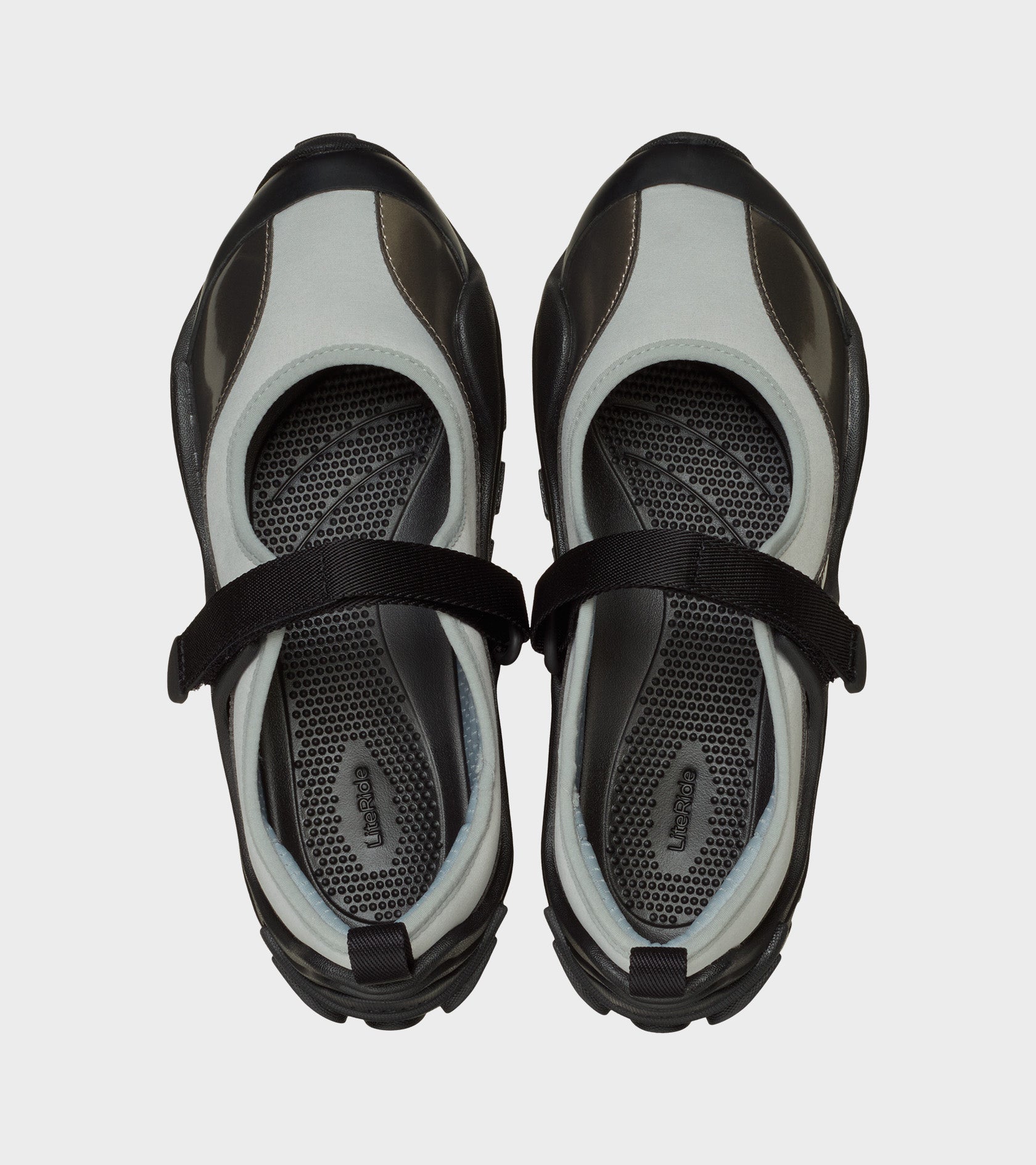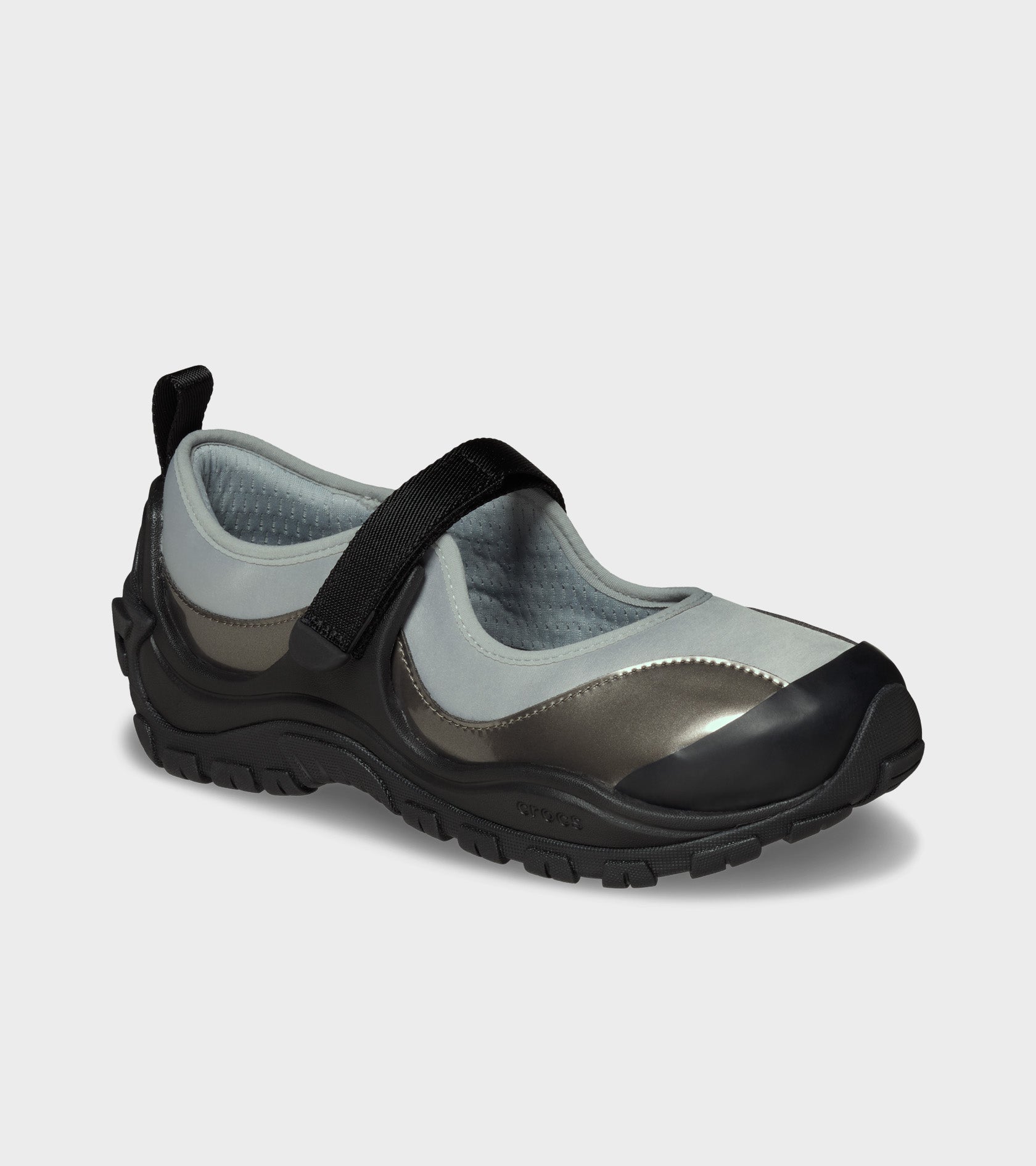Ballerina-inspired sneakers from Crocs. The shoe has a grey upper with black and dark silver details. The shoe has a rubber sole and a Velcro strap closure.