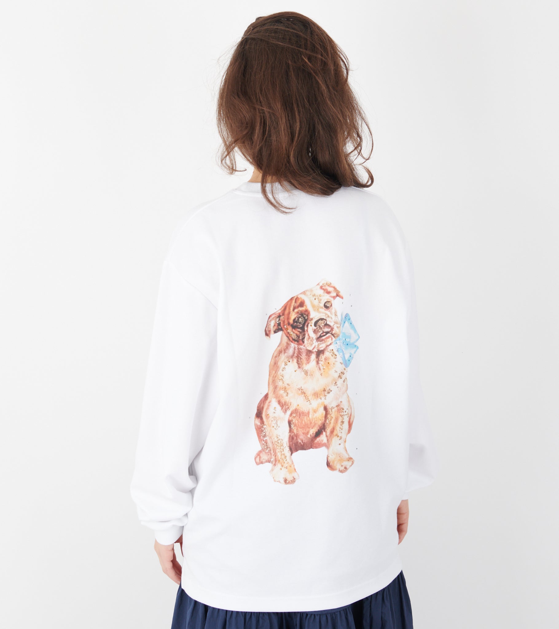 White long-sleeved t-shirt with print from Gabi Gamél. The t-shirt has the text 'My Only Loyal Friend' on the front as well as a dog print and Swarovski rhinestone on the back.