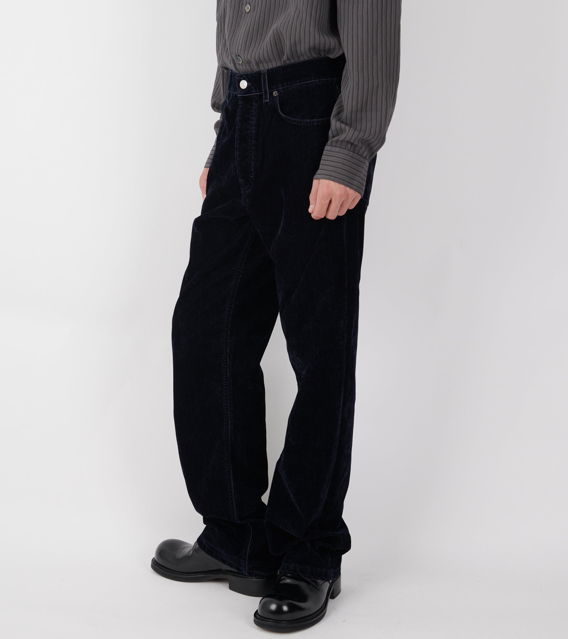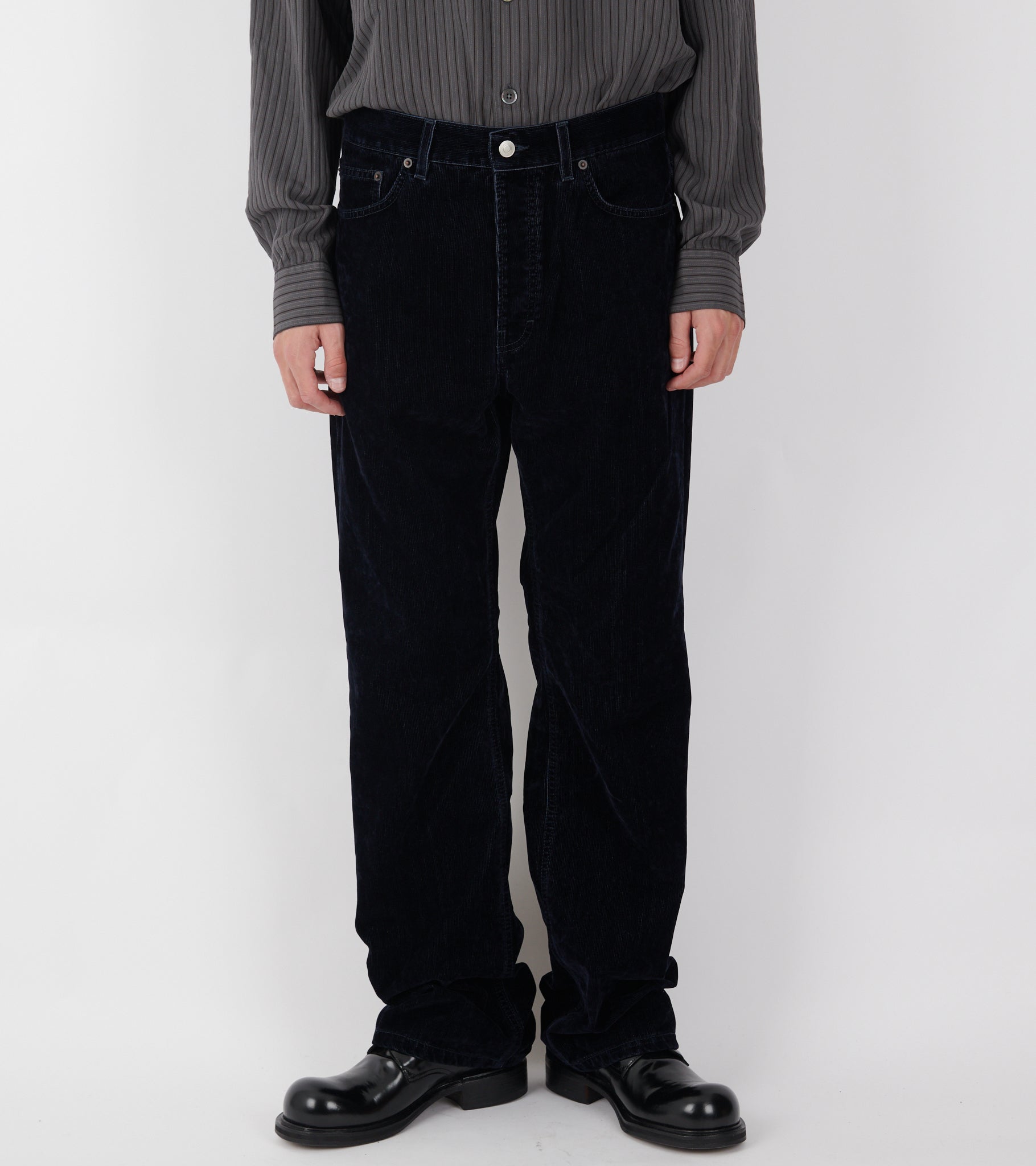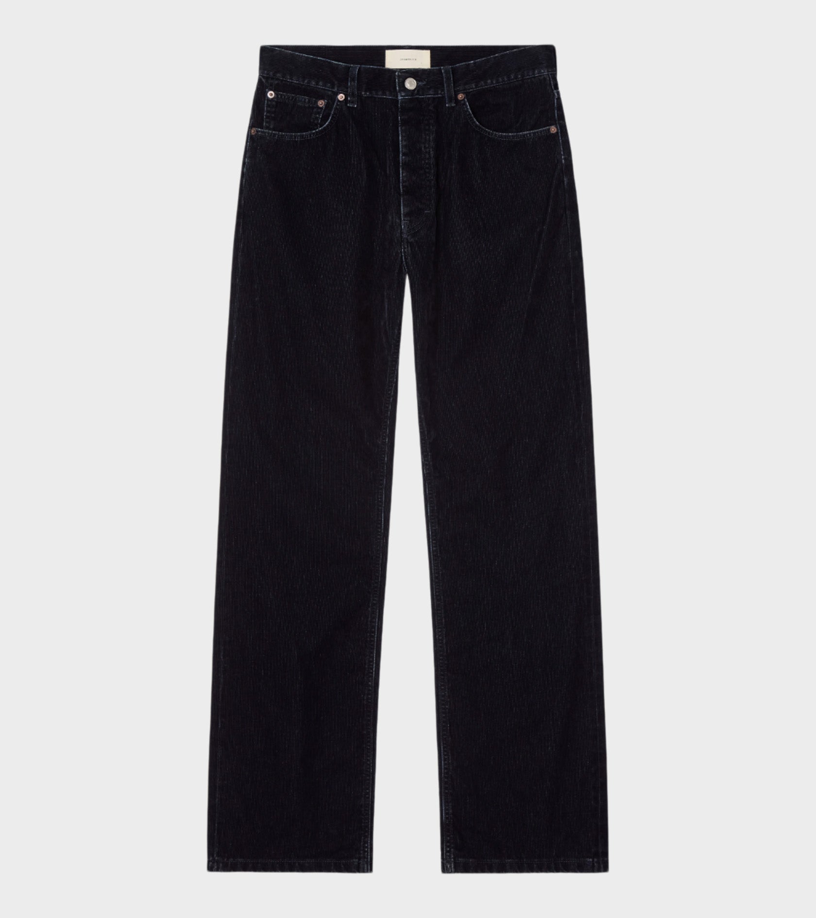 Dark blue pants from Jeanerica. Vega Corduroy Pants are made of soft cotton corduroy with a jeans look. It has three slant pockets and two back pockets. The fit is relaxed with wide straight legs.