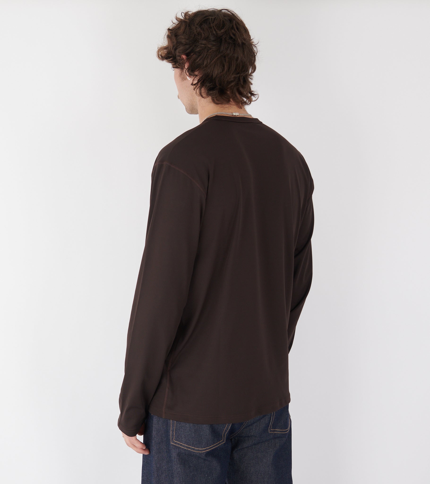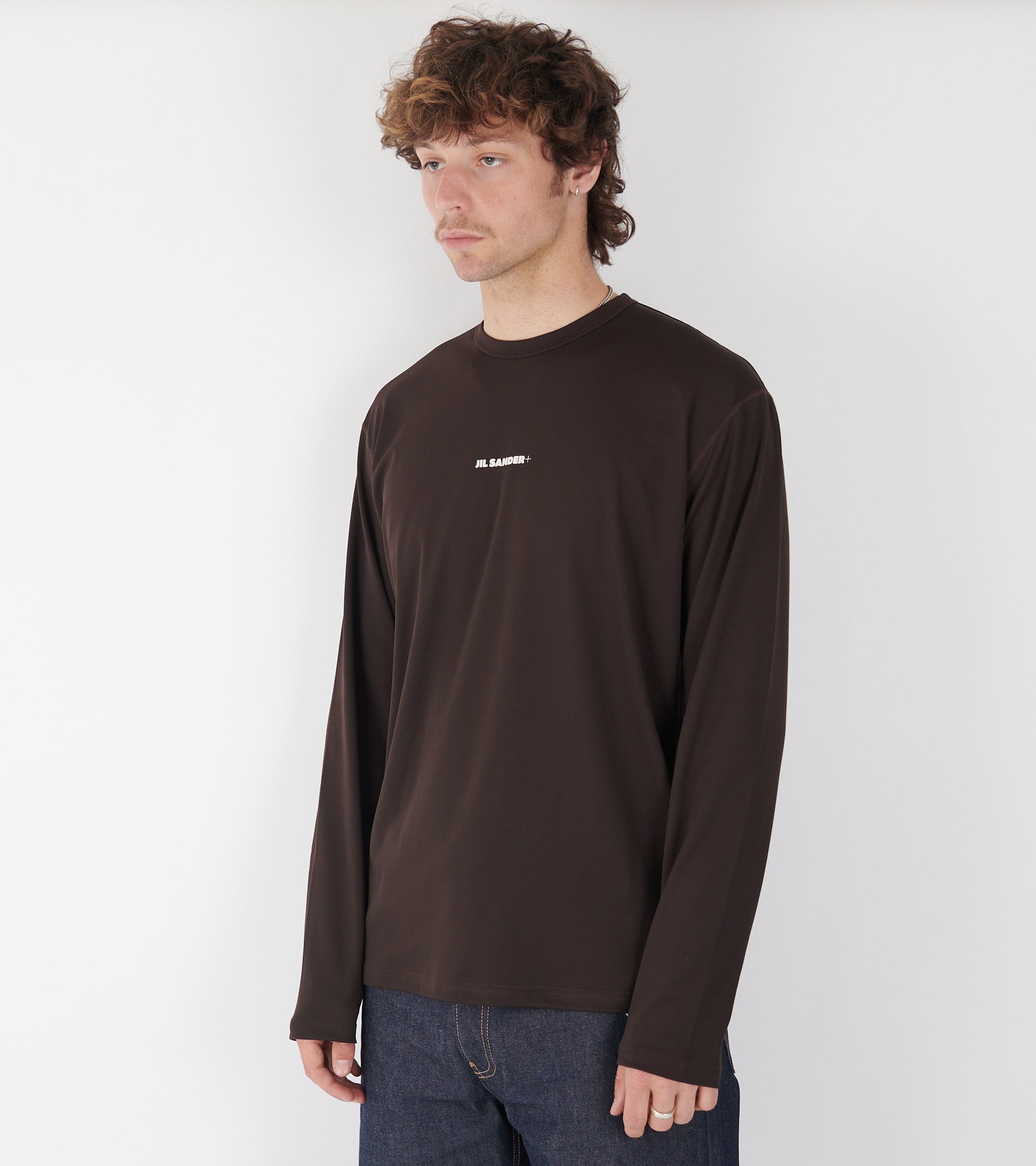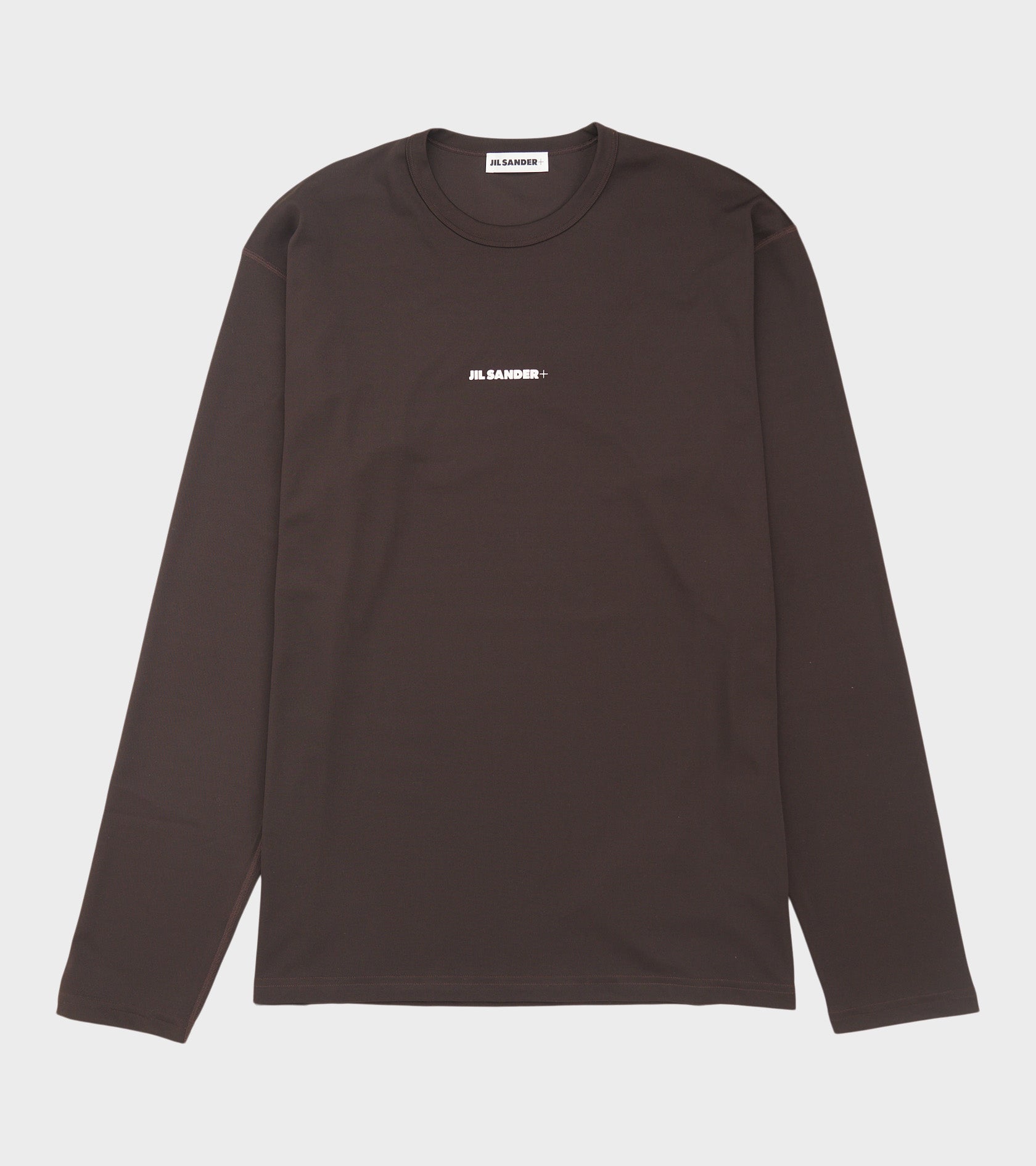 Brown blouse from Jil Sander. This blouse is made of a stretchy material and has a white printed logo on the front.