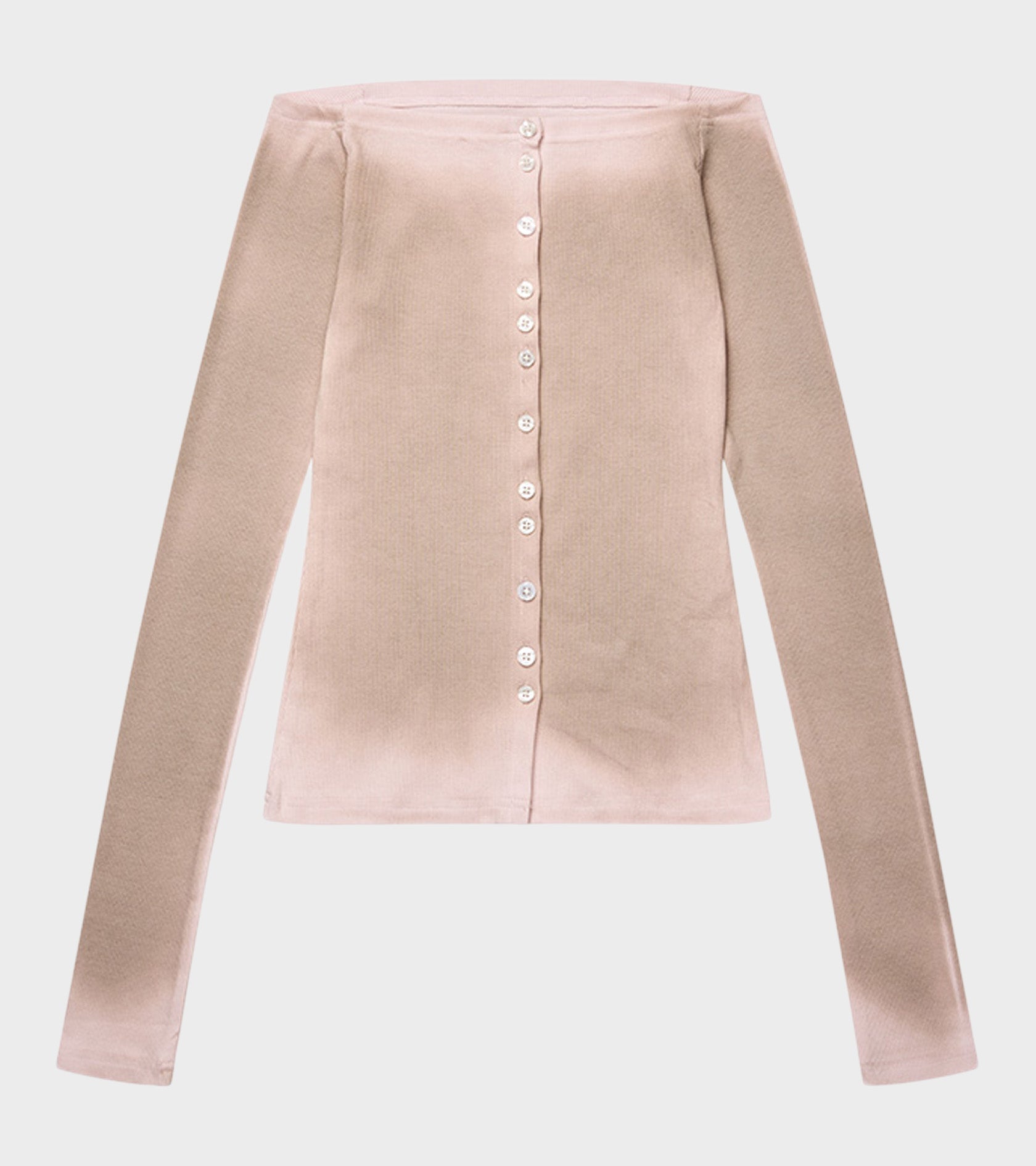 Matilda Cardigan from Kernemilk. This cardigan is made from an organic cotton blend and has a distressed dye effect in light pink and beige shades. It has an off-shoulder design and a button closure on the front.