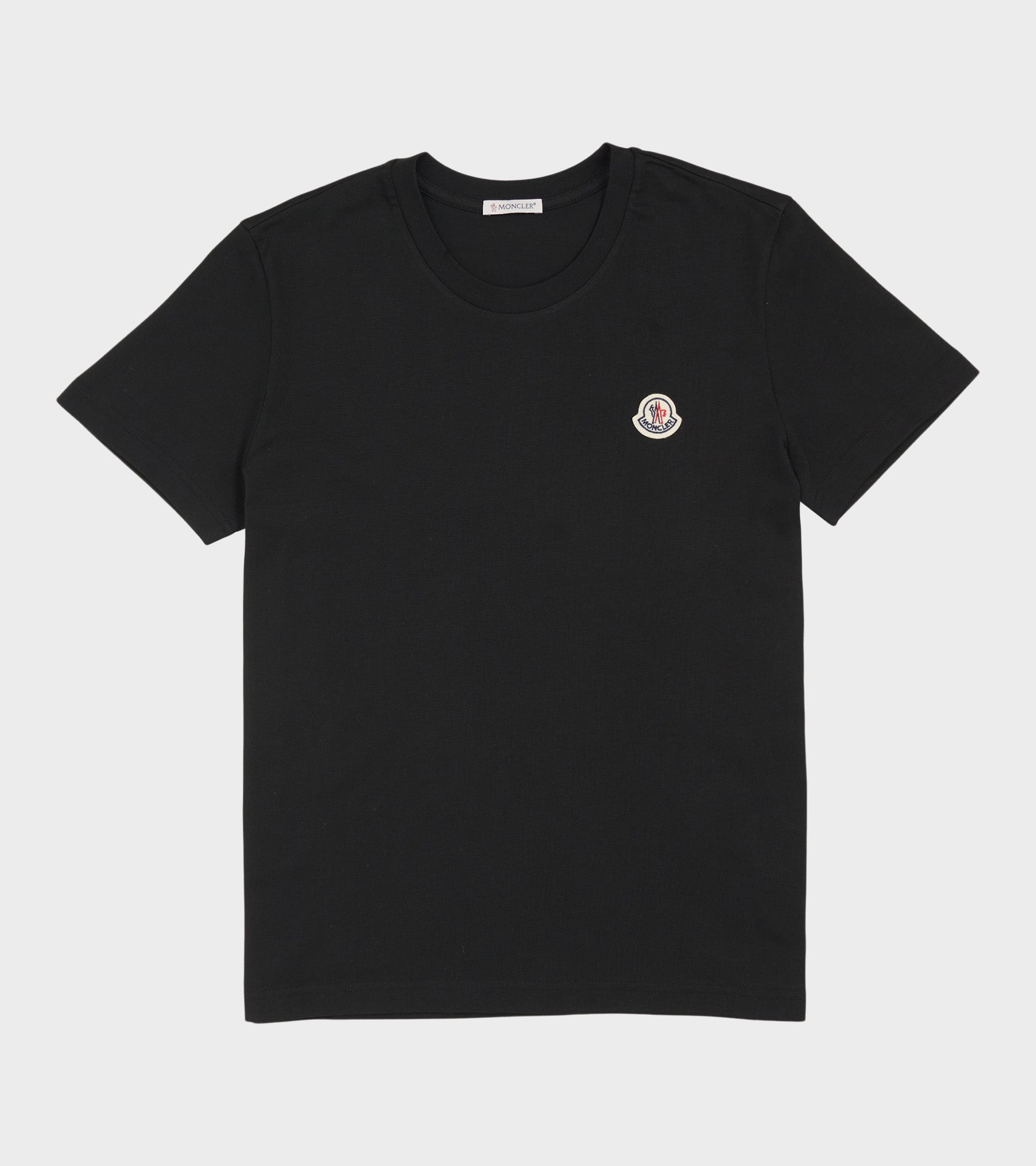 Classic black t-shirt from Moncler. By the left chest is the iconic logo in felt.