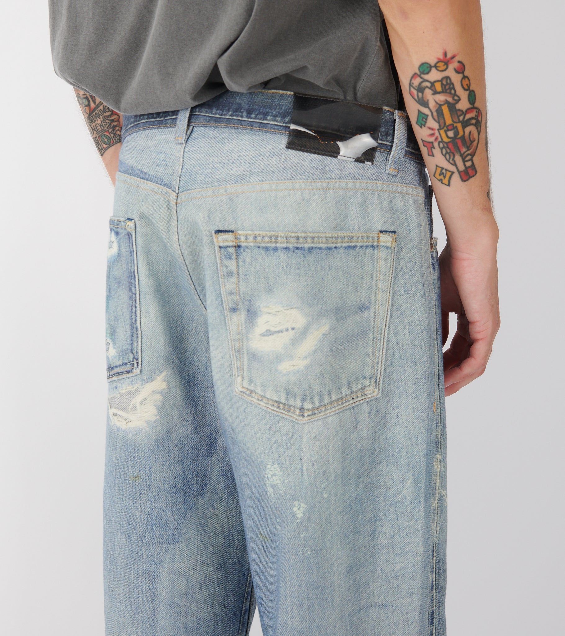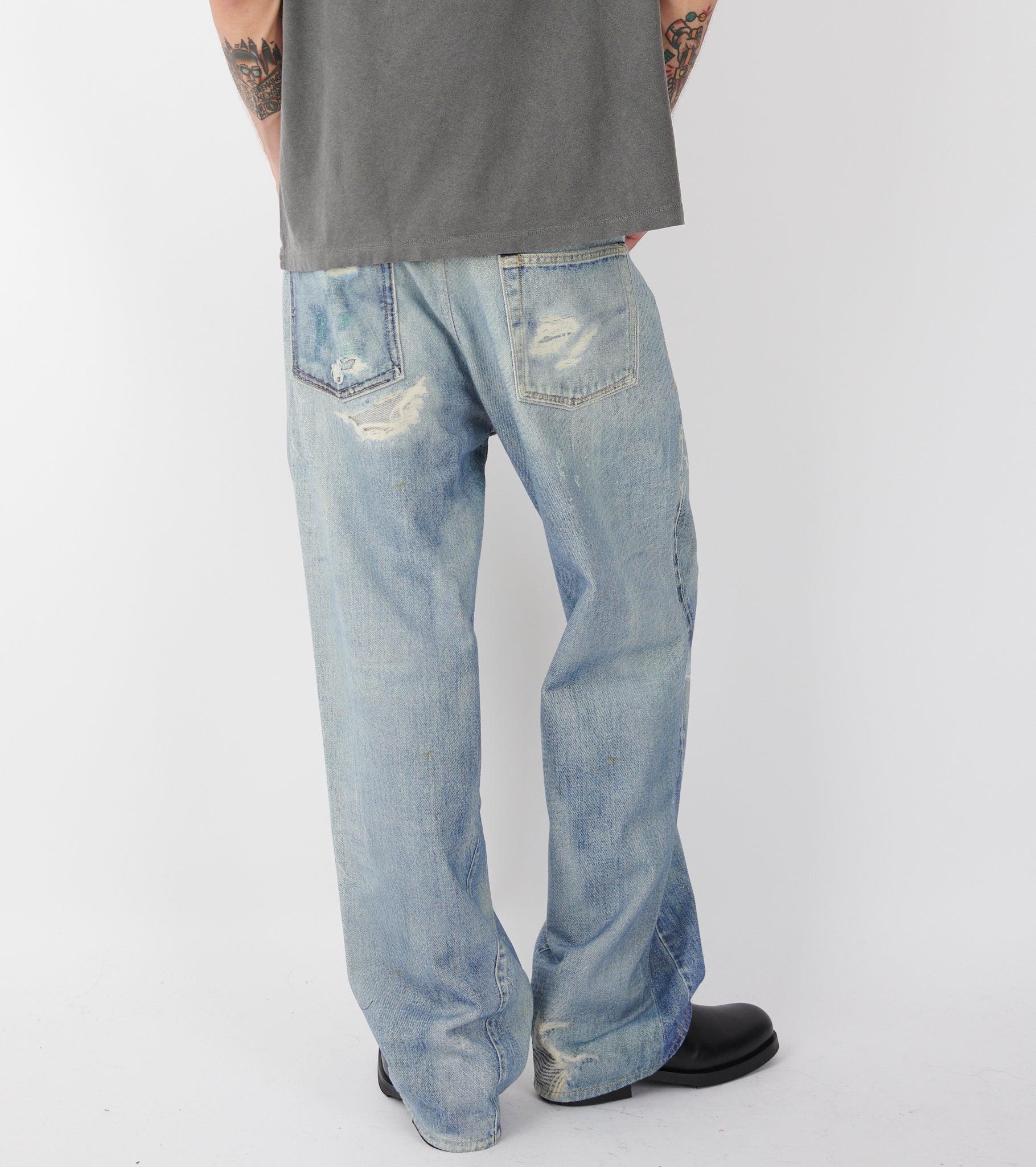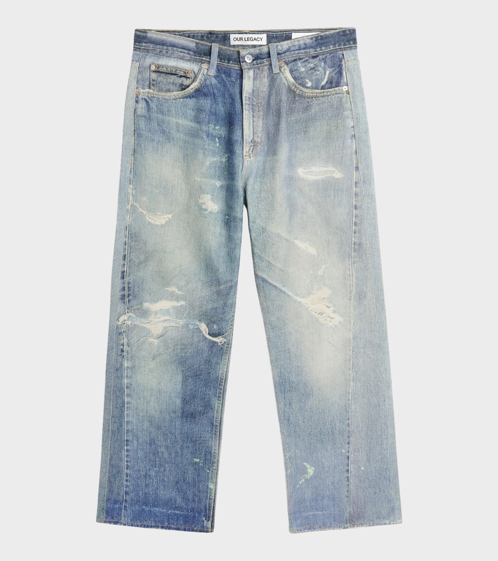 Blue jeans with a distressed print from Our Legacy. These jeans are made from an Italian cotton denim and have belt loops, three slant pockets on the front and two back pockets. At the top of the back is a logo tag. They are made in Portugal and have a loose fit with straight legs.