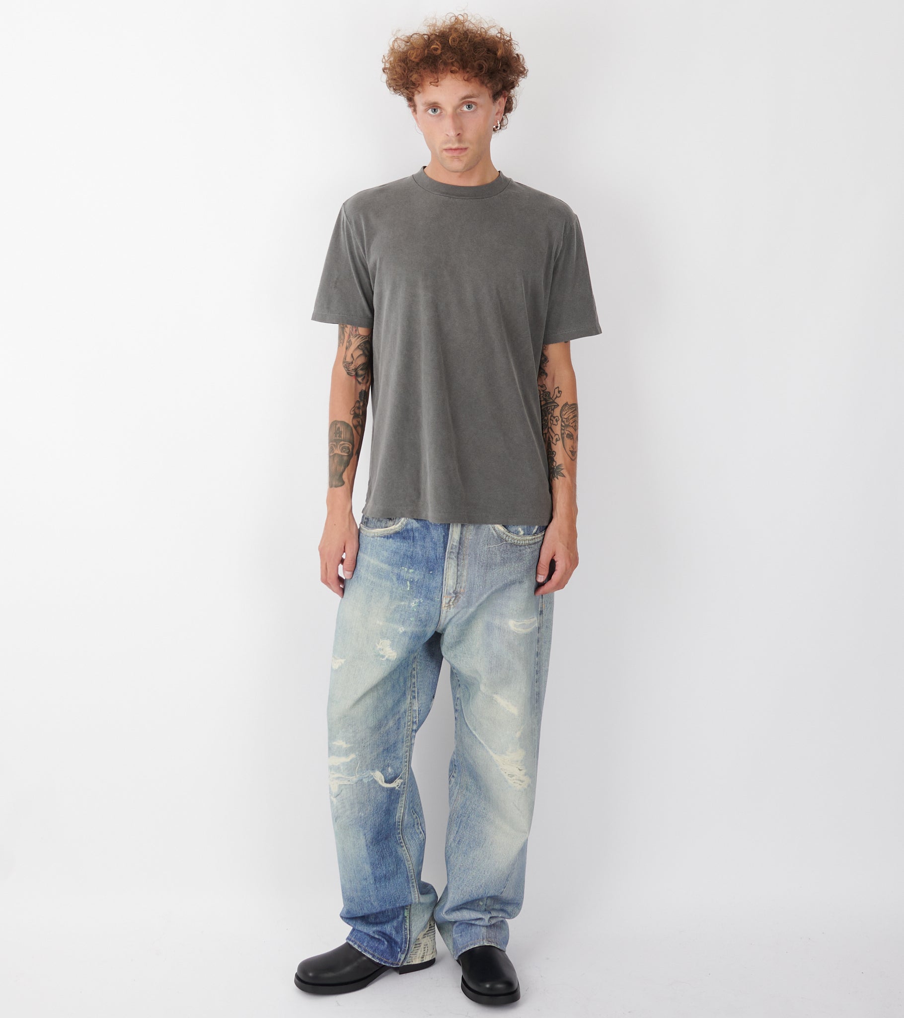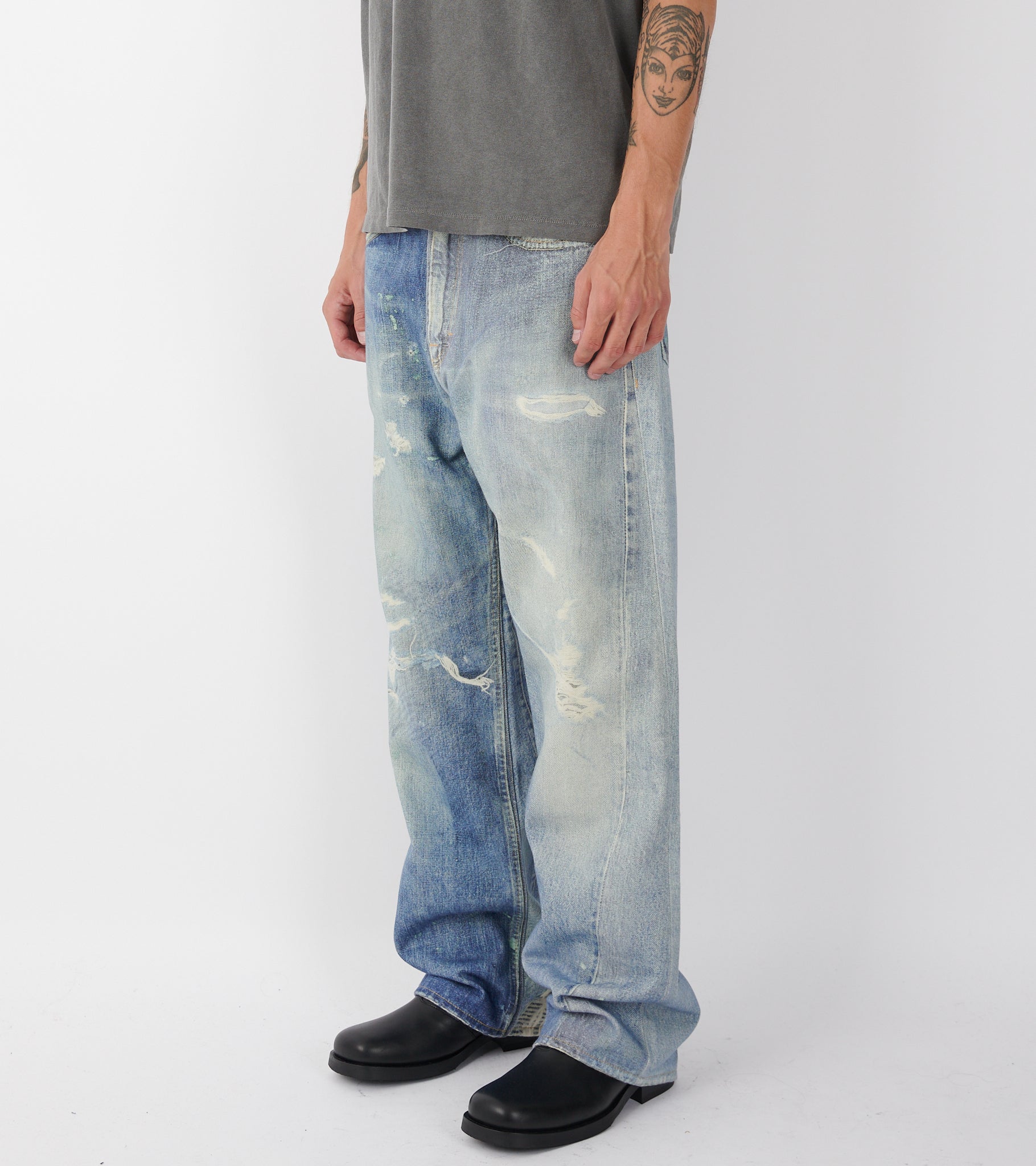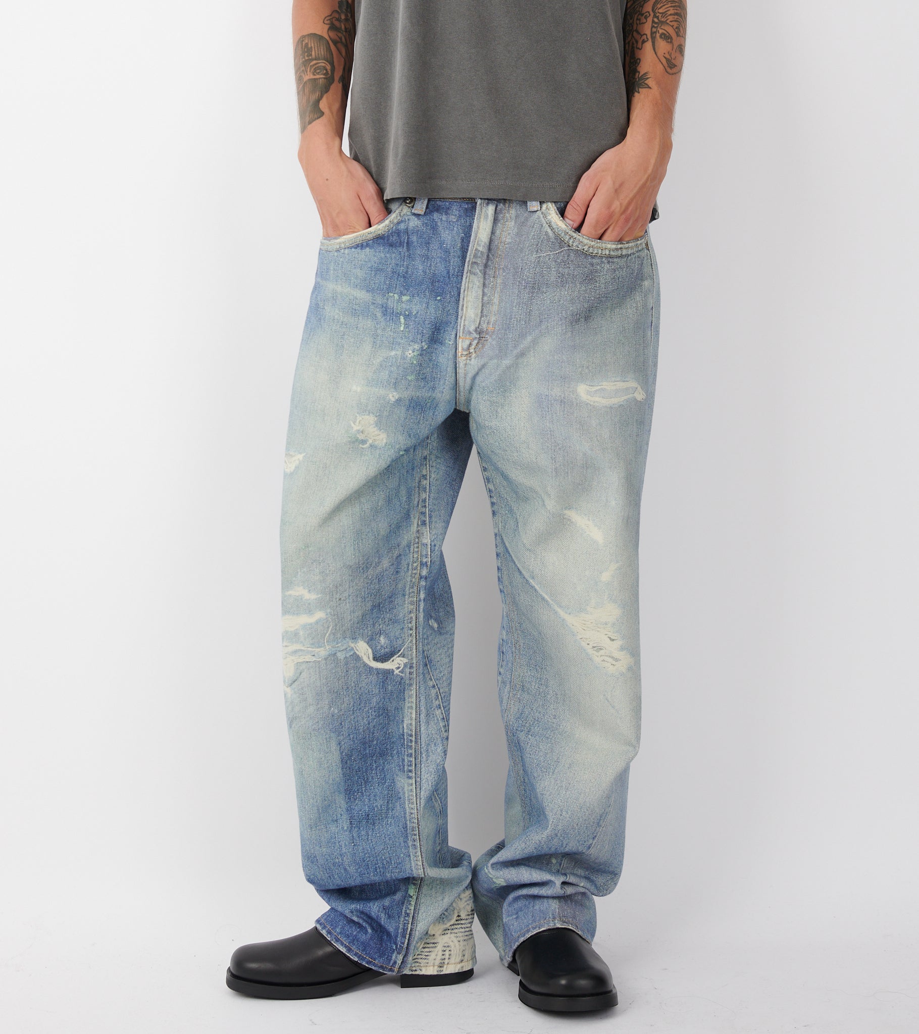 Blue jeans with a distressed print from Our Legacy. These jeans are made from an Italian cotton denim and have belt loops, three slant pockets on the front and two back pockets. At the top of the back is a logo tag. They are made in Portugal and have a loose fit with straight legs.