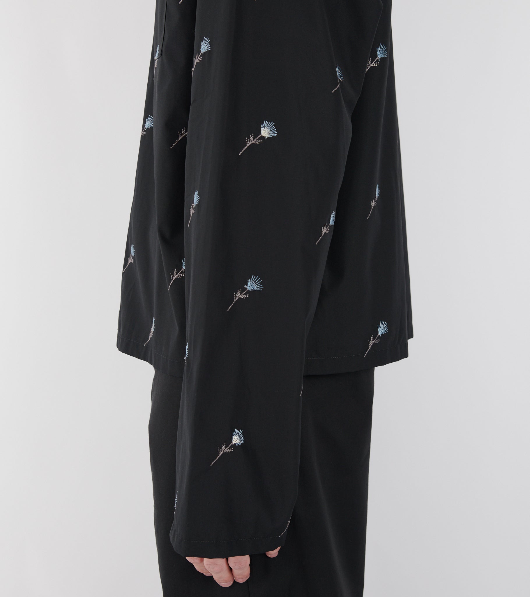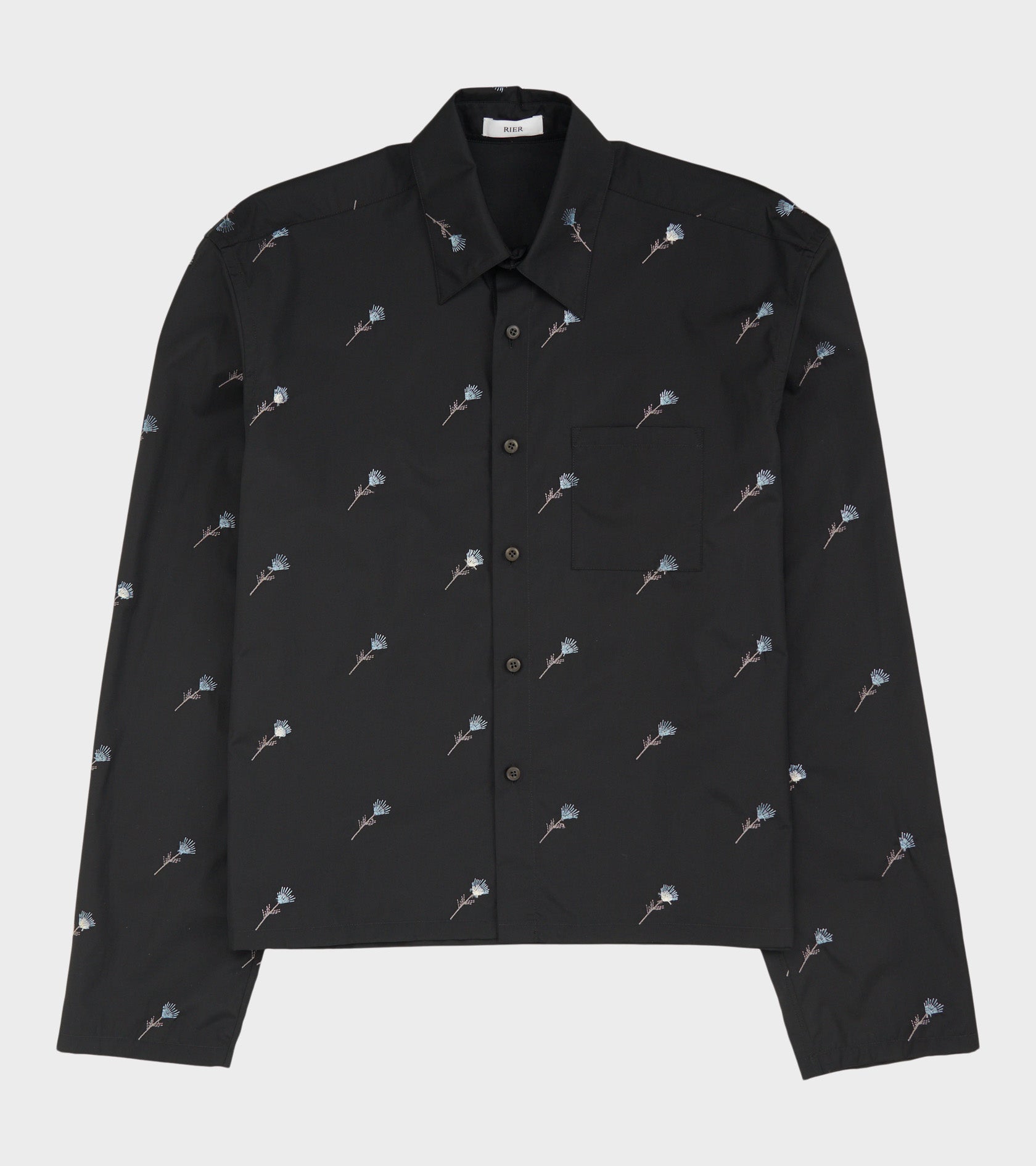 Black shirt in cotton poplin with embroidered flowers from Rier.