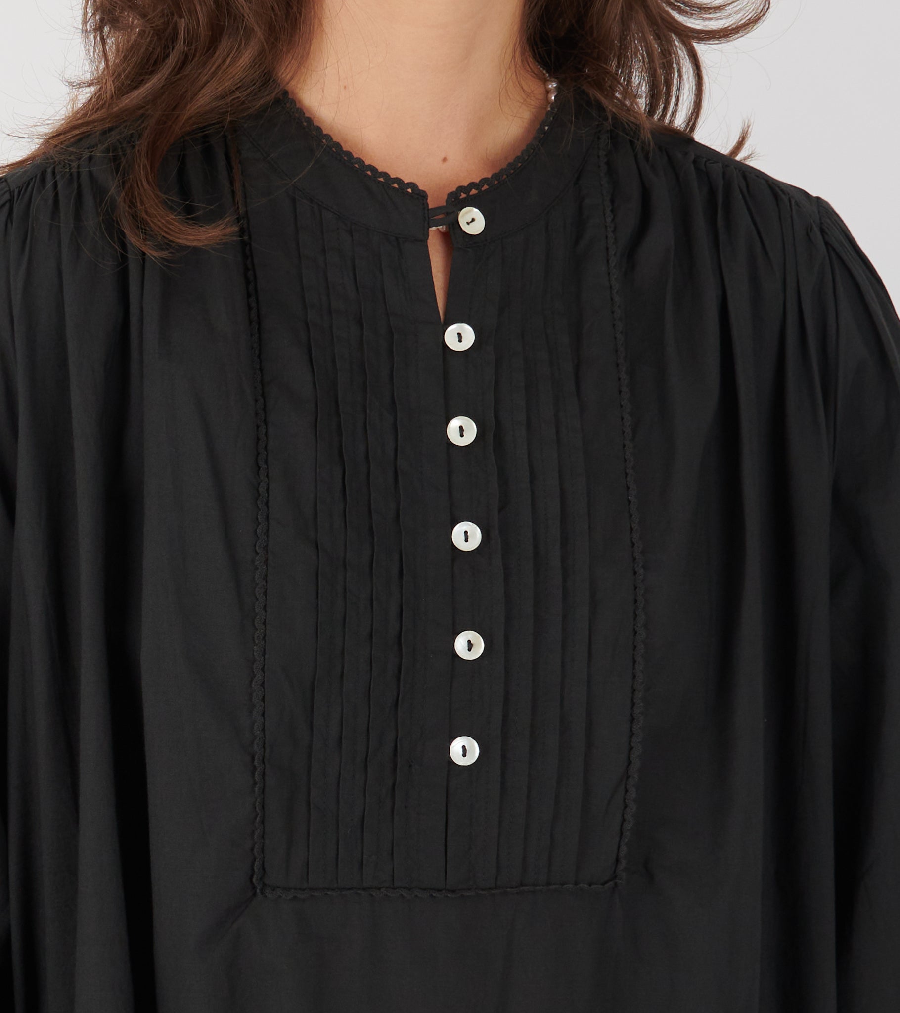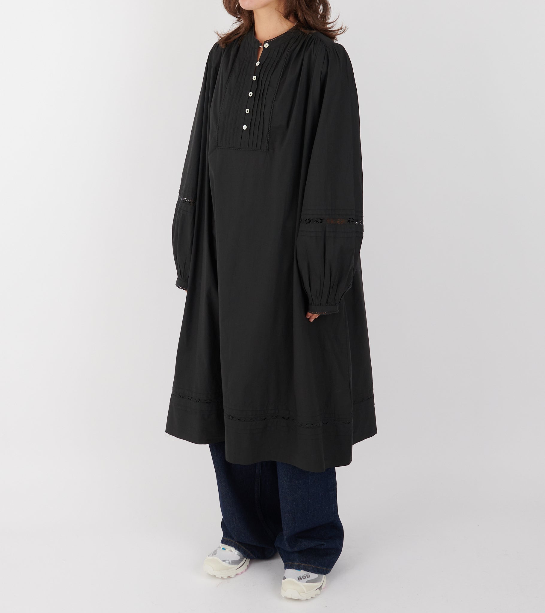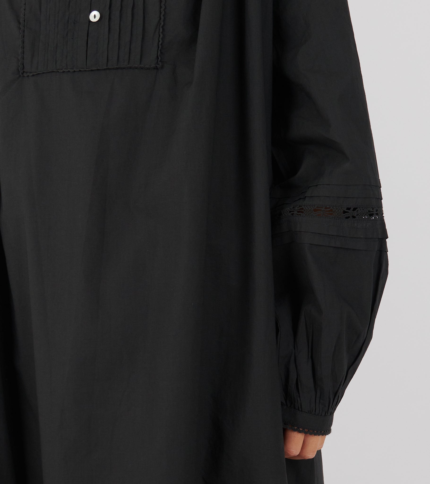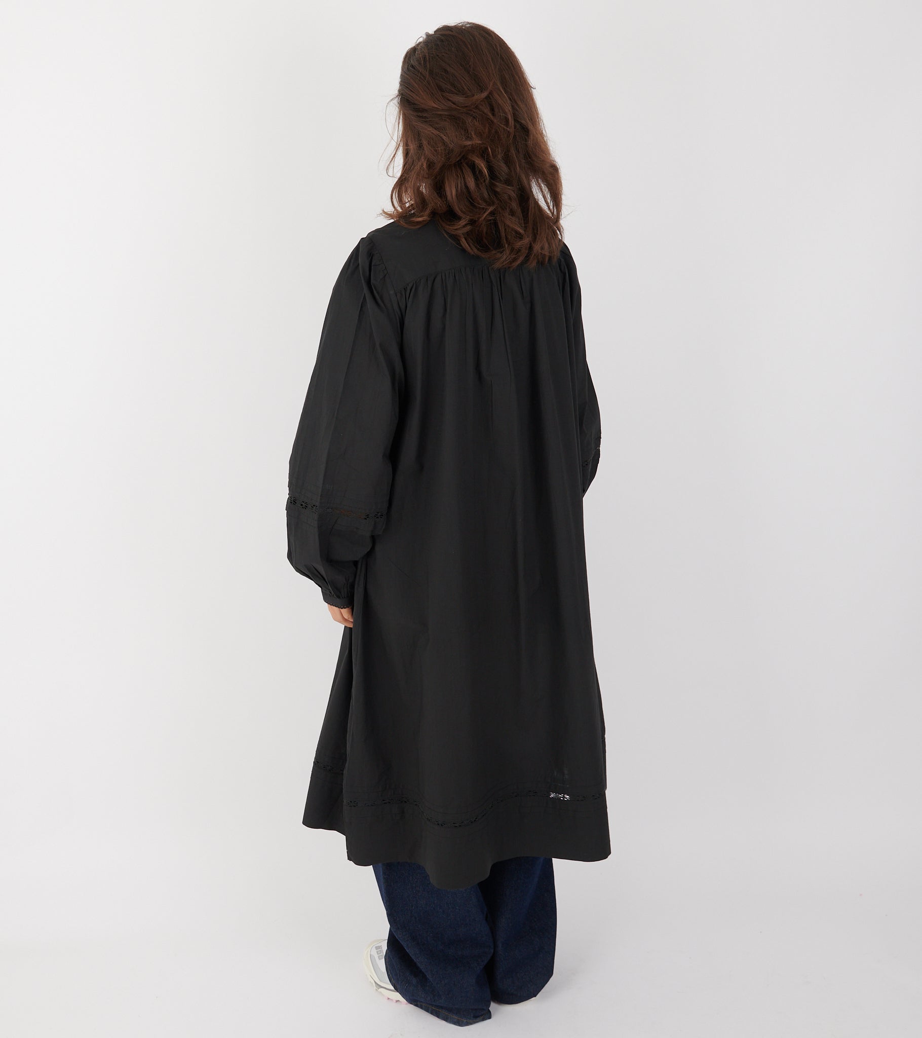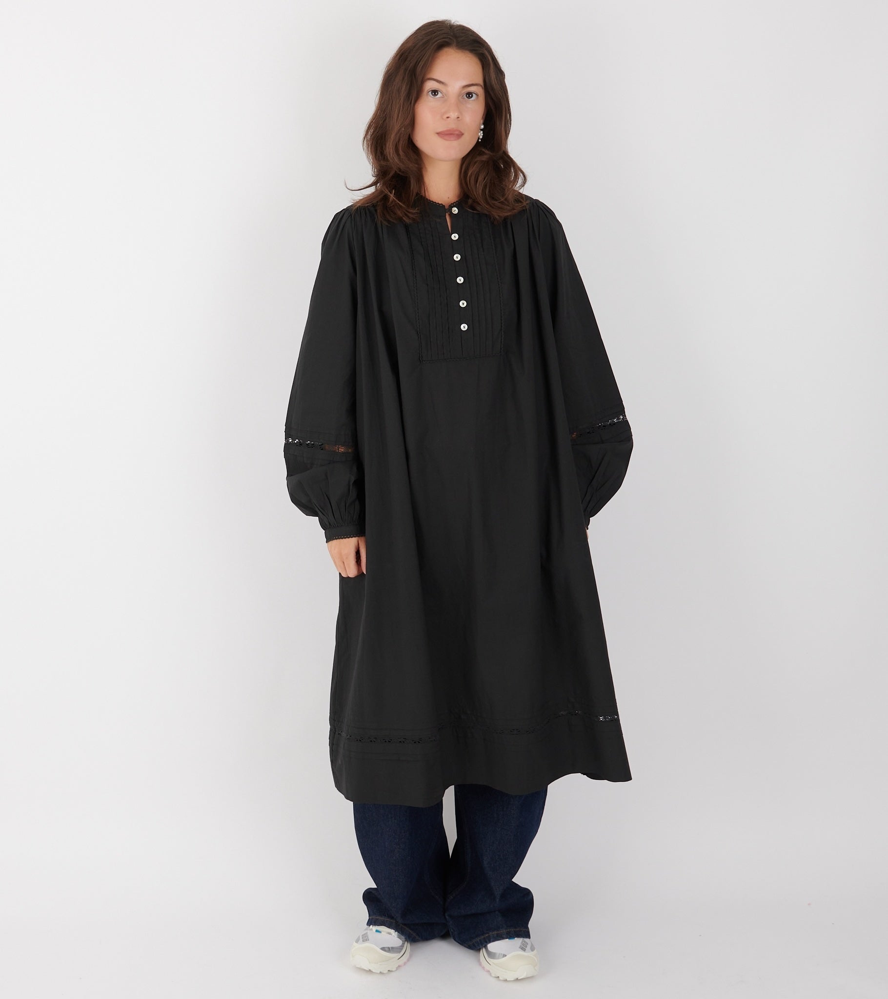 Black mid-length shirtdress in organic cotton from Skall Studio. The Leaf Shirtdress has a round collar, a pintuck detail on the front and a button closure with mother-of-pearl buttons. The dress is detailed with laces and has pleats at the sleeves, giving them a balloon-sleeve silhouette.