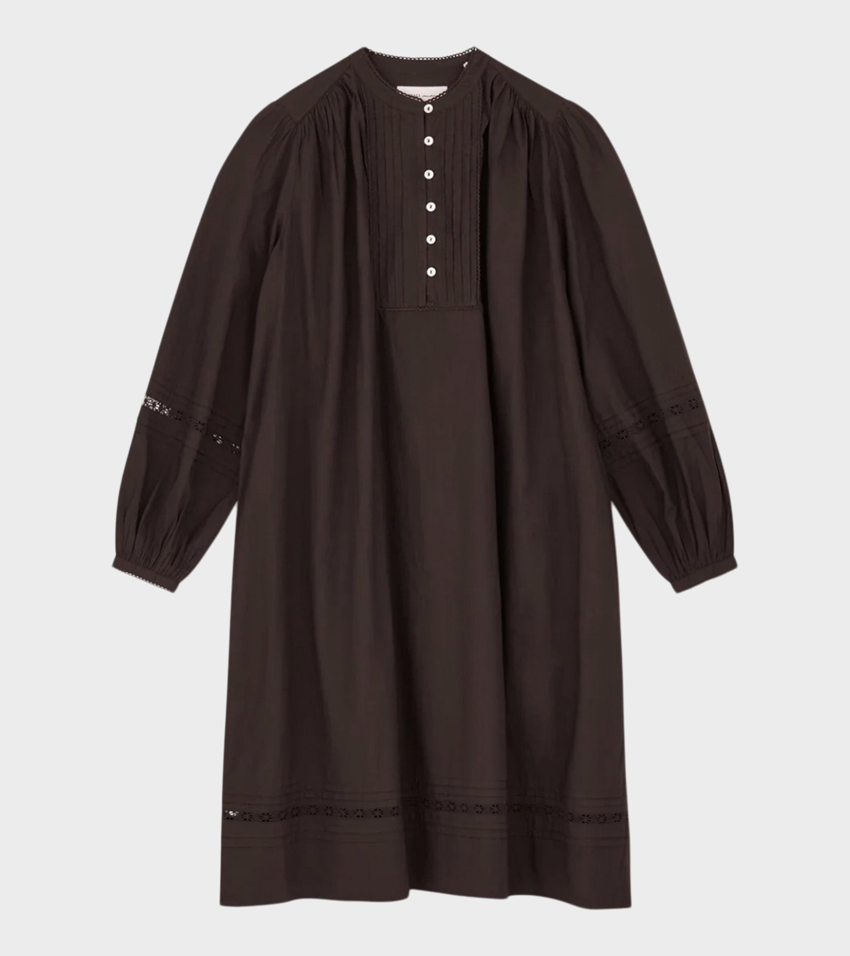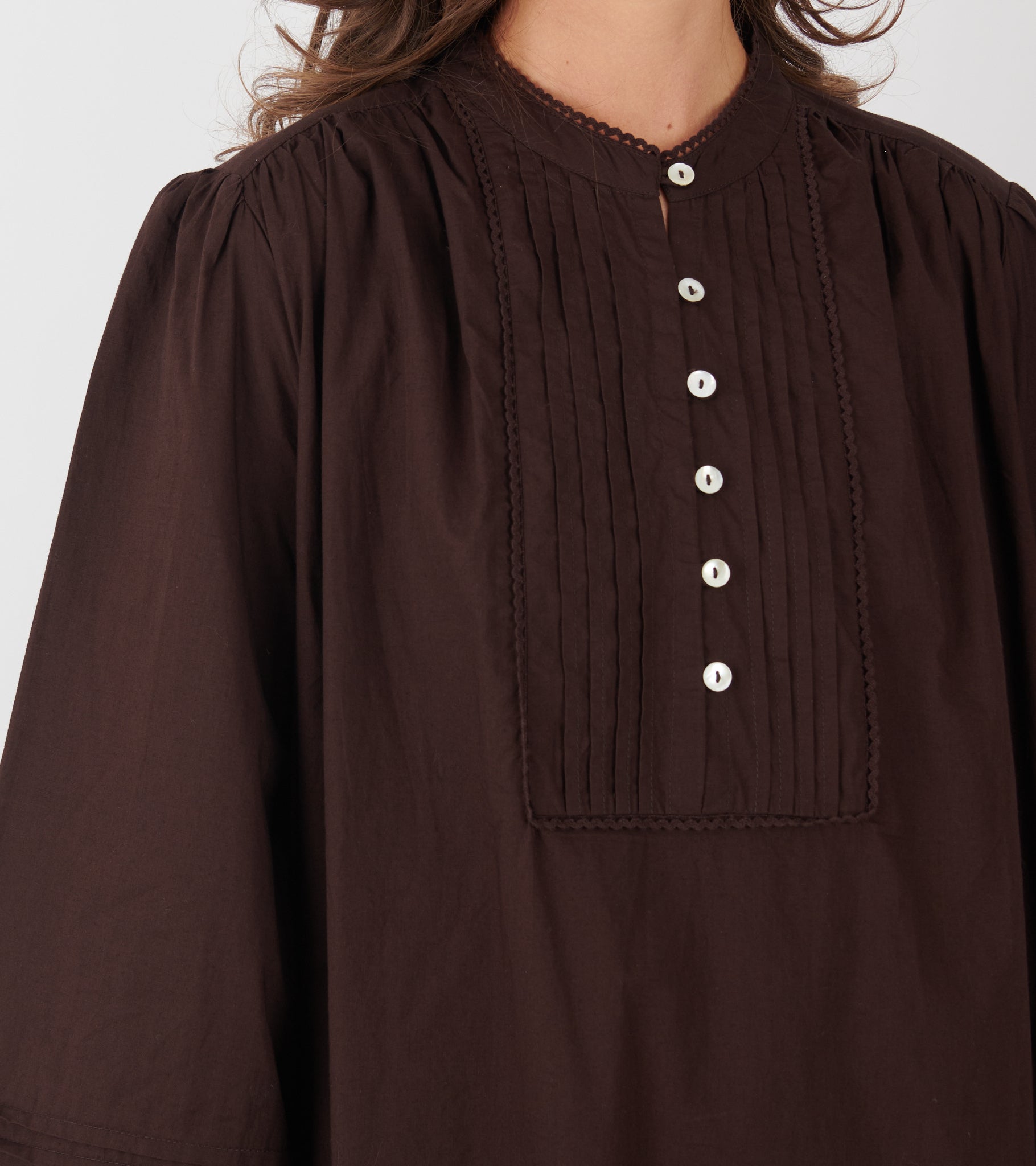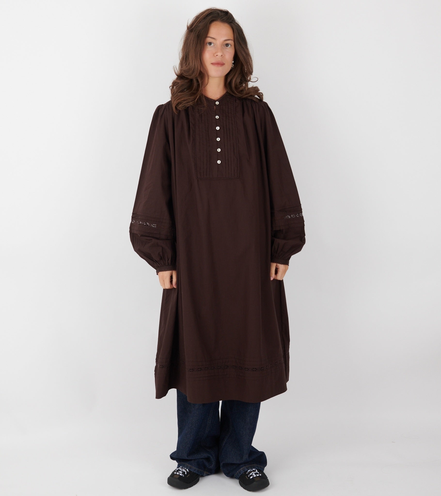Dark brown mid-length shirtdress in organic cotton from Skall Studio. The Leaf Shirtdress features a round collar, a pintuck detail on the front and a button closure with mother-of-pearl buttons. The dress is detailed with laces and has pleats at the sleeves, giving them a balloon-sleeve silhouette.