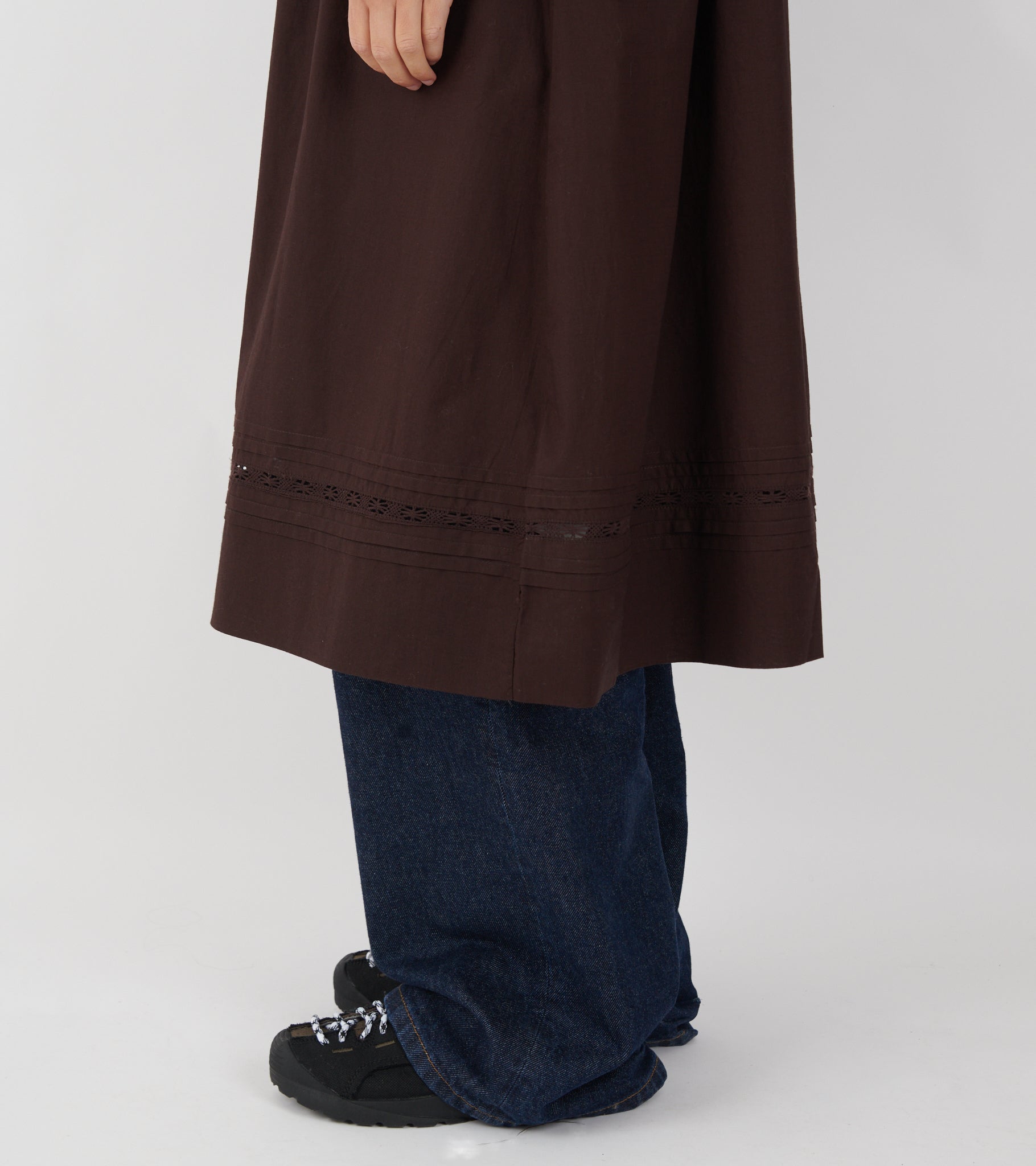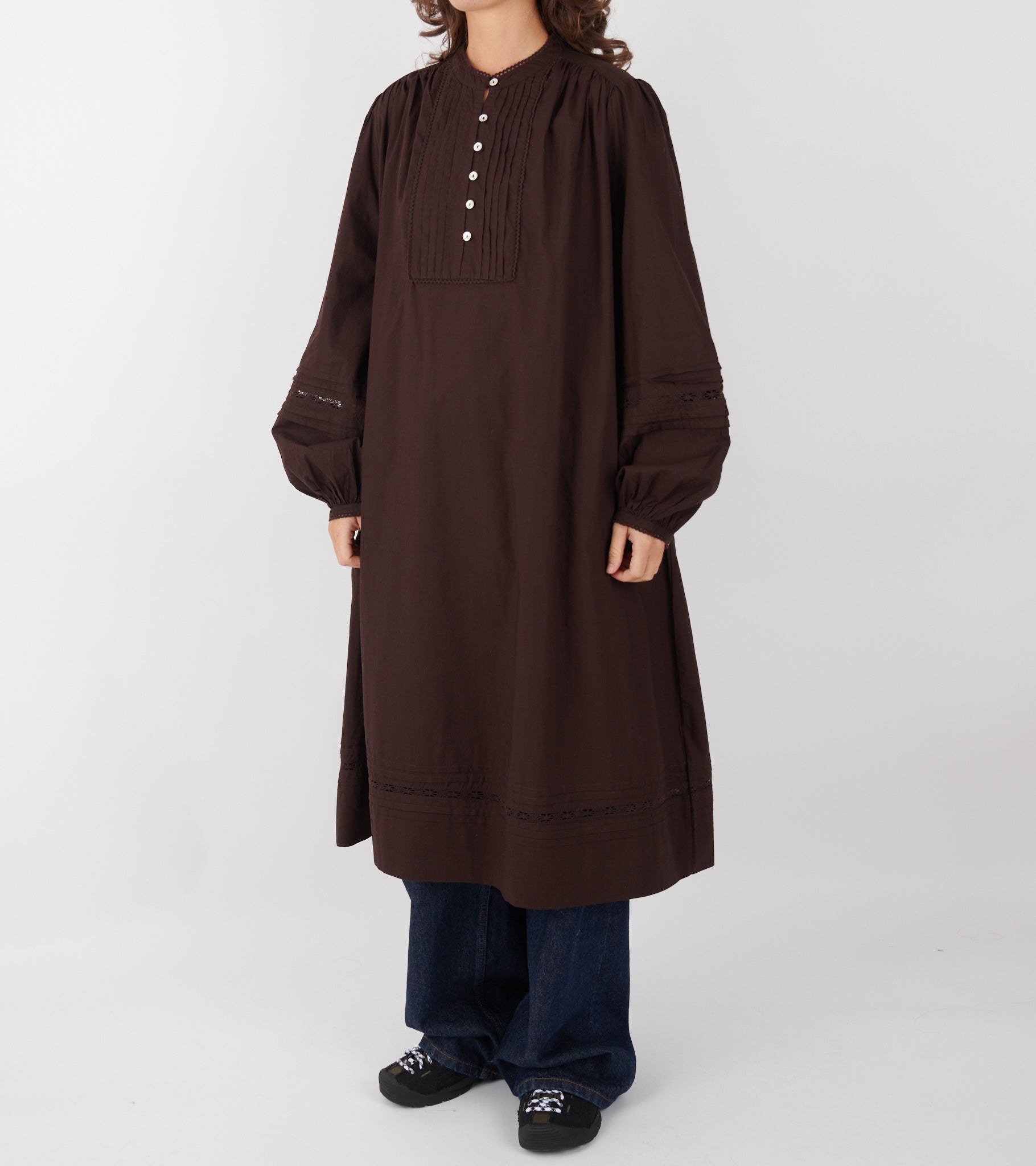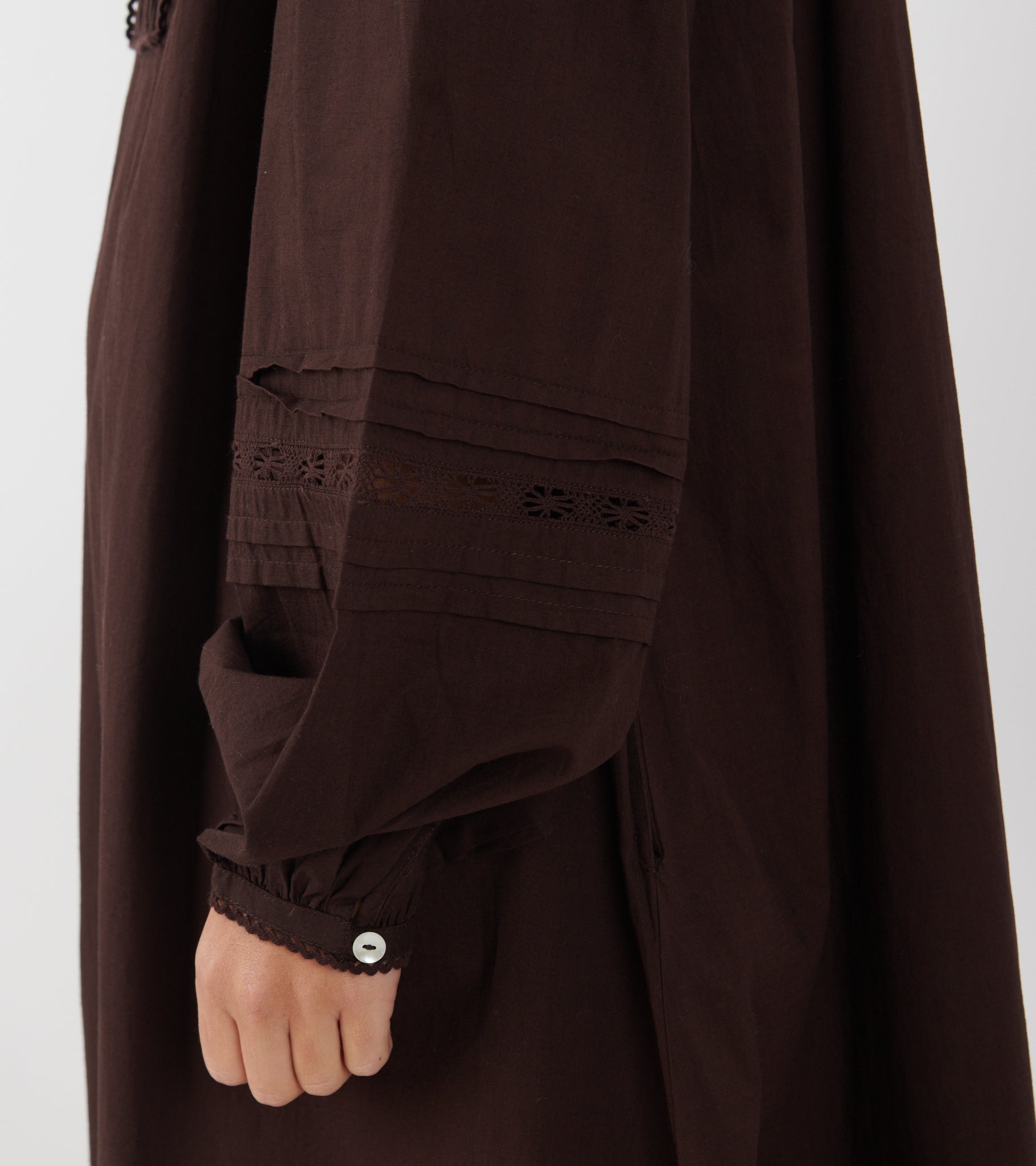 Dark brown mid-length shirtdress in organic cotton from Skall Studio. The Leaf Shirtdress features a round collar, a pintuck detail on the front and a button closure with mother-of-pearl buttons. The dress is detailed with laces and has pleats at the sleeves, giving them a balloon-sleeve silhouette.