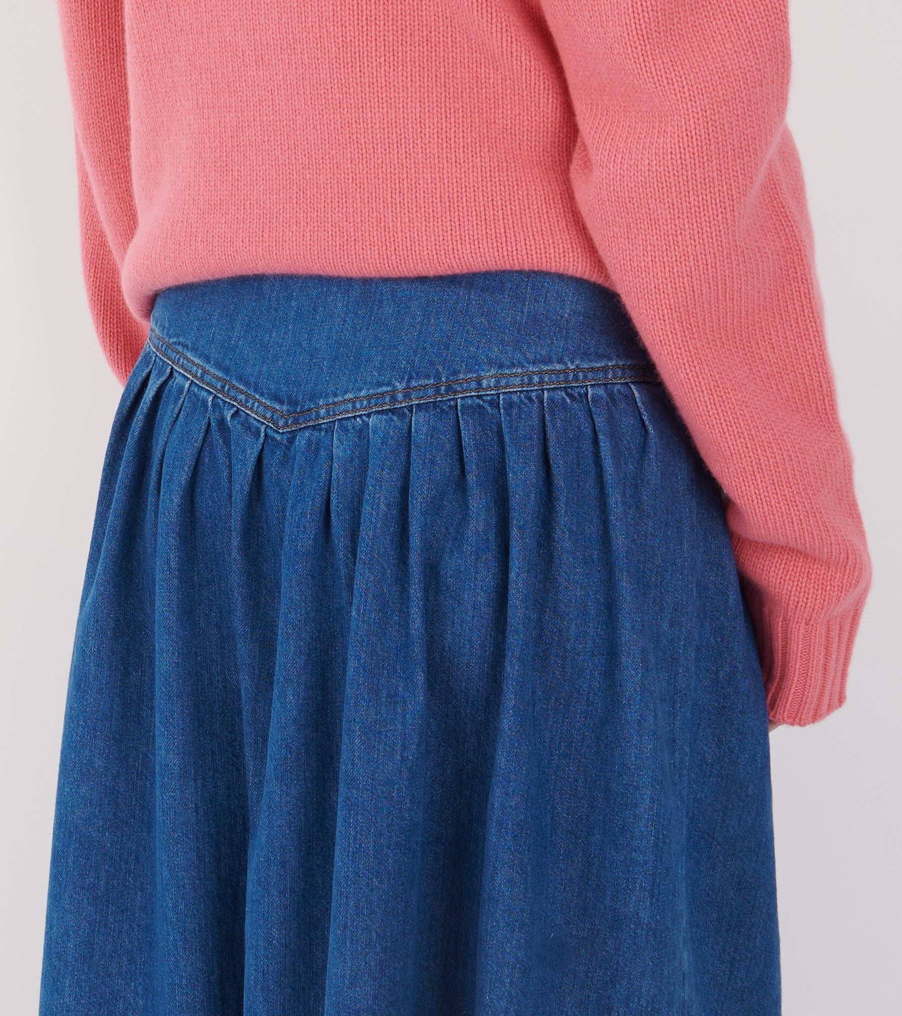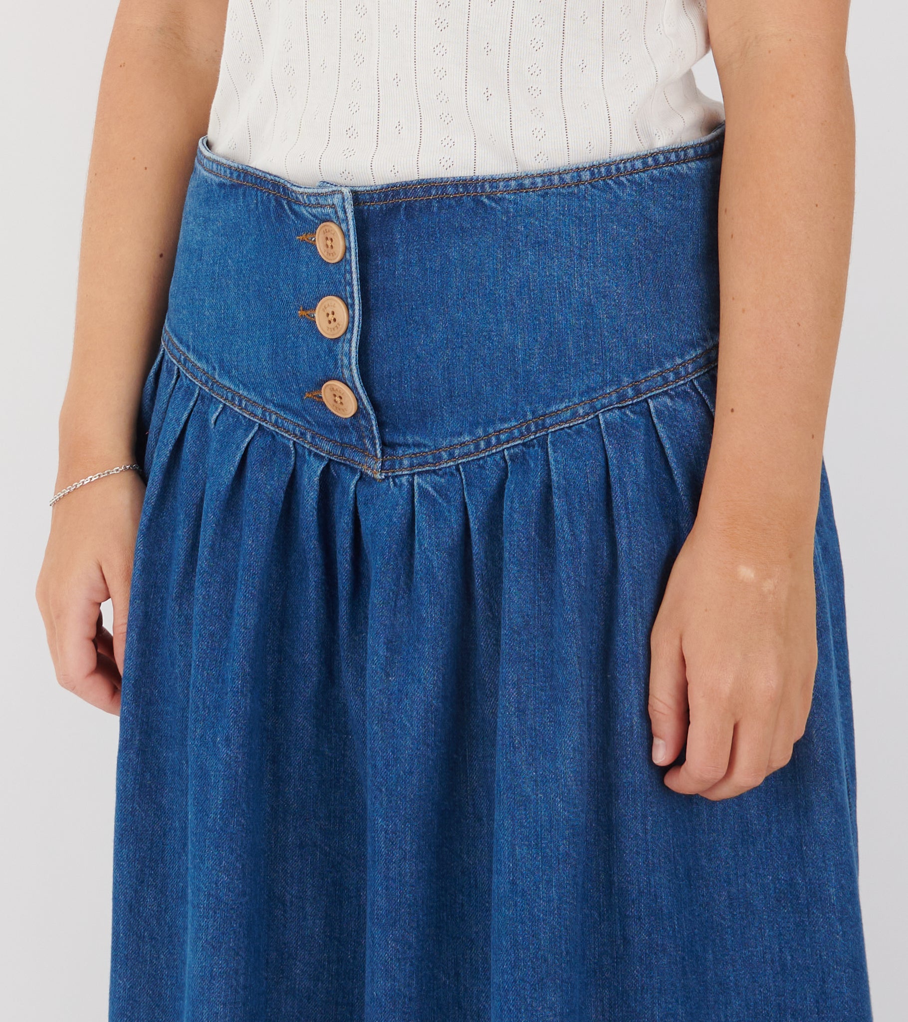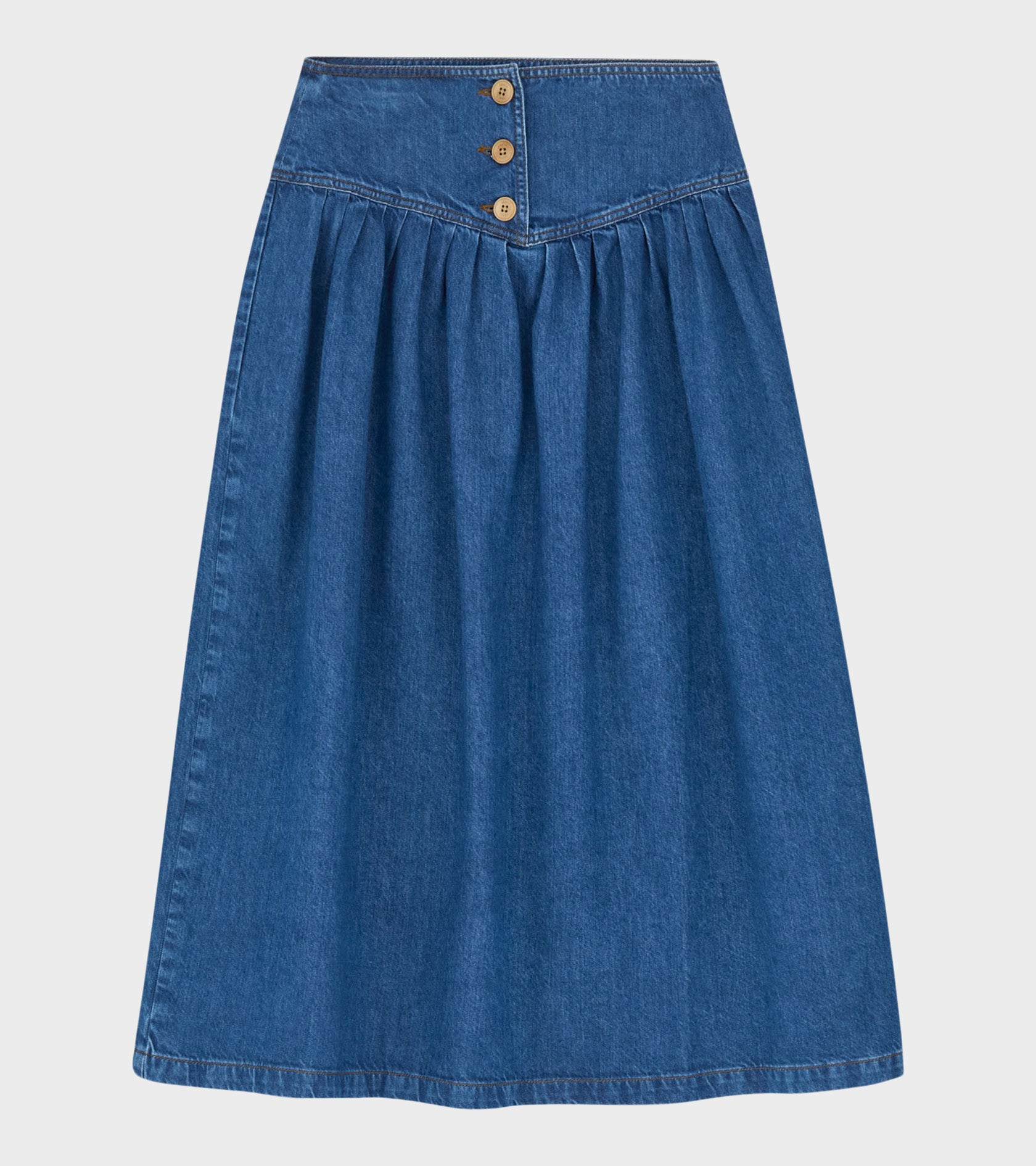 Skirt in organic cotton denim from Skall Studio. Dolly Skirt has a wide waistband with pleats and closes with three wooden buttons.