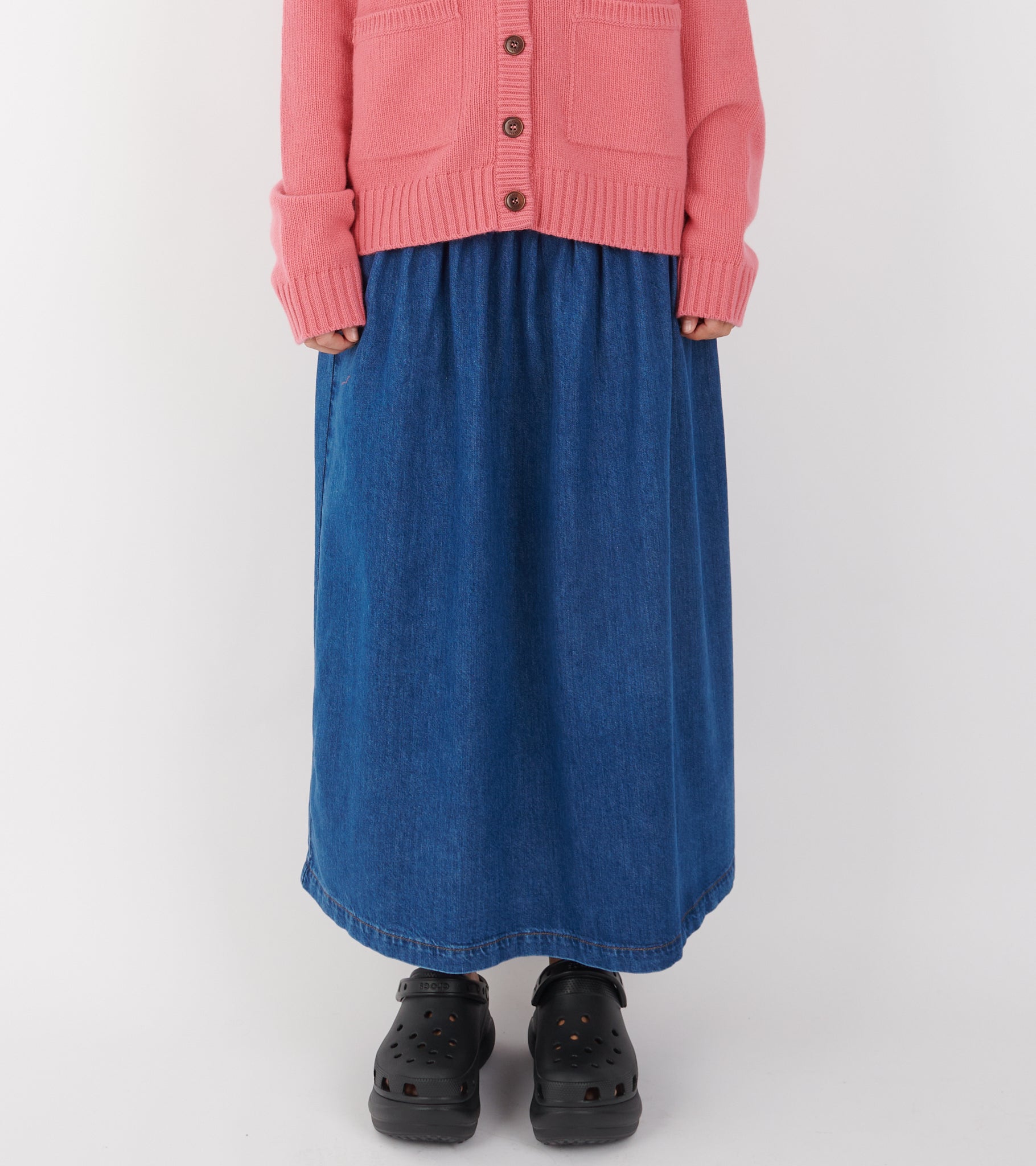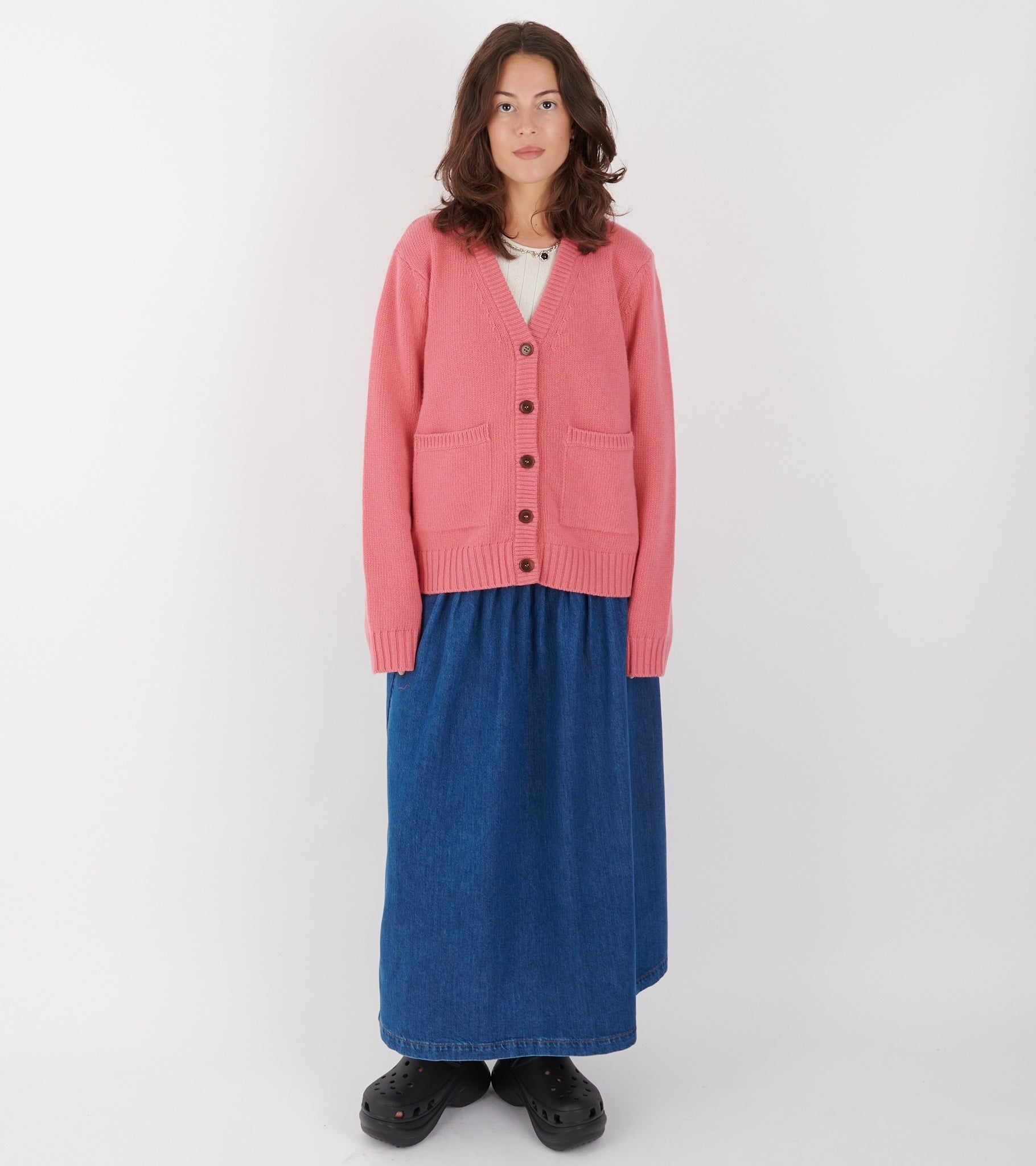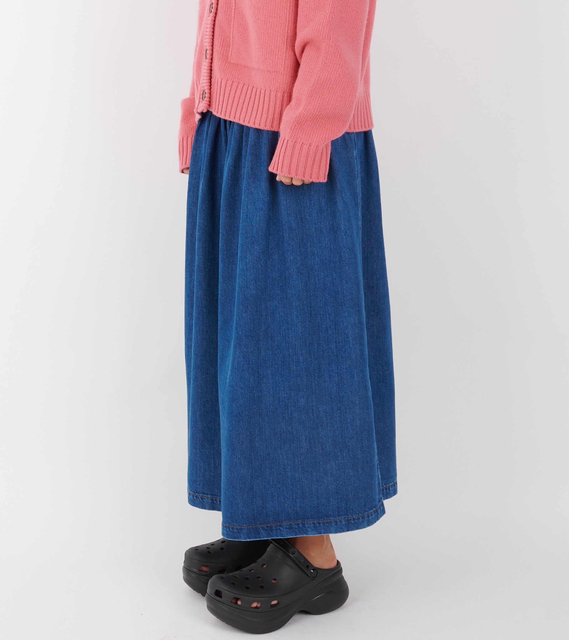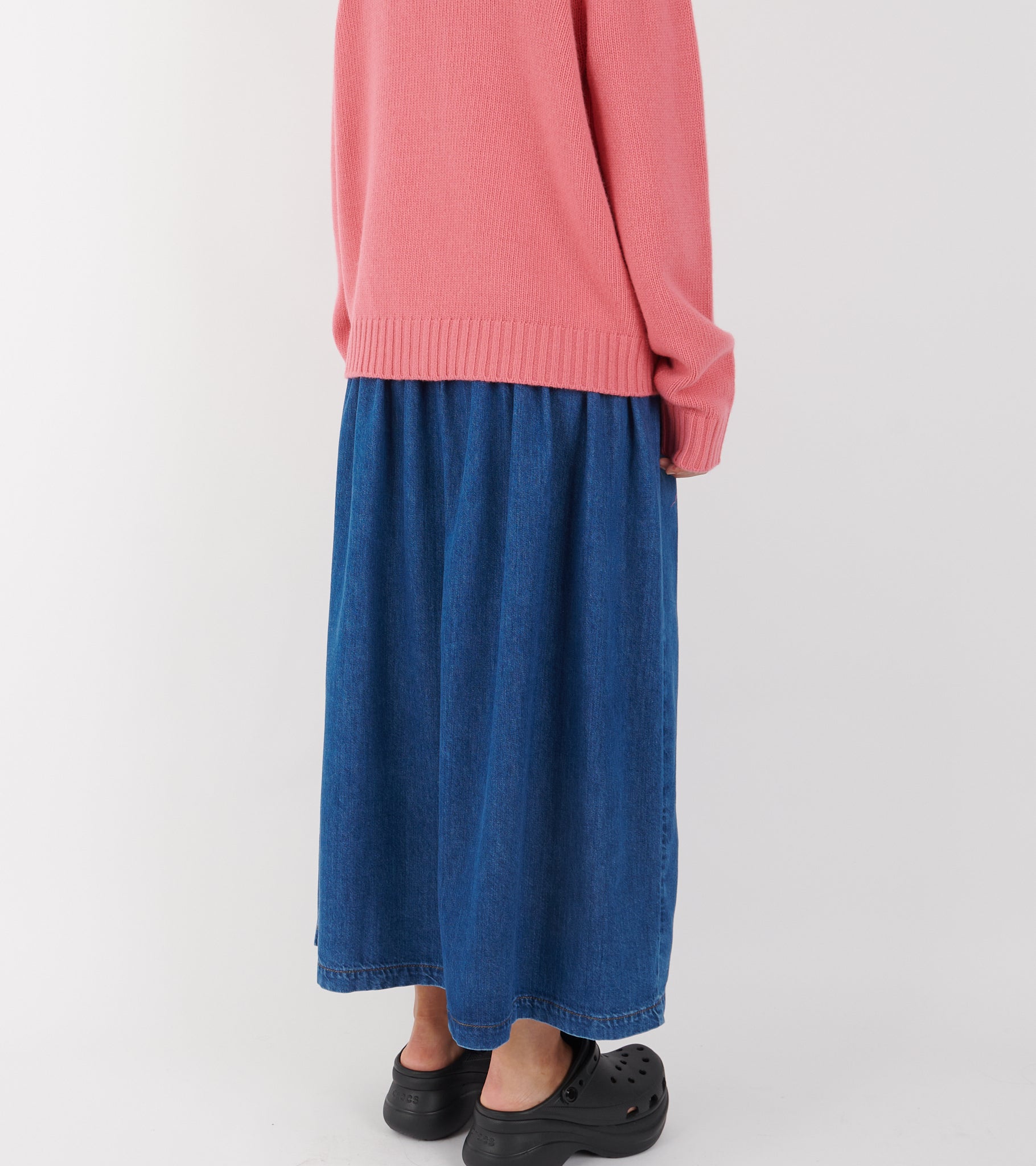 Skirt in organic cotton denim from Skall Studio. Dolly Skirt has a wide waistband with pleats and closes with three wooden buttons.